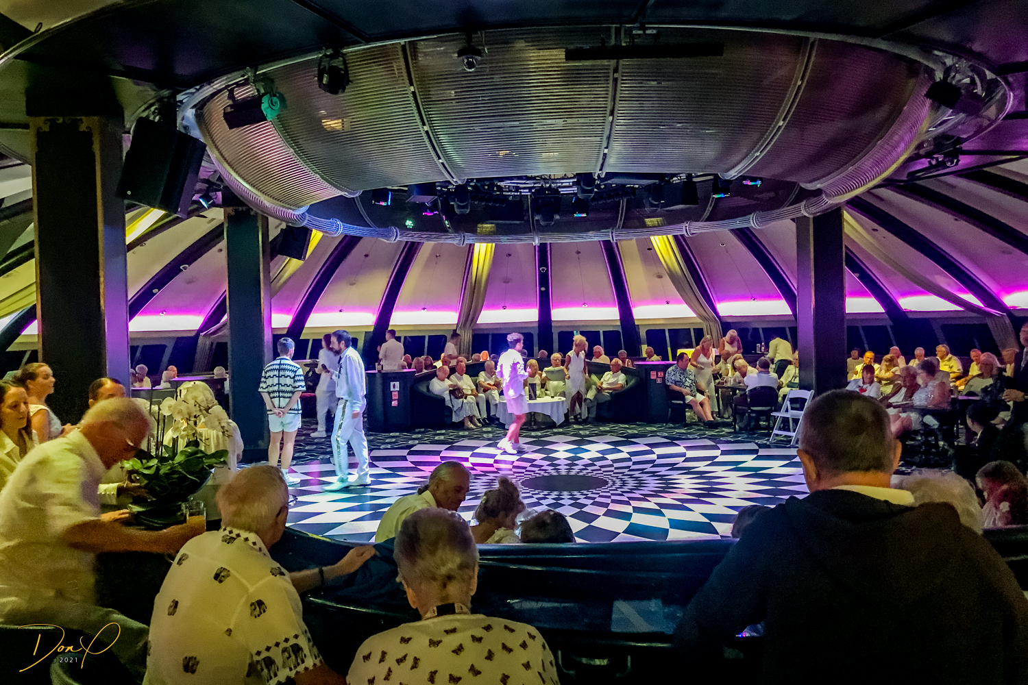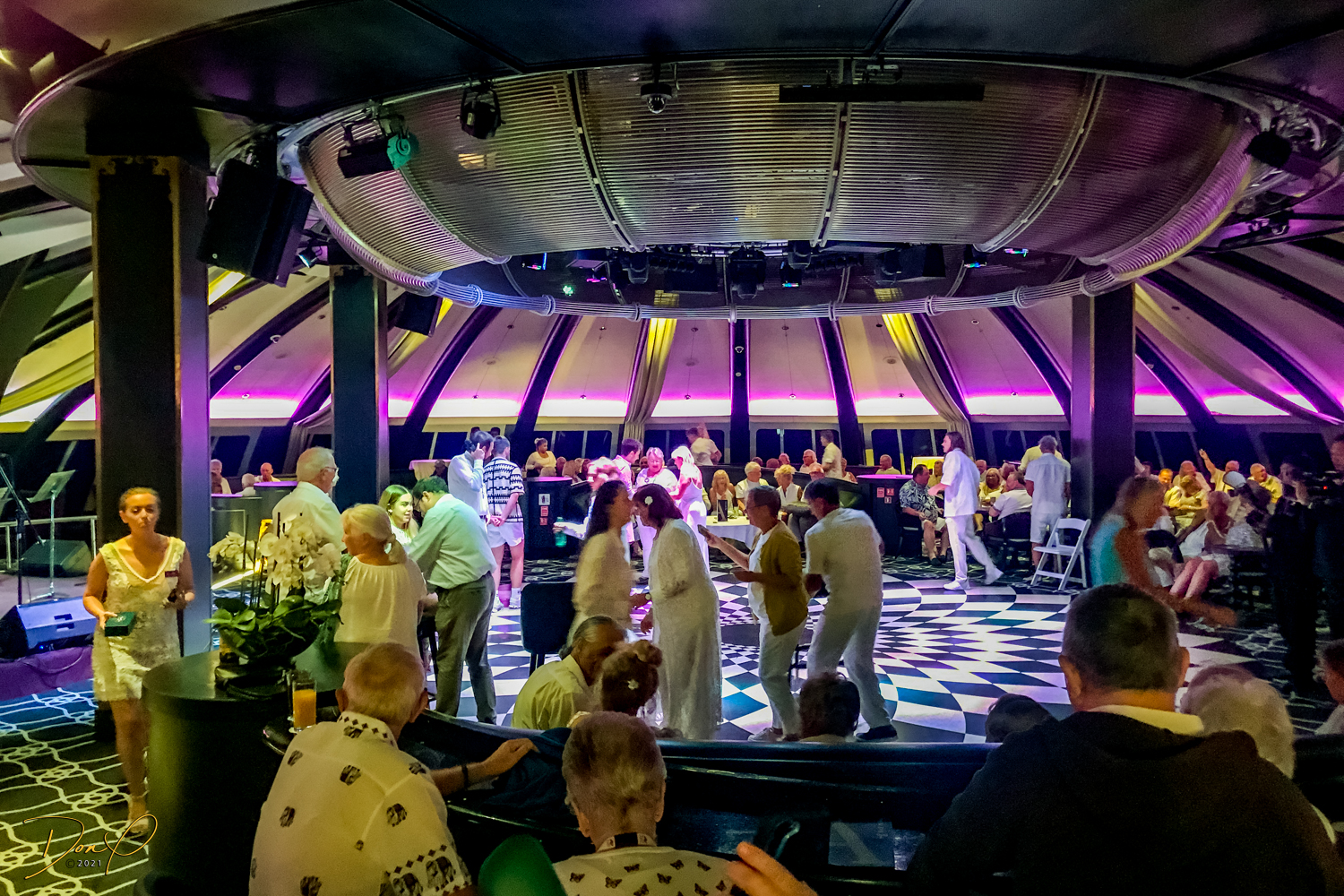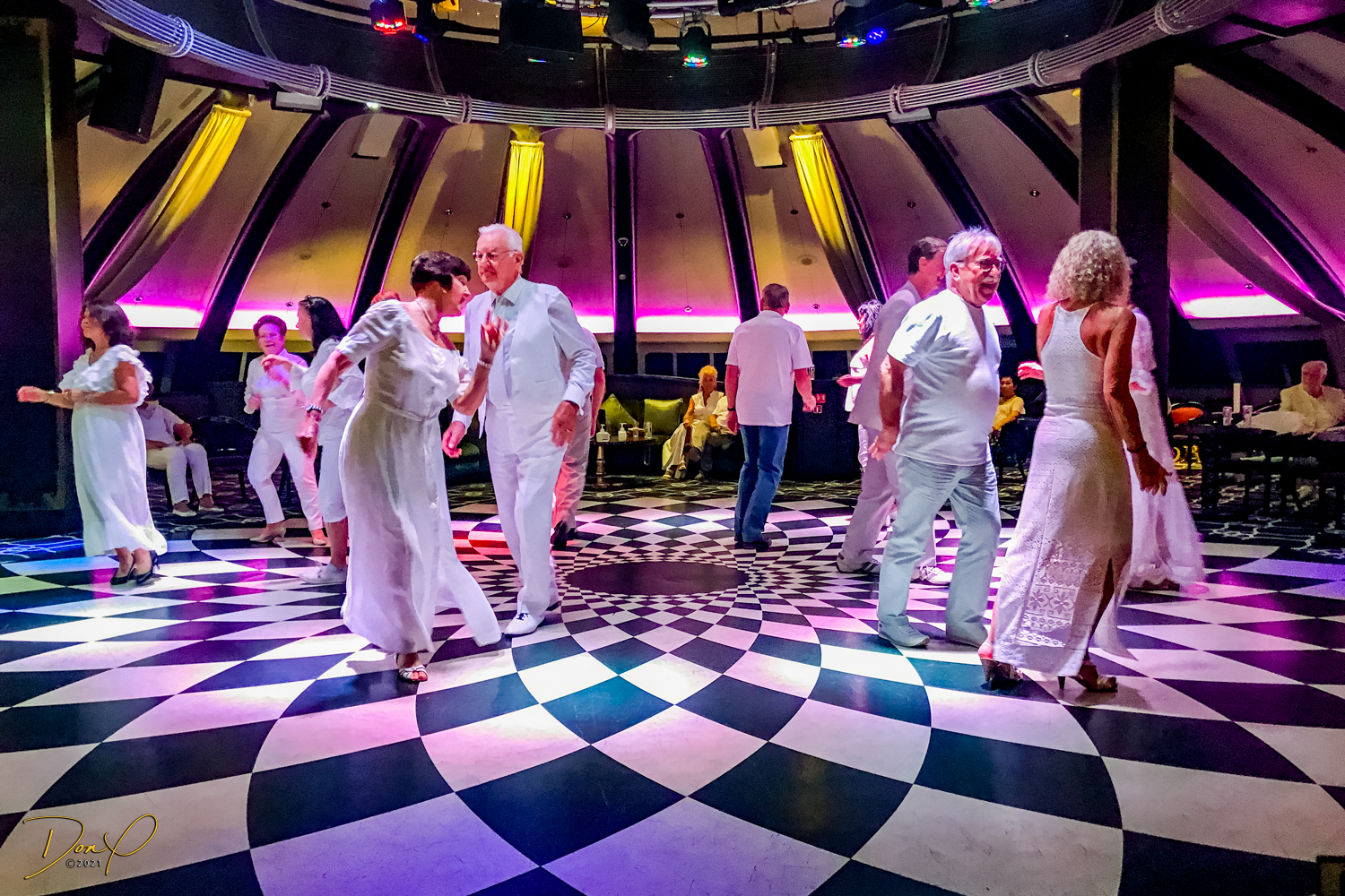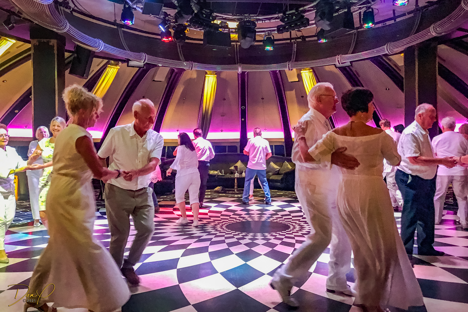 Today we have the White Party where everyone dresses in white. The party begins on Deck 12 outdoors and is a complete flop as it is windy and a little rainy! Finally, they move the party inside to the Observatory and it becomes a hit! Music and dancing galore! New found friends, Paul and Lynda McGregor dance the night away with us and the world is good!