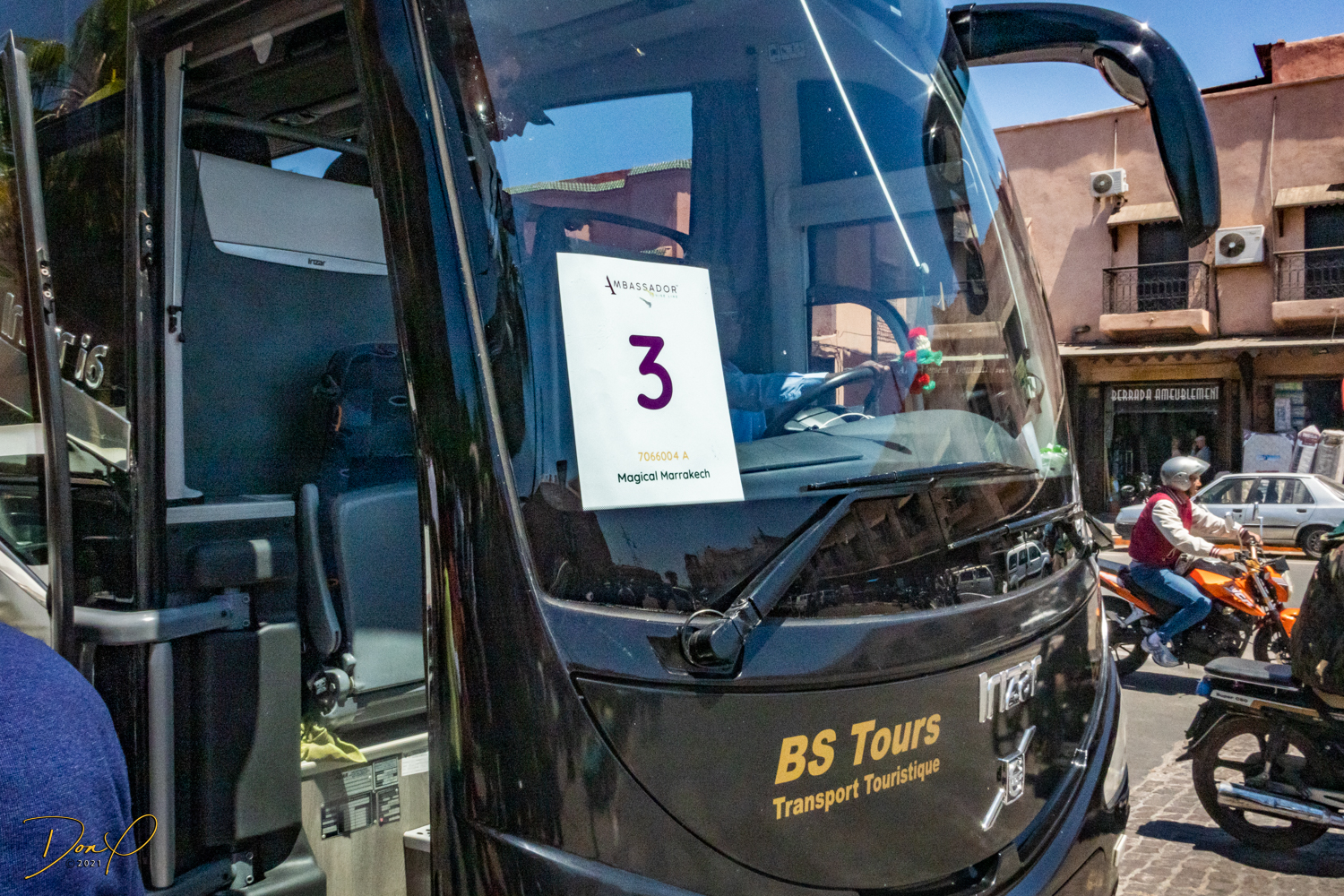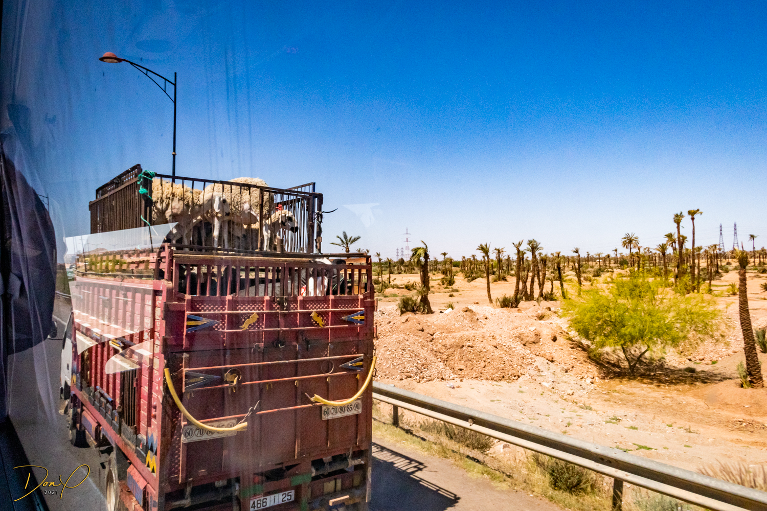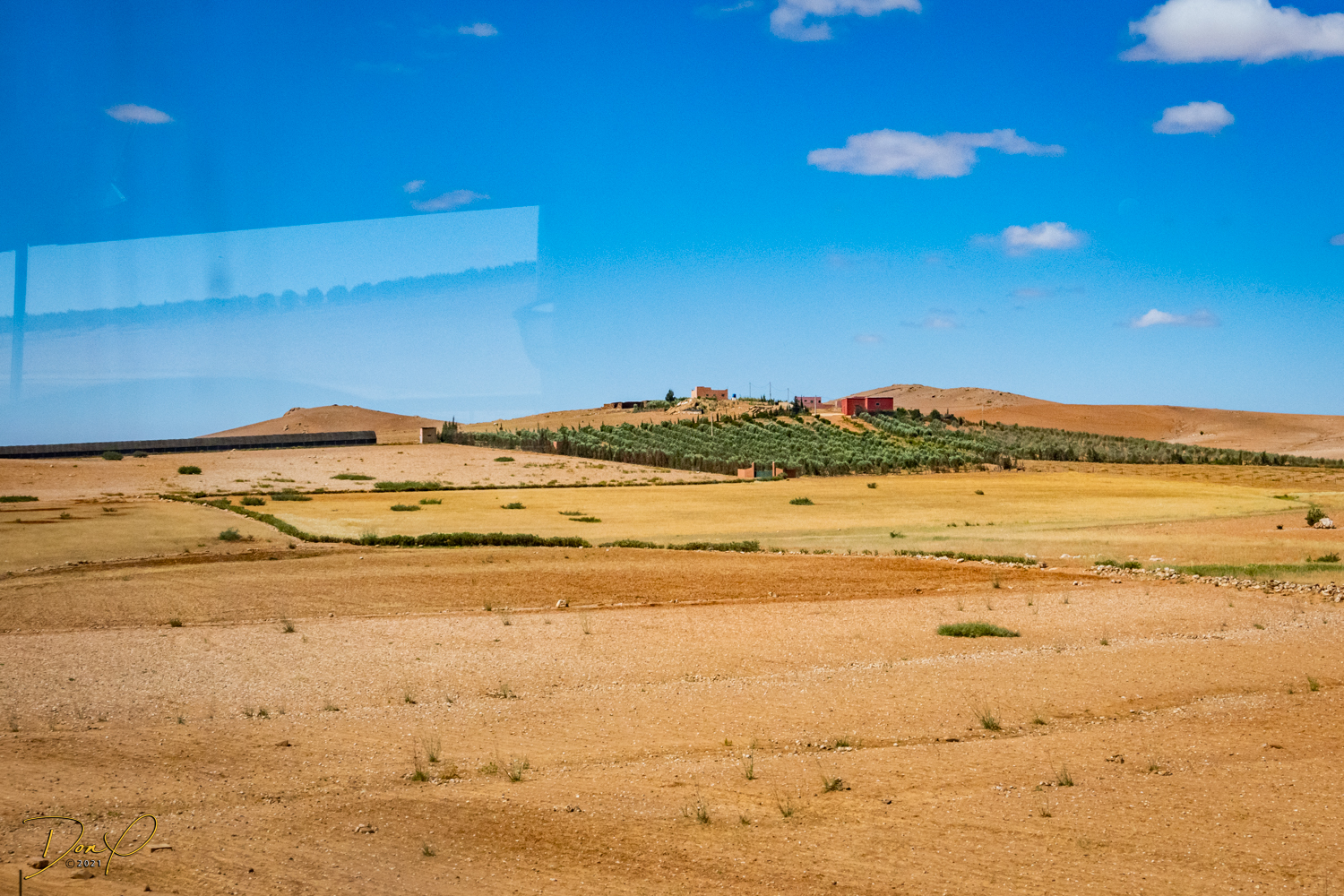 Now, for reference, we have a three to three and a half hour drive each way today. Marakesh is inland. We get to see Morocco and the farms of the Western Sahara Desert. Very interesting places indeed! Seems impossible that anything grows here but where they apply water, plants grow! The road is a toll road and in excellent condition. The bus is a modern luxury bus and is very comfortable. Sure glad we don’t have to read the road signs!