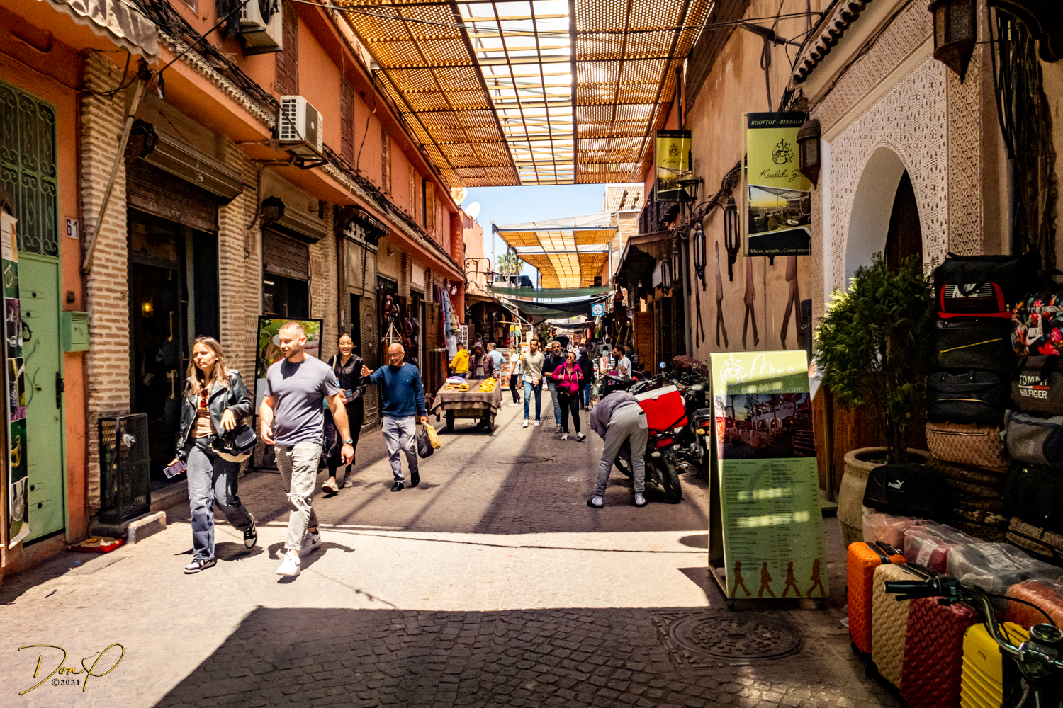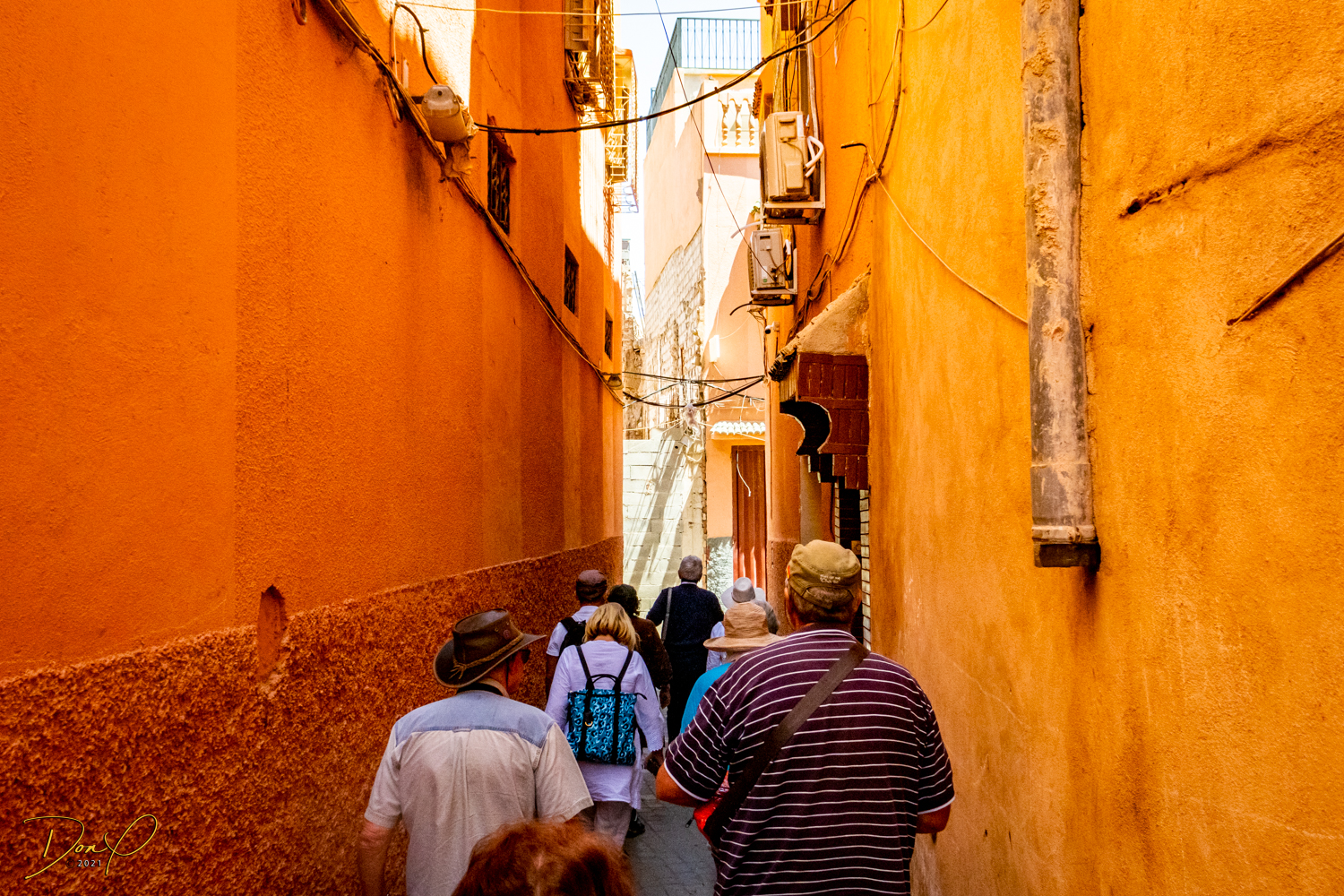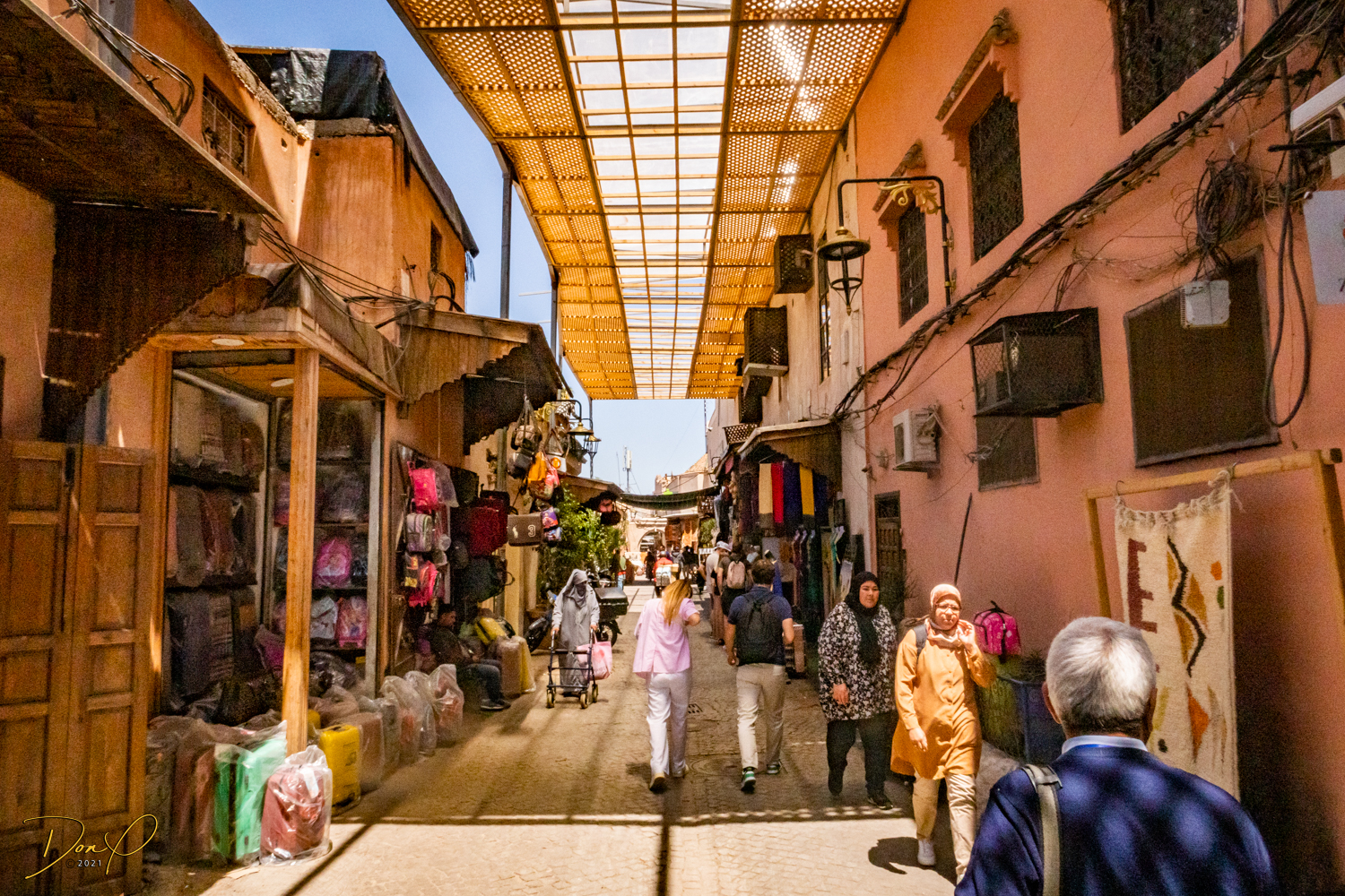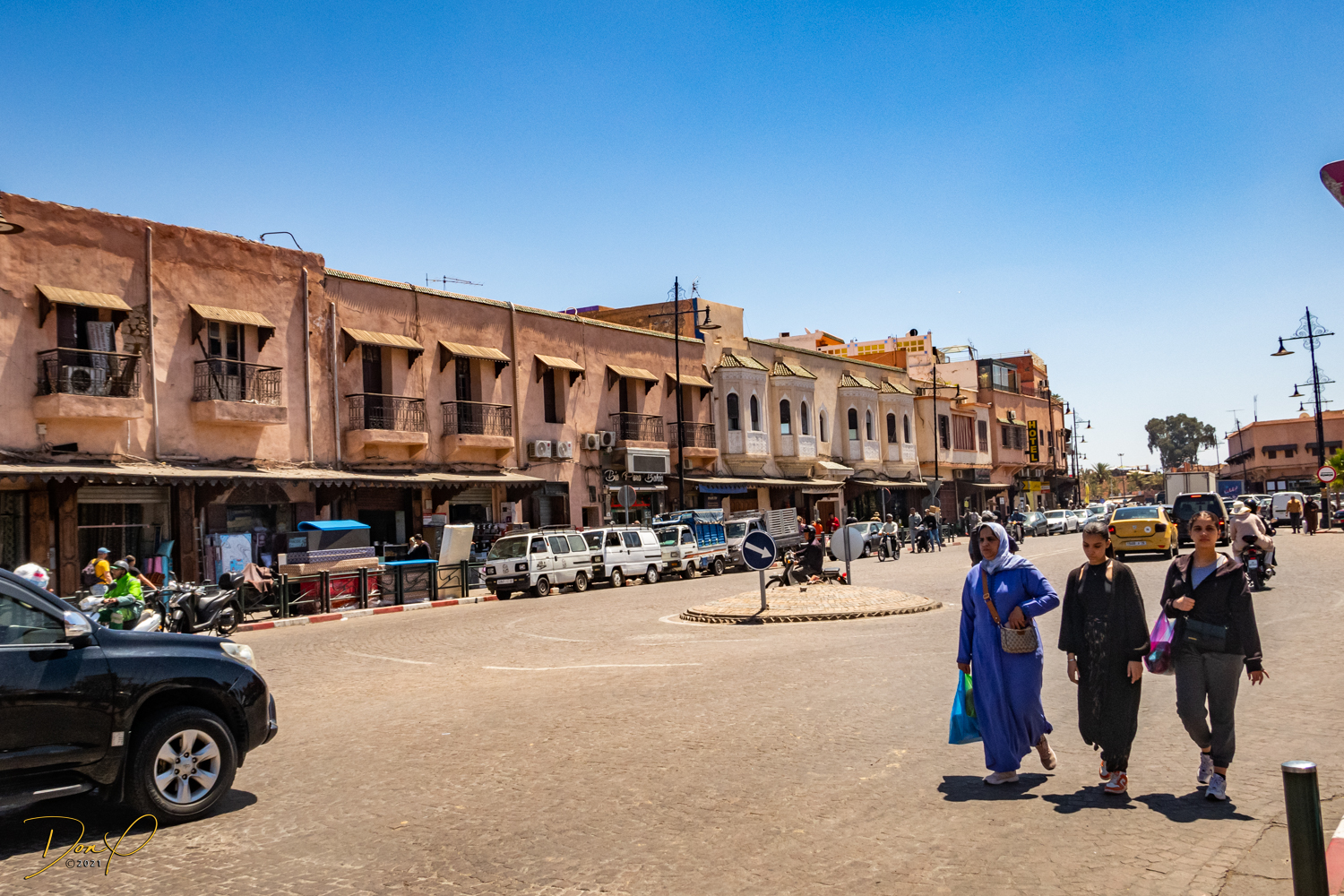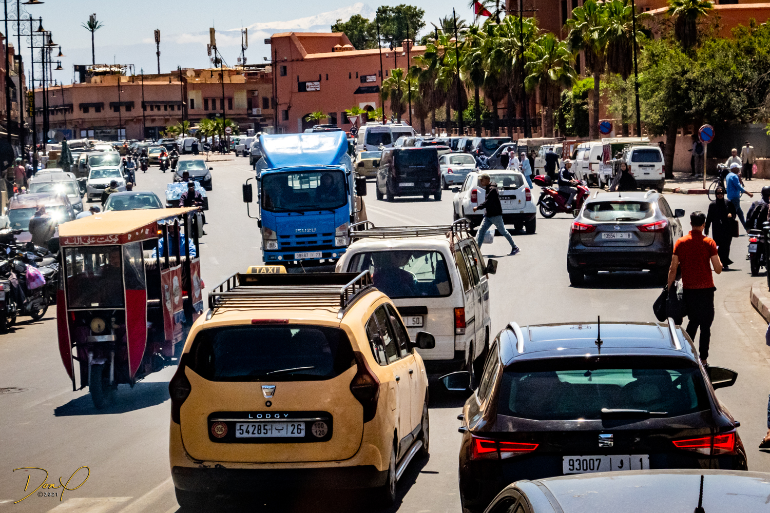We stop for a WC break (that would be Water Closet or Toilet) called a Winston Churchill by our guide, LOL. At the WC stop, there is a Mexican Food Truck, ‘Carmen’s’. Who’d have expected that here? Then it is only two more hours to Marakesh. More farms and desert scenery and then we arrive at buildings and more buildings. Soon, the hustle and bustle of throngs of people slow our bus to a crawl. We disembark the bus and are told to make sure we have what we need for several hours because we won’t see the bus again until it’s time to return to Casablanca.