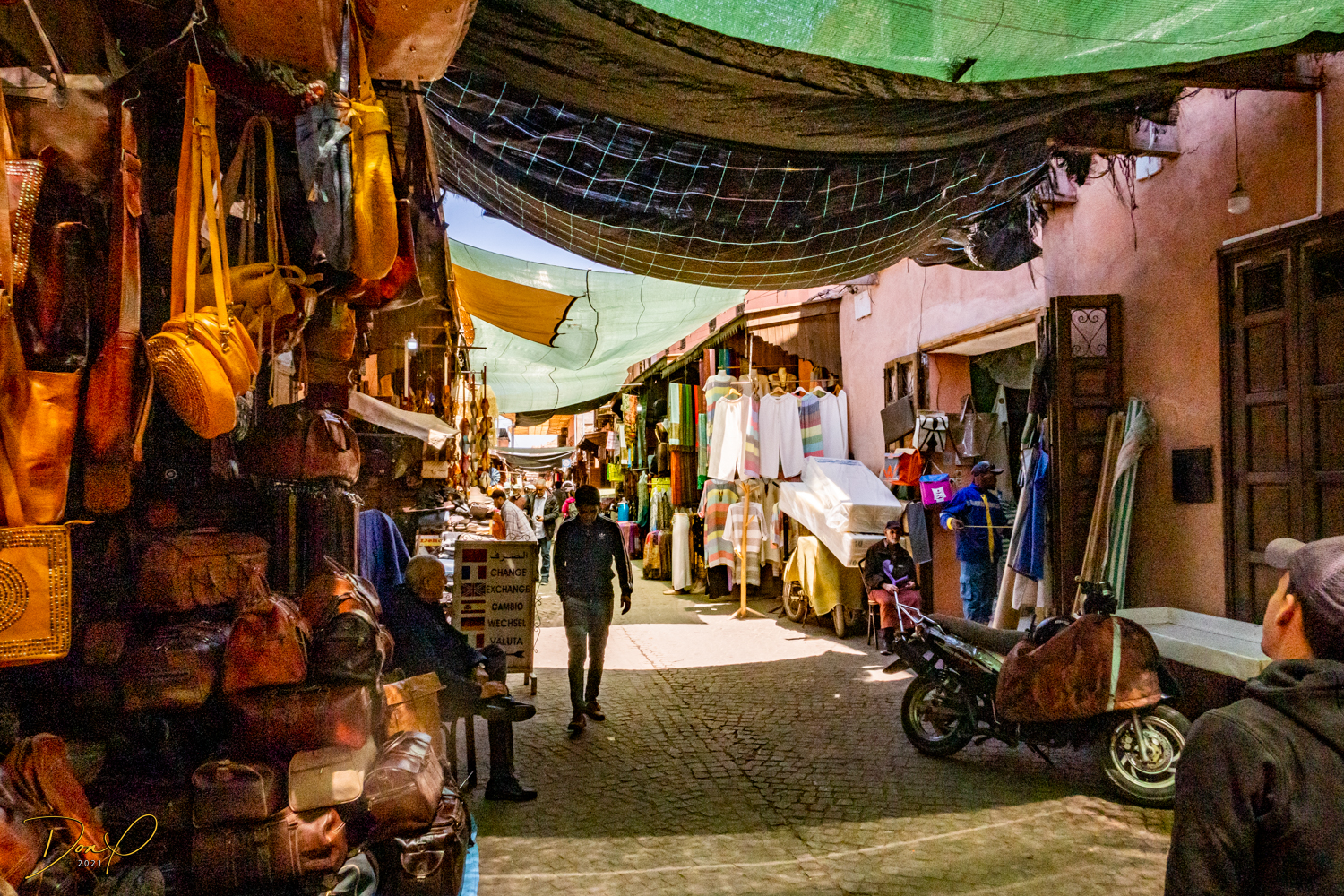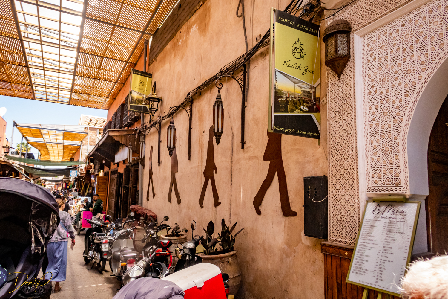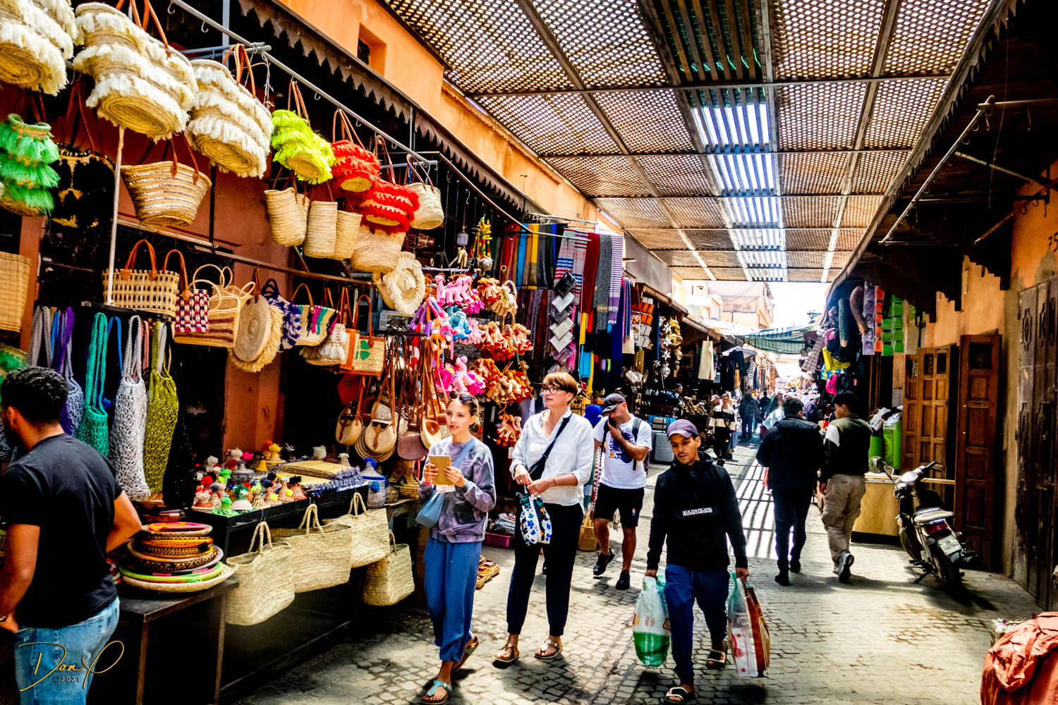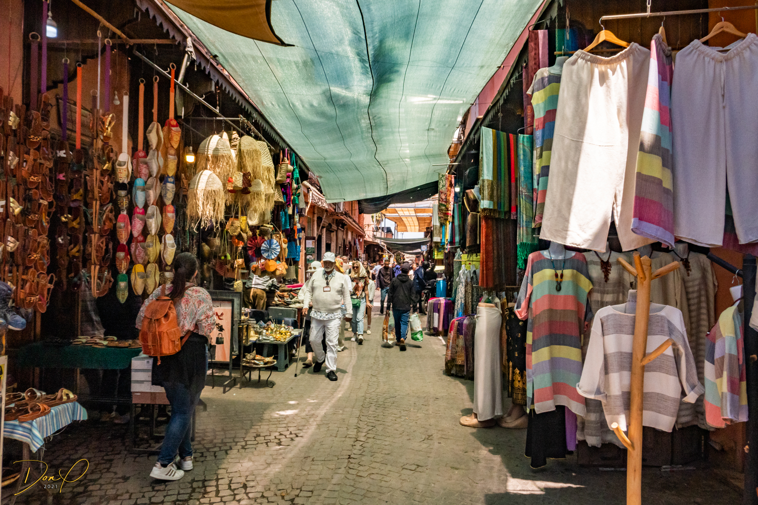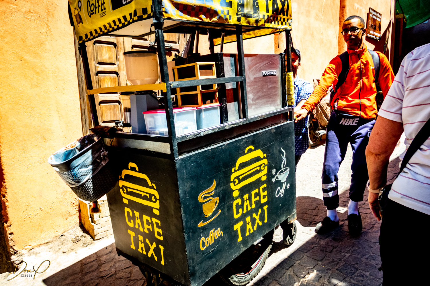 We stop for a WC break (that would be Water Closet or Toilet) called a Winston Churchill by our guide, LOL. At the WC stop, there is a Mexican Food Truck, ‘Carmen’s’. Who’d have expected that here? Then it is only two more hours to Marakesh. More farms and desert scenery and then we arrive at buildings and more buildings. Soon, the hustle and bustle of throngs of people slow our bus to a crawl. We disembark the bus and are told to make sure we have what we need for several hours because we won’t see the bus again until it’s time to return to Casablanca.