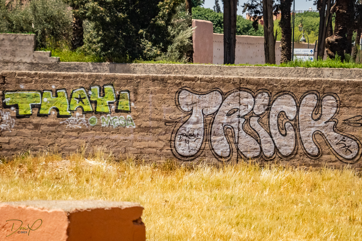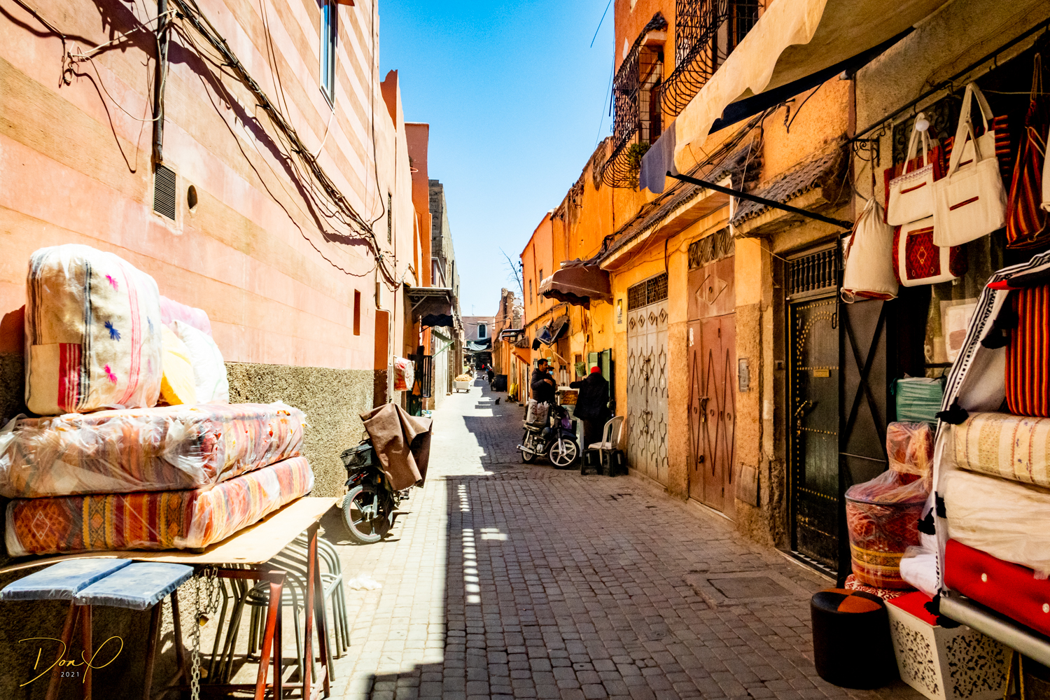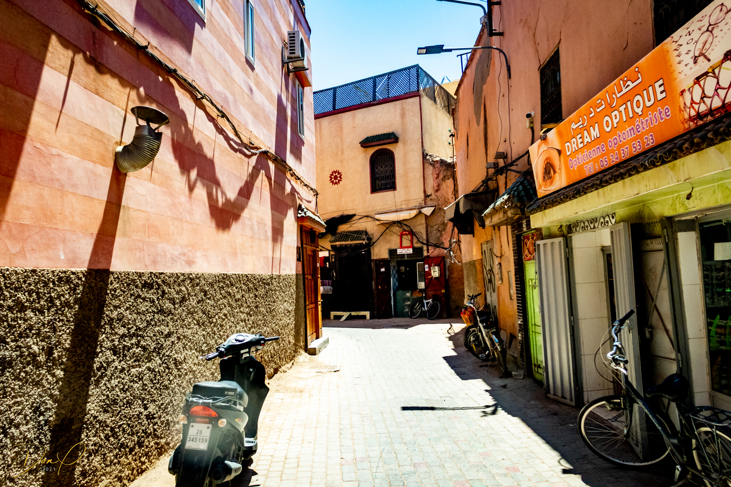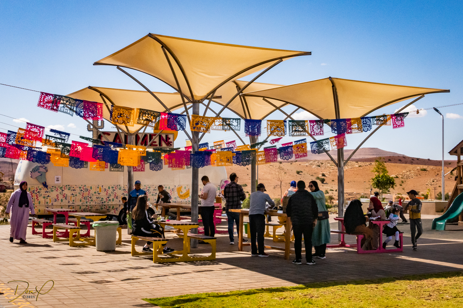 We stop for a WC break (that would be Water Closet or Toilet) called a Winston Churchill by our guide, LOL. At the WC stop, there is a Mexican Food Truck, ‘Carmen’s’. Who’d have expected that here? Then it is only two more hours to Marakesh. More farms and desert scenery and then we arrive at buildings and more buildings. Soon, the hustle and bustle of throngs of people slow our bus to a crawl. We disembark the bus and are told to make sure we have what we need for several hours because we won’t see the bus again until it’s time to return to Casablanca.