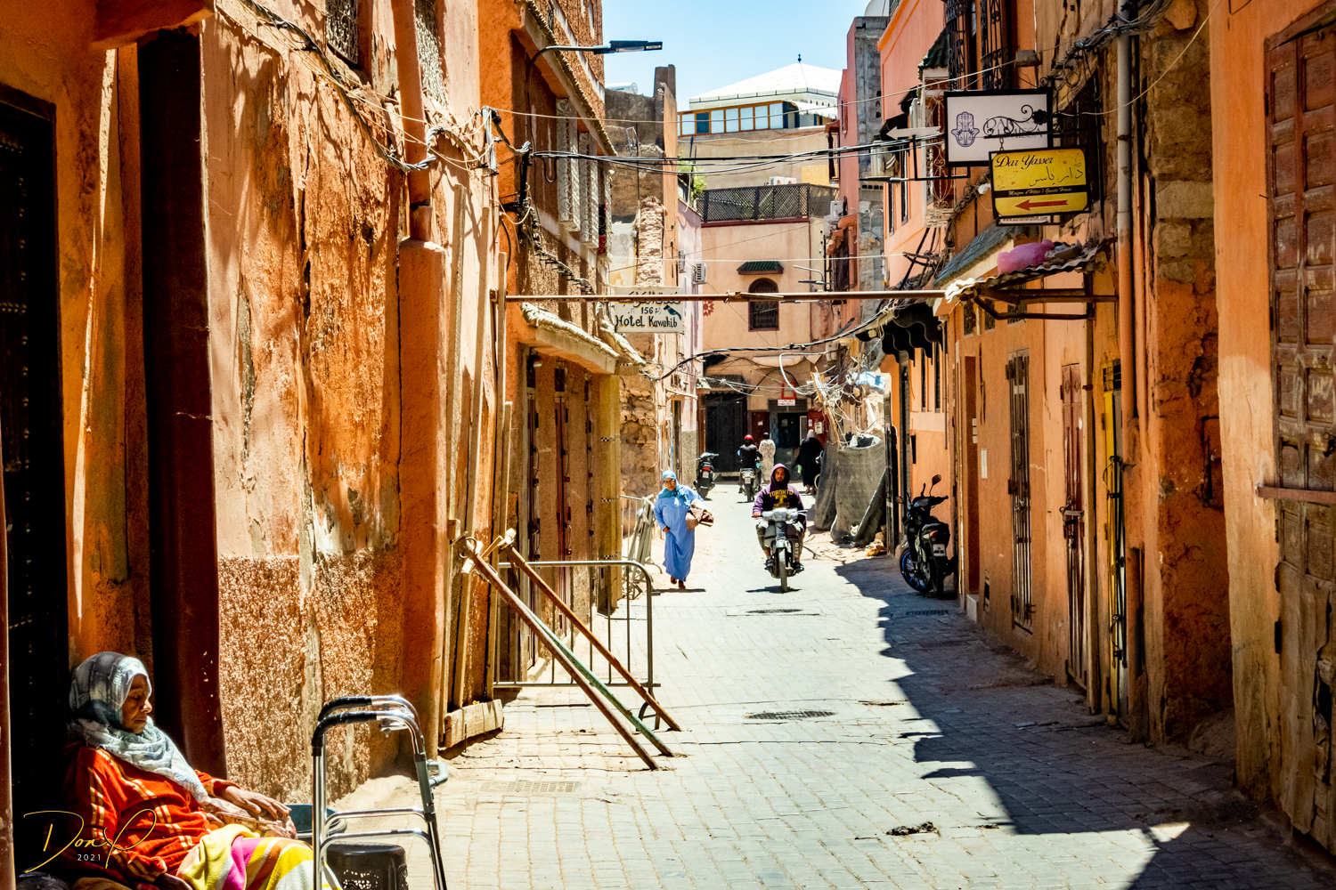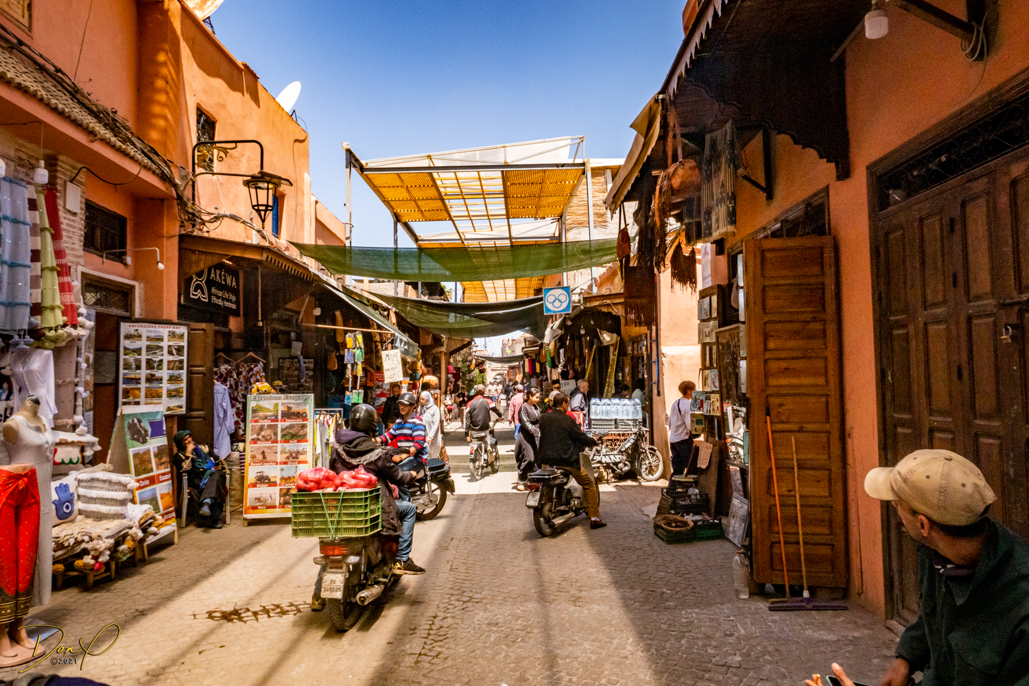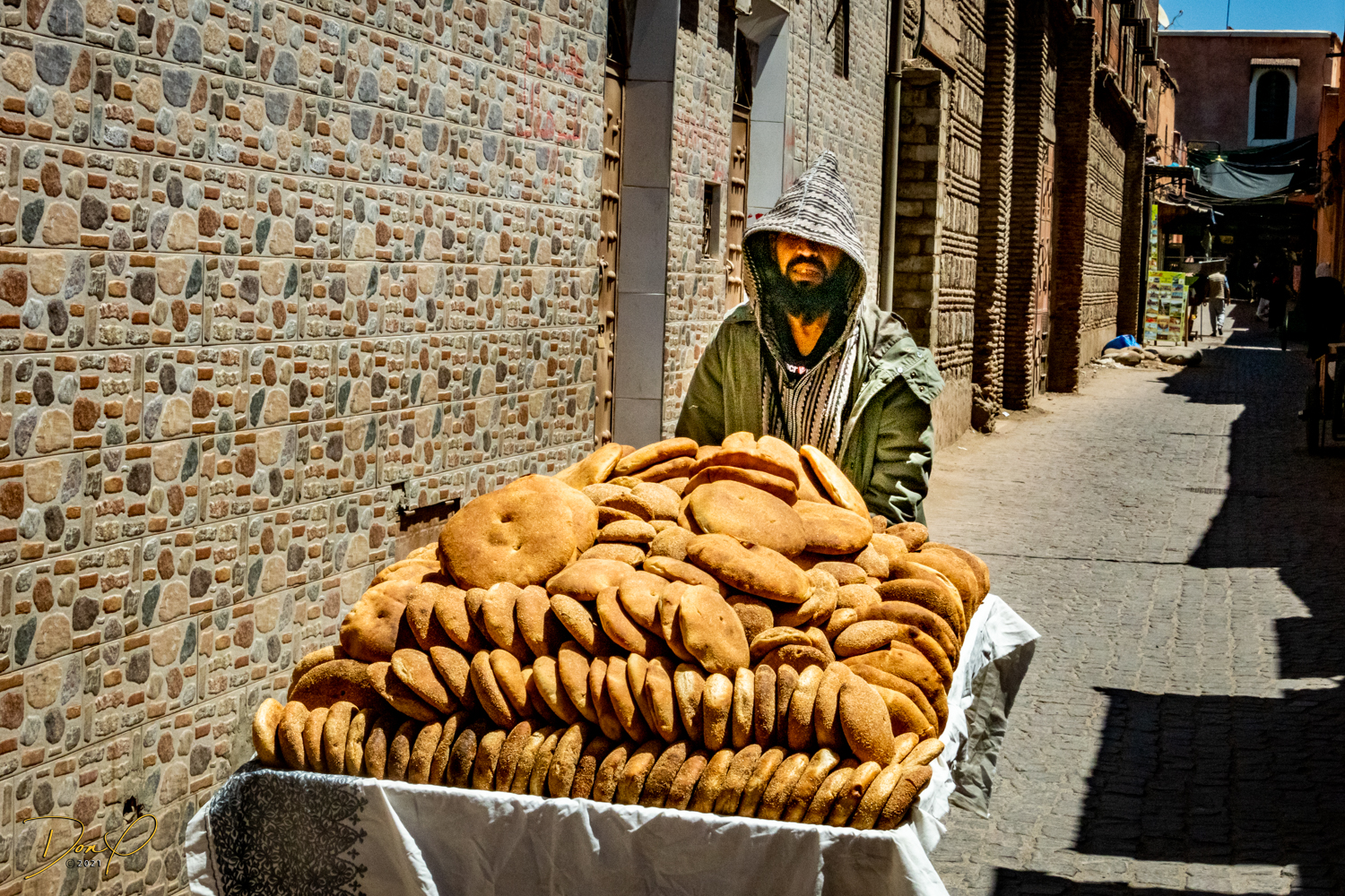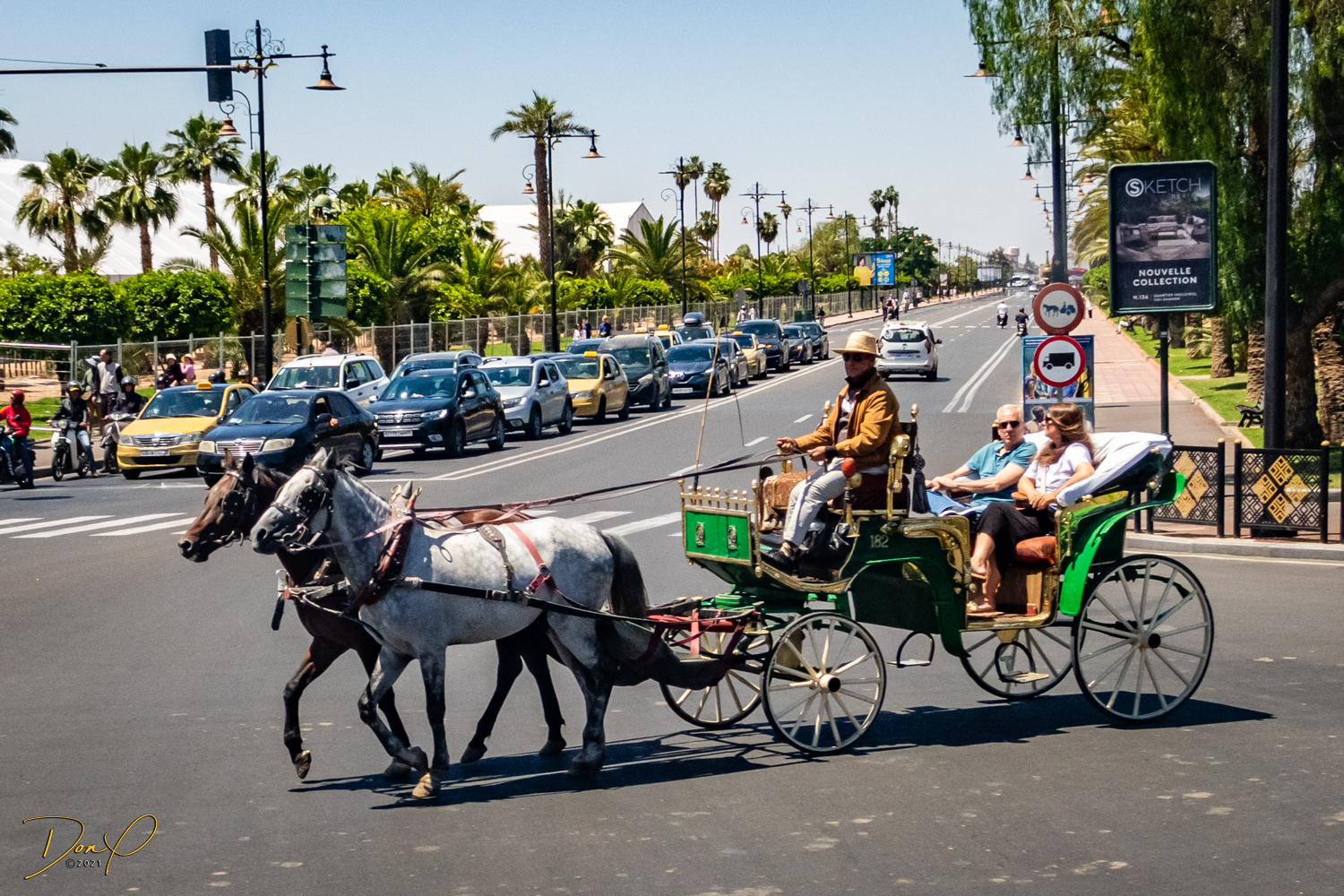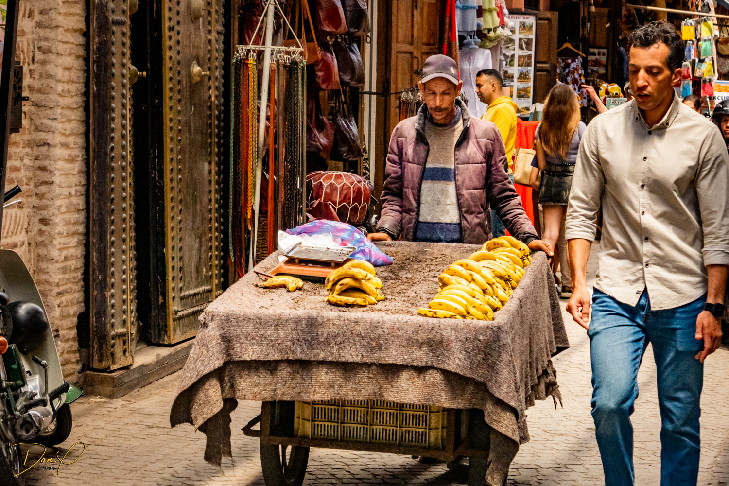 We stop for a WC break (that would be Water Closet or Toilet) called a Winston Churchill by our guide, LOL. At the WC stop, there is a Mexican Food Truck, ‘Carmen’s’. Who’d have expected that here? Then it is only two more hours to Marakesh. More farms and desert scenery and then we arrive at buildings and more buildings. Soon, the hustle and bustle of throngs of people slow our bus to a crawl. We disembark the bus and are told to make sure we have what we need for several hours because we won’t see the bus again until it’s time to return to Casablanca.