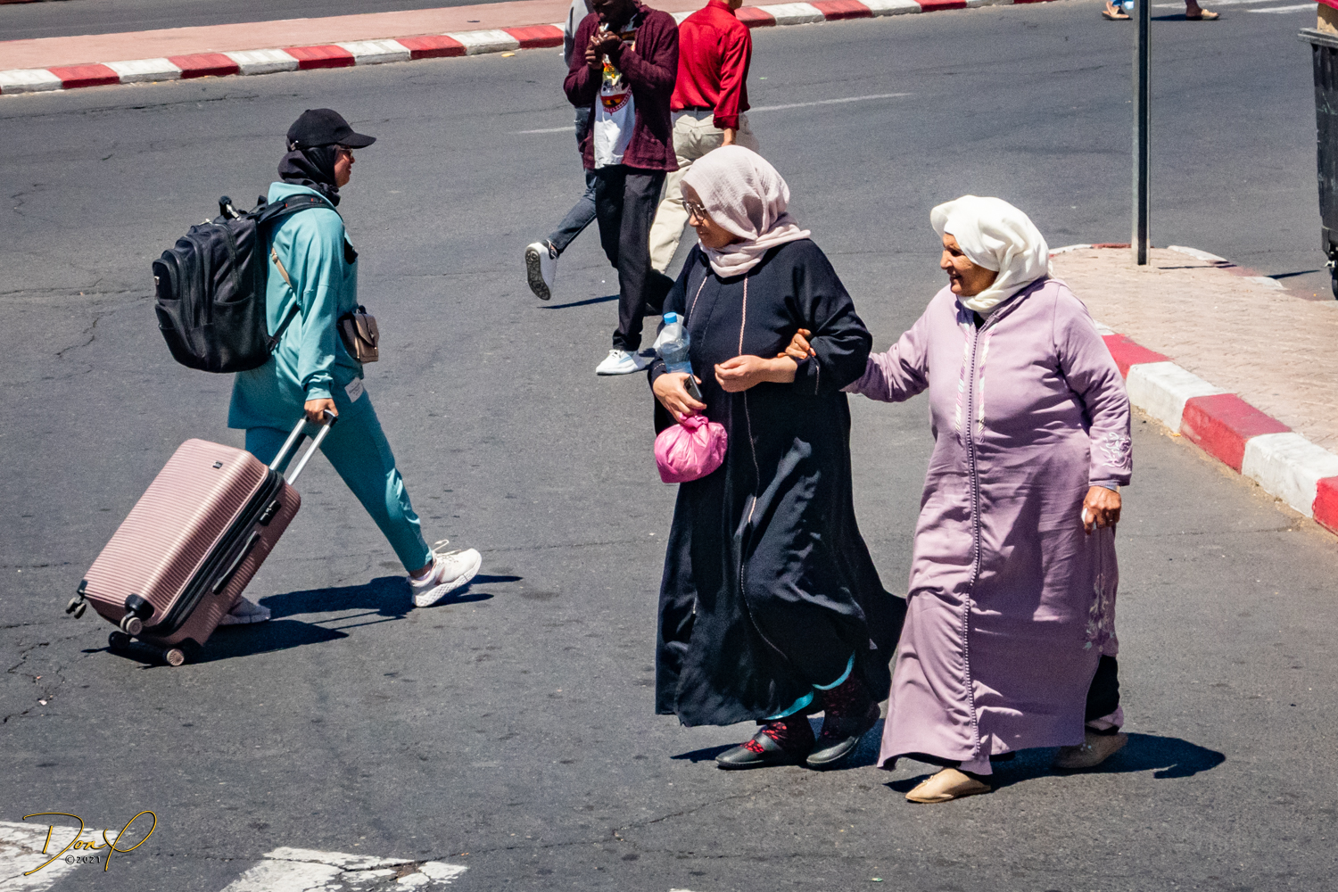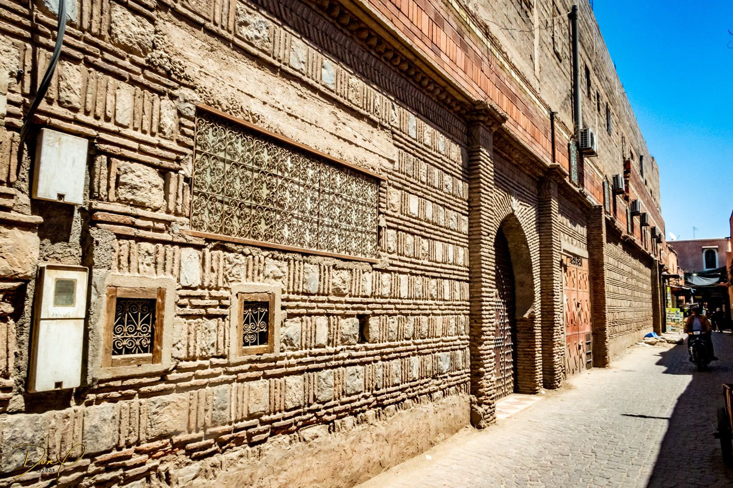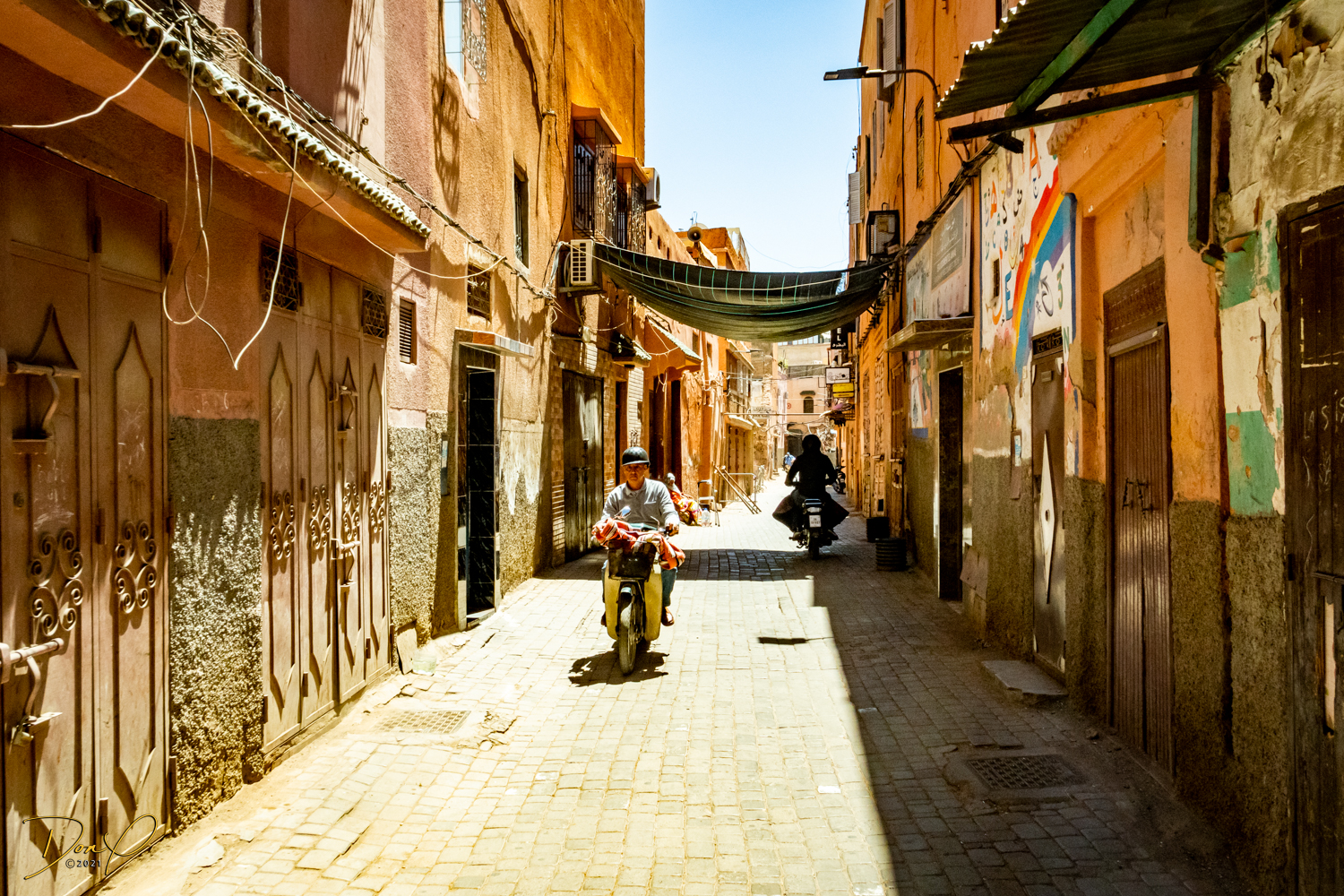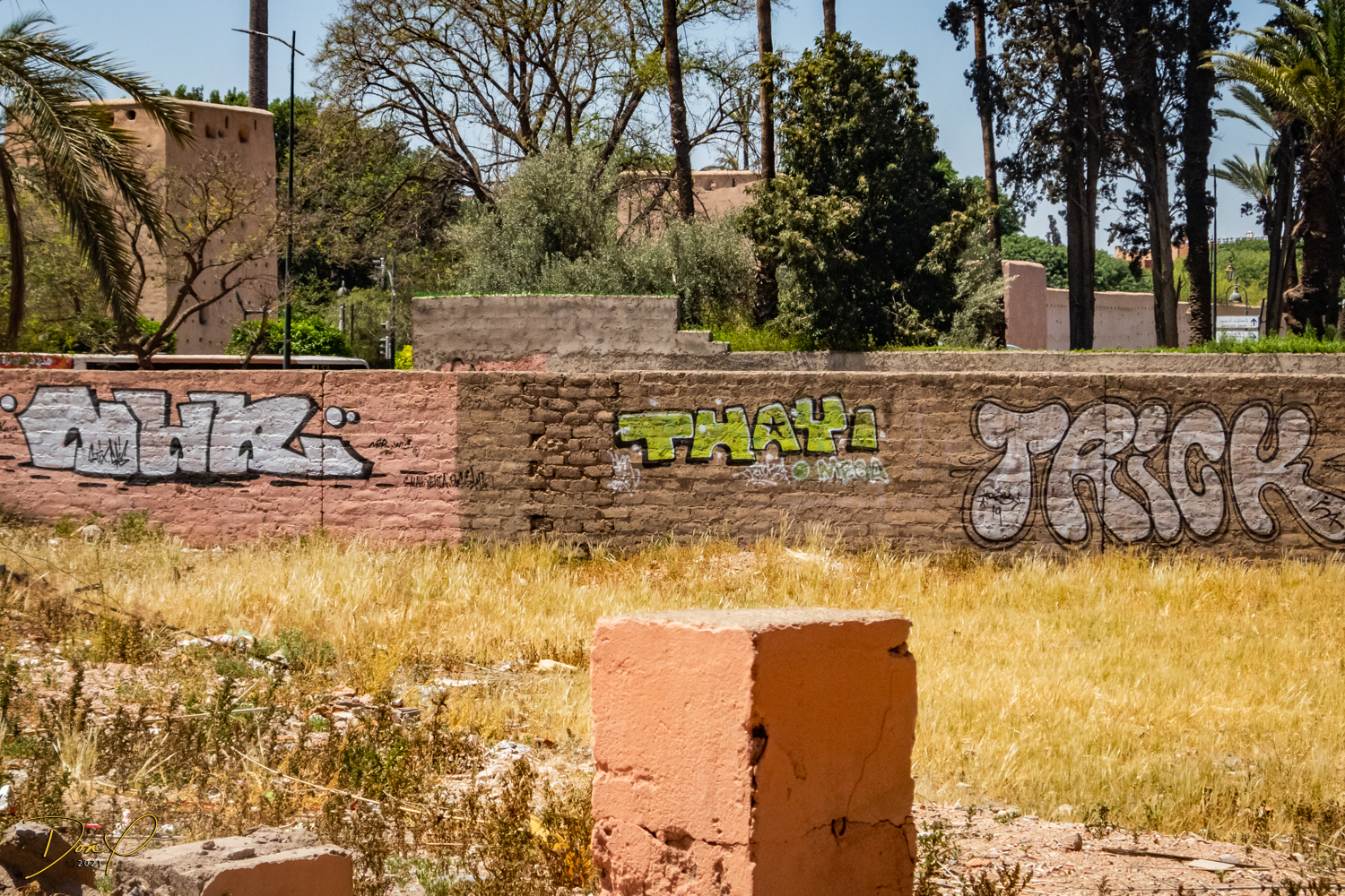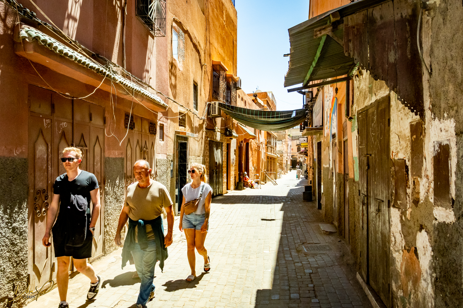 We stop for a WC break (that would be Water Closet or Toilet) called a Winston Churchill by our guide, LOL. At the WC stop, there is a Mexican Food Truck, ‘Carmen’s’. Who’d have expected that here? Then it is only two more hours to Marakesh. More farms and desert scenery and then we arrive at buildings and more buildings. Soon, the hustle and bustle of throngs of people slow our bus to a crawl. We disembark the bus and are told to make sure we have what we need for several hours because we won’t see the bus again until it’s time to return to Casablanca.