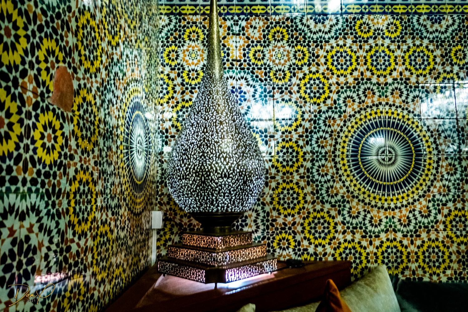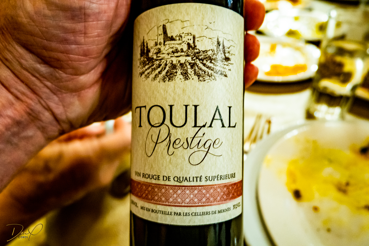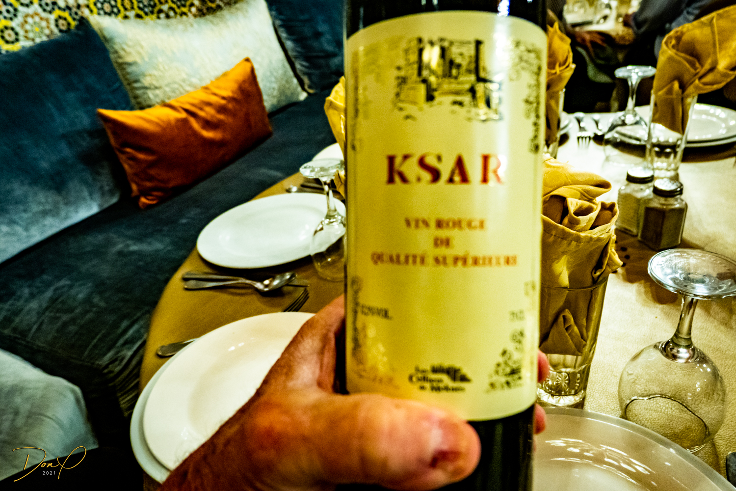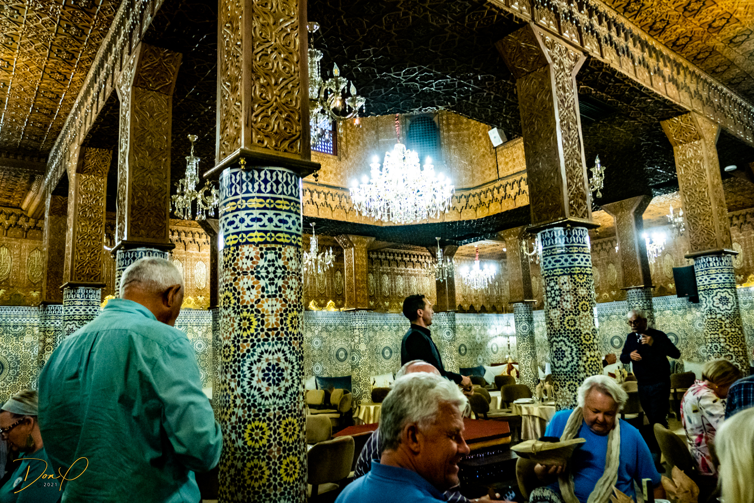 It is now close to 1PM and it is time for lunch. Our guide leads us through narrow alleys and by many shops to a doorway where we enter and it opens into a very large restaurant room. We sit at tables around the sides and Moroccan breads are served along with plates full of spreads for the bread. Spreads of Aubergine (Also called Zaalouk (eggplant)) and many other spreads are served to us. There is wine on the tables that we partake of.