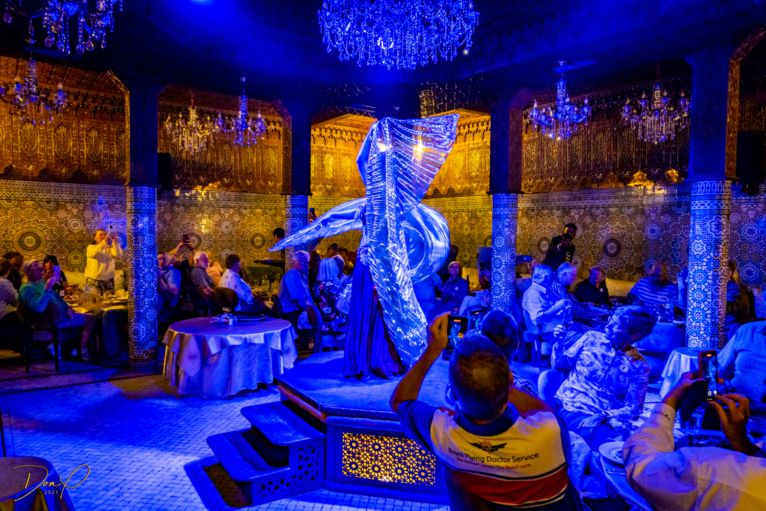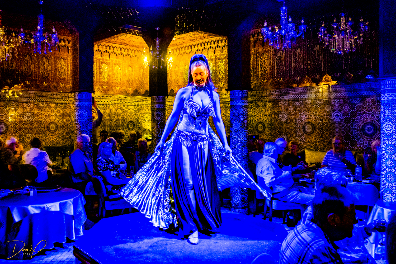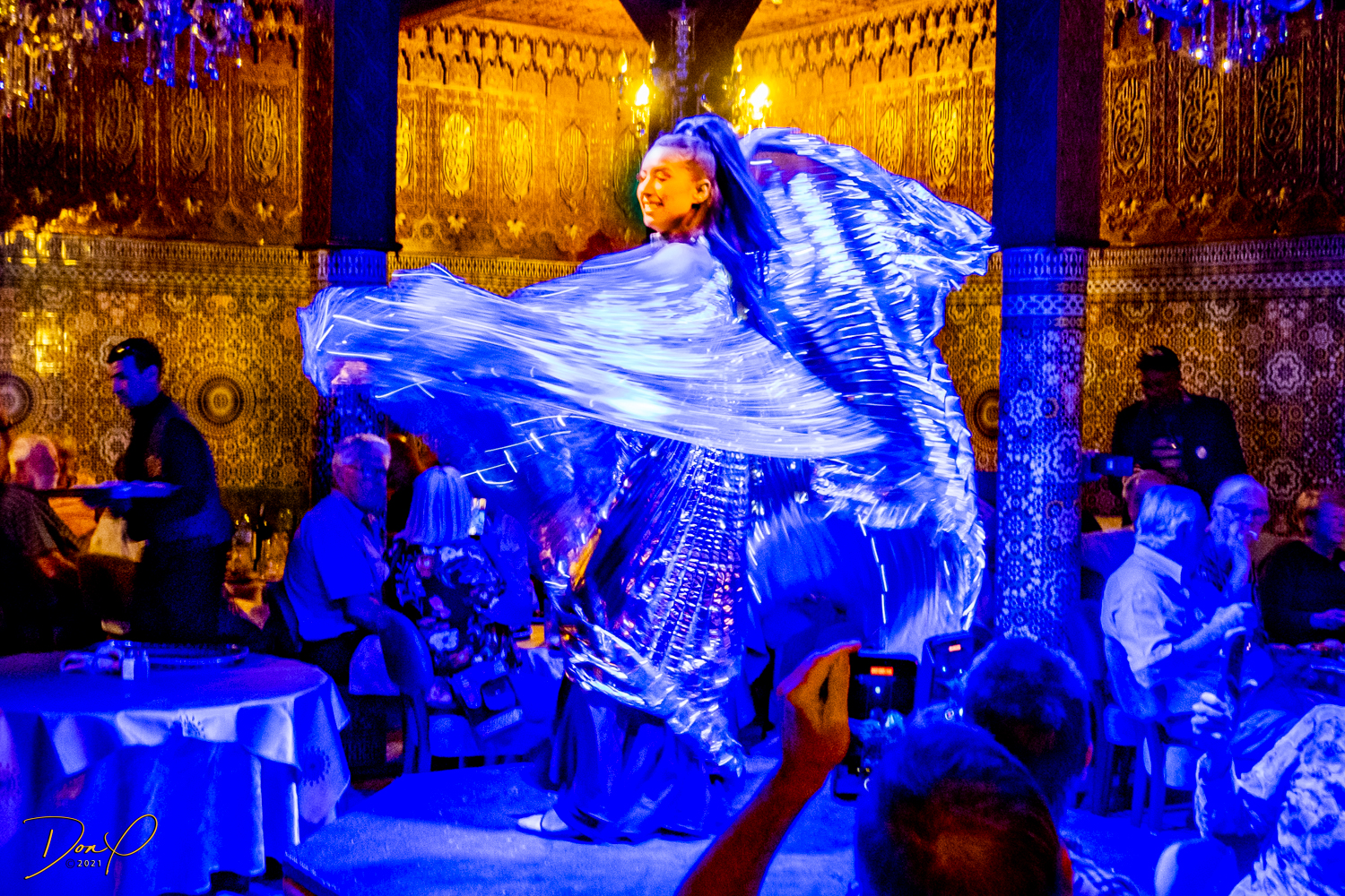 Then, large tagines of chicken and lamb arrive with sauces both spicy and mild. The food is fabulous and our table soon polishes off the food. Then a large woman comes out dancing to the Moroccan music and she is balancing a large plate on her head that is about a yard (meter) across and on it are lit candles in a chandelier formation. She dances and the candles flicker but not once does the chandelier falter or fall.