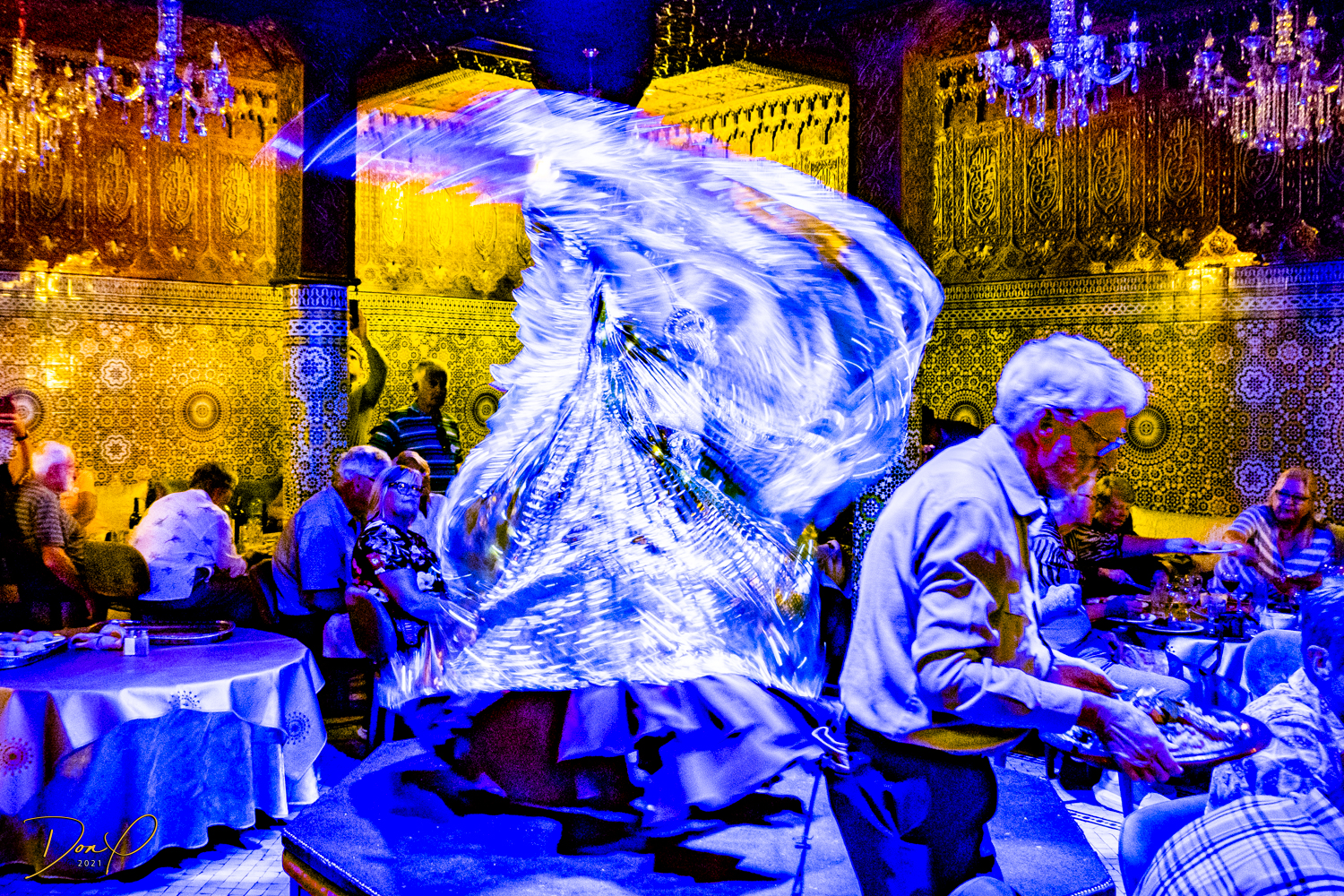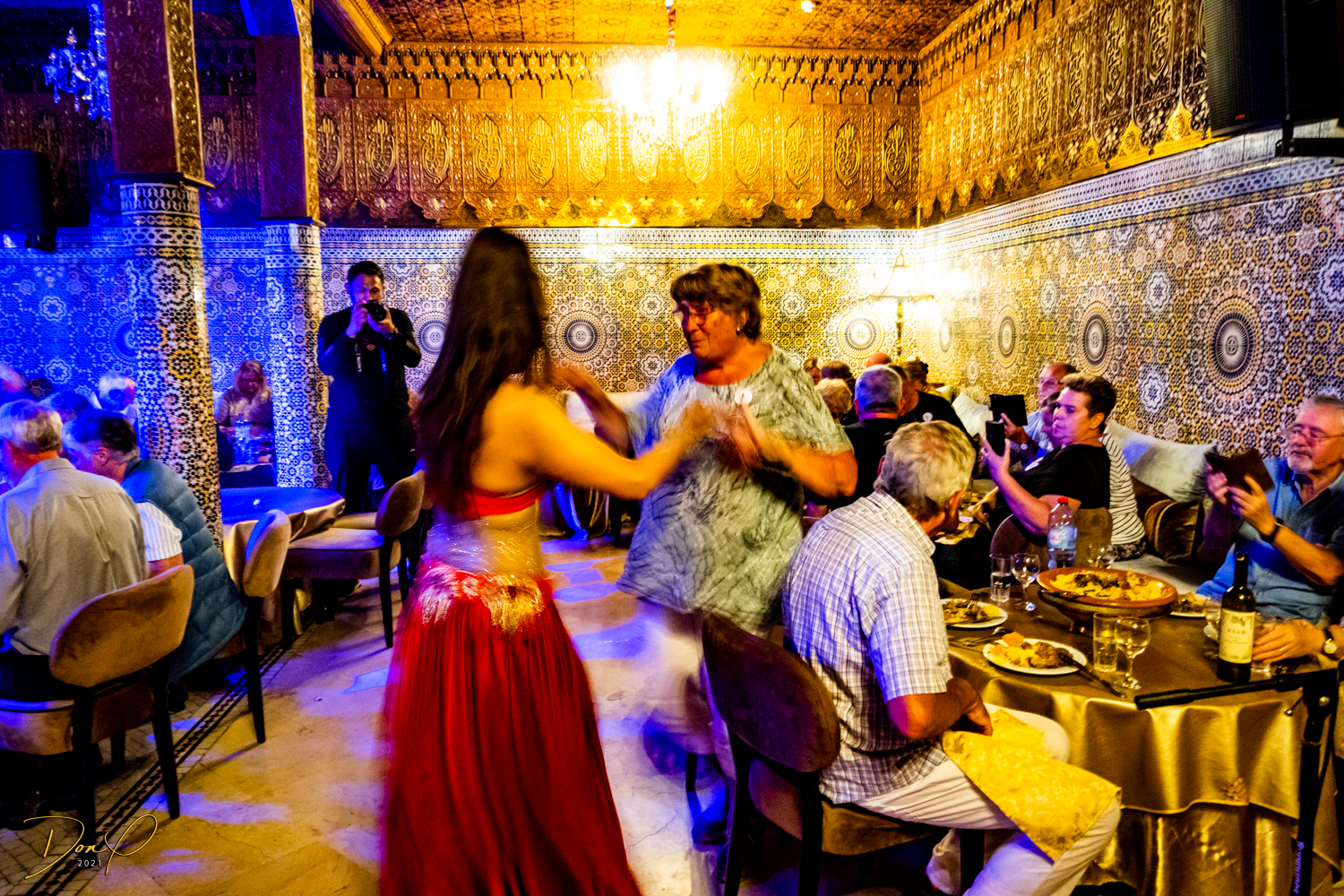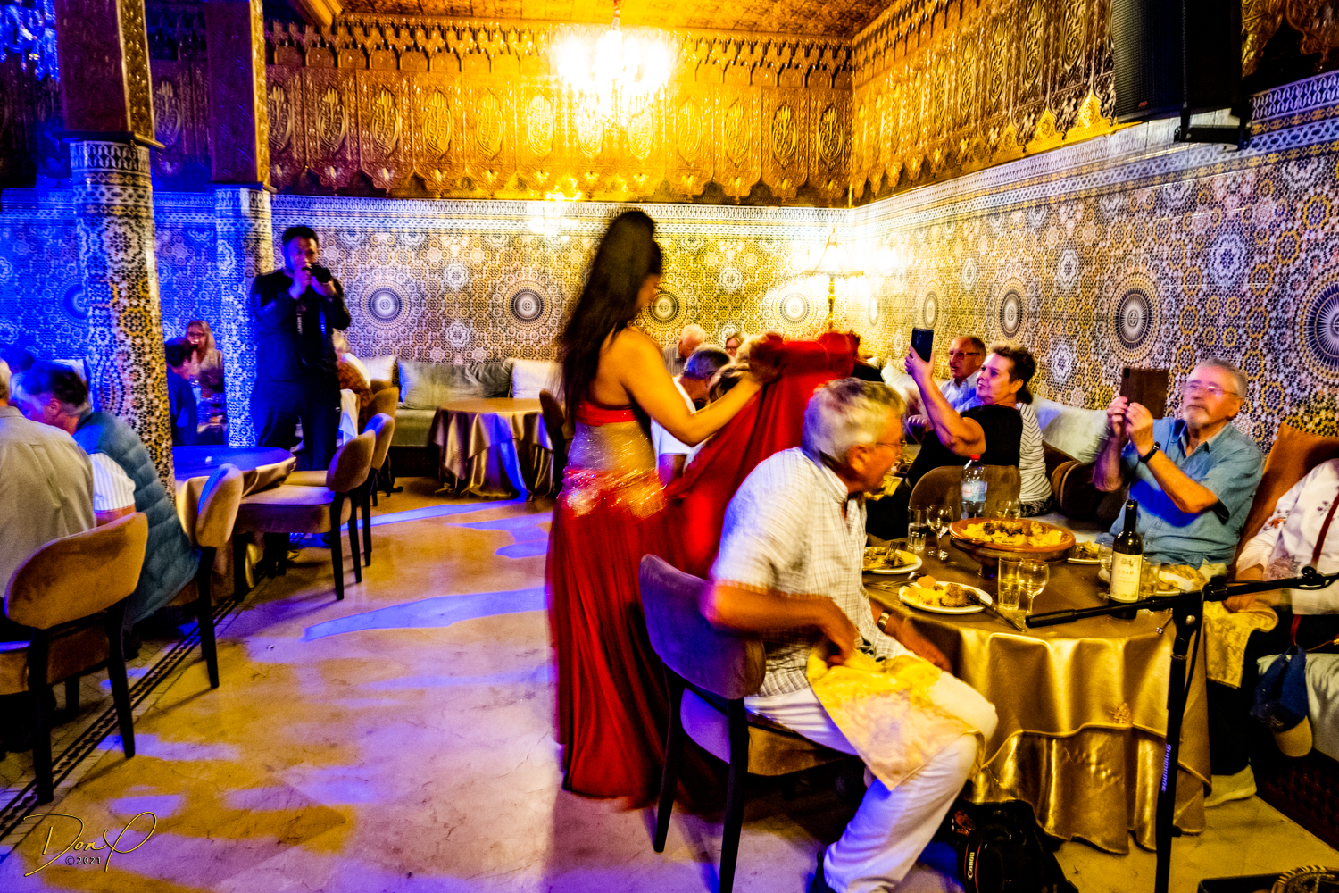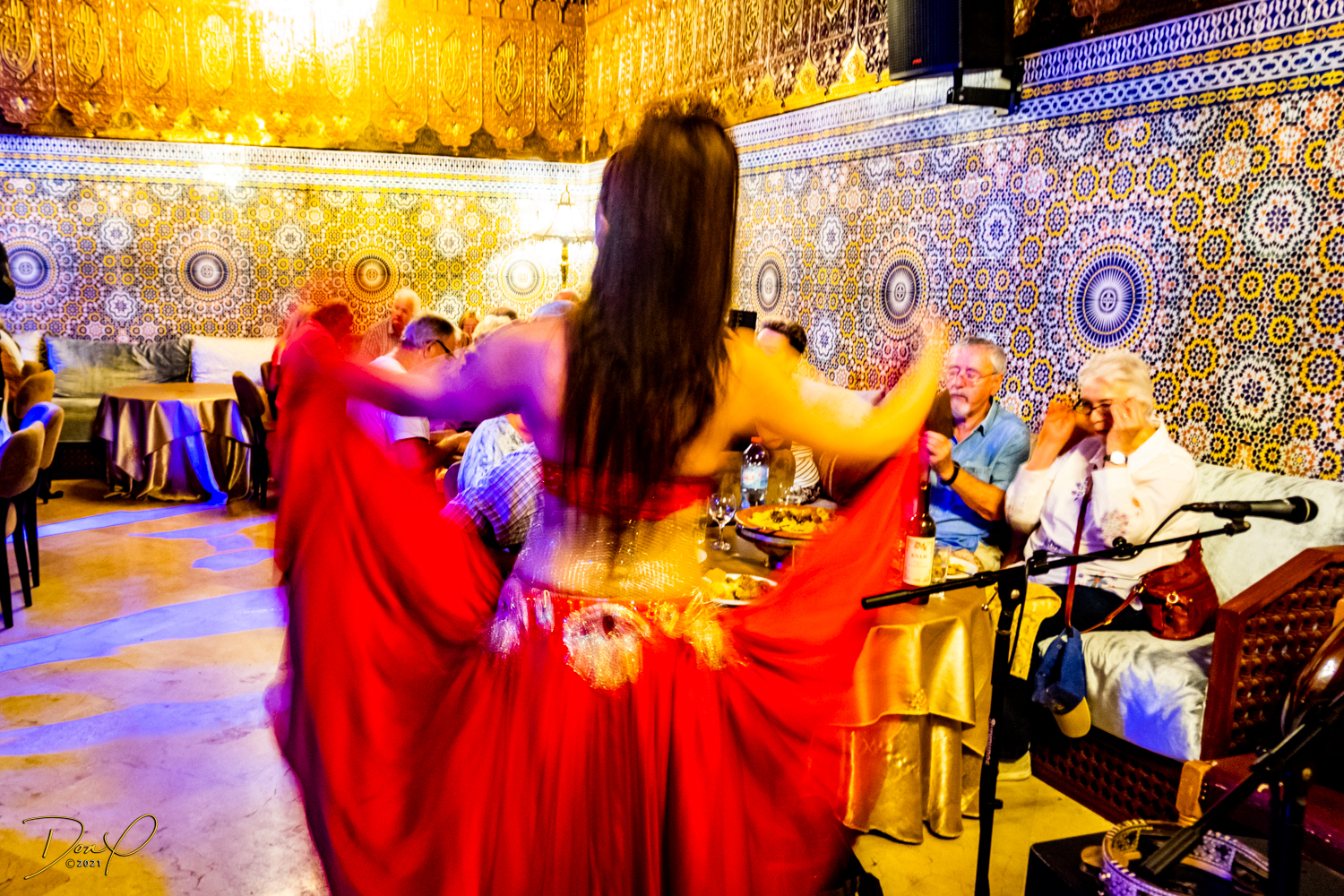 Then, large tagines of chicken and lamb arrive with sauces both spicy and mild. The food is fabulous and our table soon polishes off the food. Then a large woman comes out dancing to the Moroccan music and she is balancing a large plate on her head that is about a yard (meter) across and on it are lit candles in a chandelier formation. She dances and the candles flicker but not once does the chandelier falter or fall.