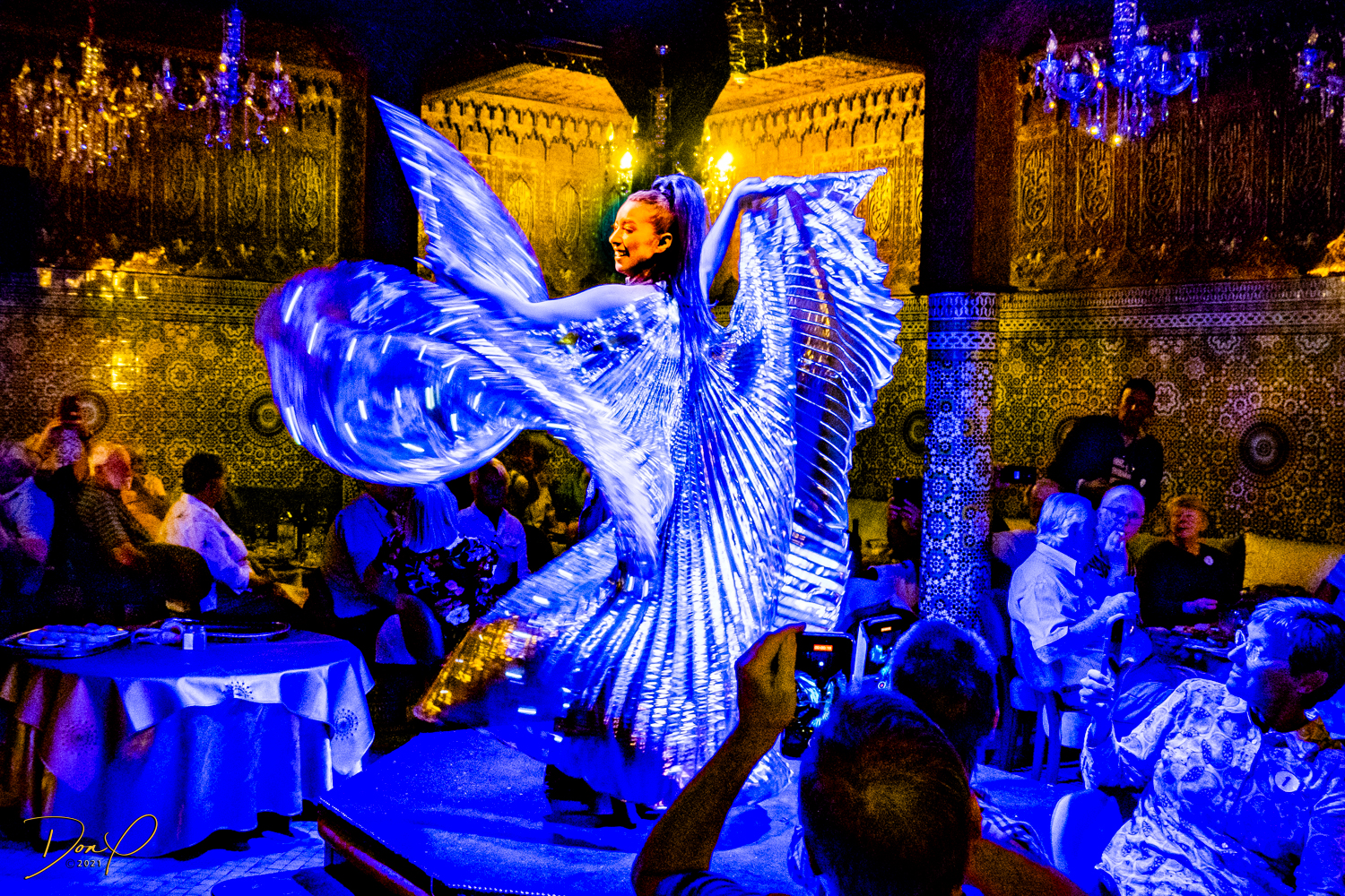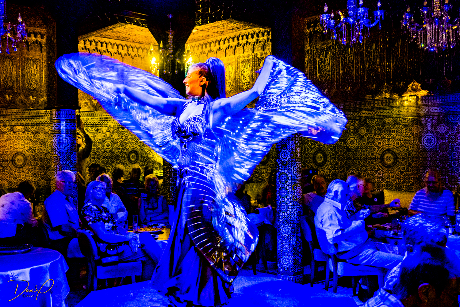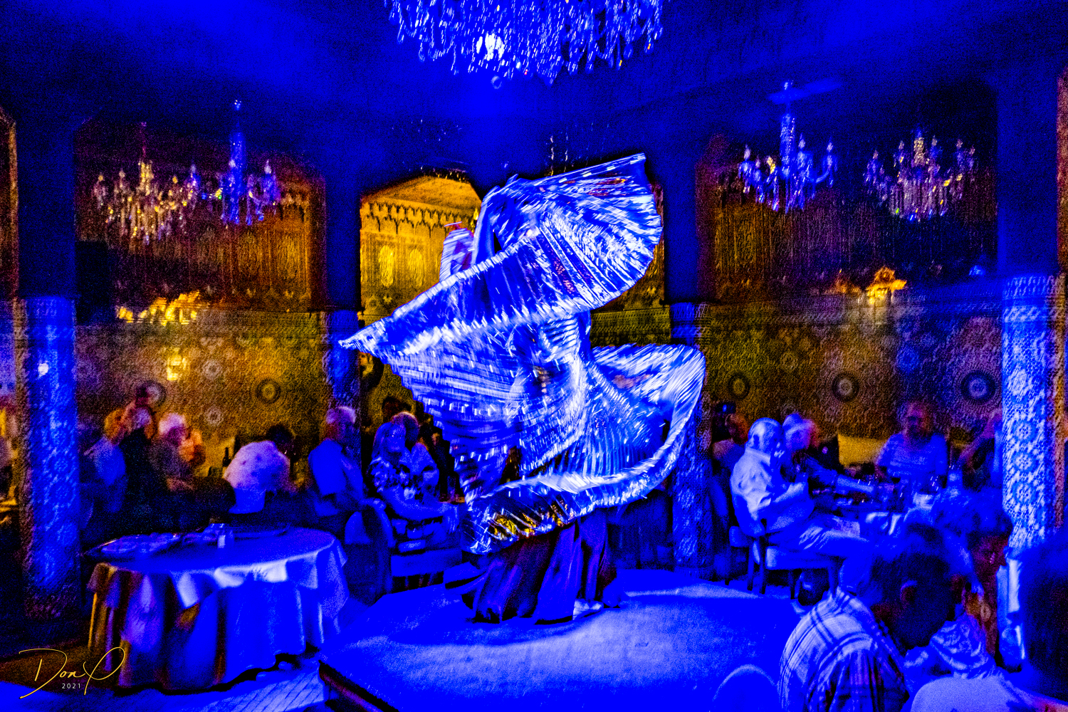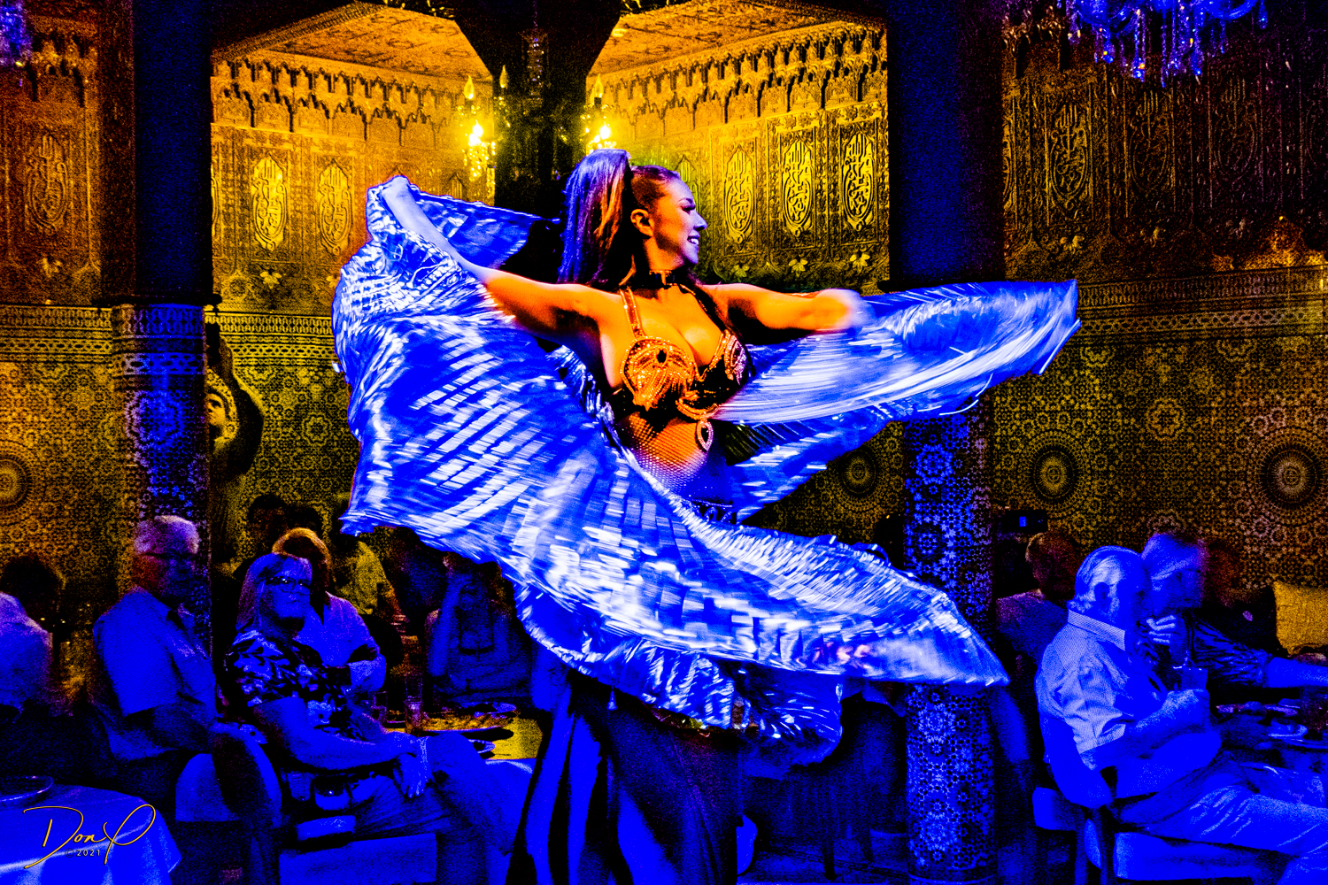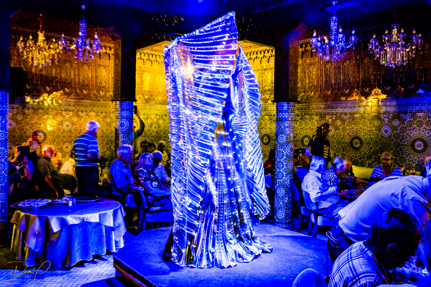 Next, a belly dancer comes out and dances with a cloak of blue lights resembling wings. After a bit, she takes off the cloak of blue lights and dances as any belly dancer does for tips and a few patrons dance with her. I even approach her and dance, fitting a couple dollars into her garment to the cheers of the crowd.