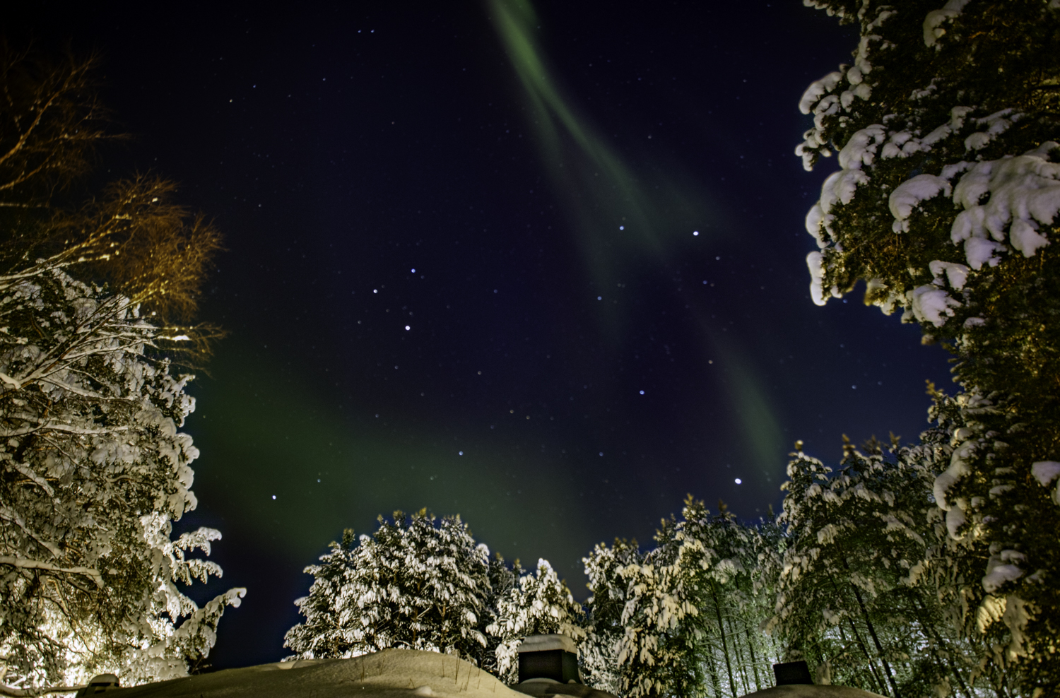 It is still snowing. But the storm clears before midnight and someone texts on WhatsApp in the group that the Northern Lights are spotted! We get our first sighting of the Aurora Borealis shortly after midnight. I jump up and pull on several layers of clothing, grab my camera and tripod, and head outside! A few photos are taken to figure out the correct exposure to use. By then the Auroras have dissipated. I do get one decent shot though!