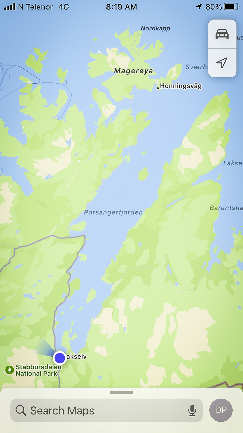 We have now crossed both Arctic and Antarctic Circles and stood on the Equator. What other lines are there to cross? Oh yes, the Prime Meridian! But we have been there too! Lines, lines, everywhere a line, ones to cross and others to stand on. You can see our location (blue dot) on the map and our destination is Nordkapp (North Cape) at the top of the map.