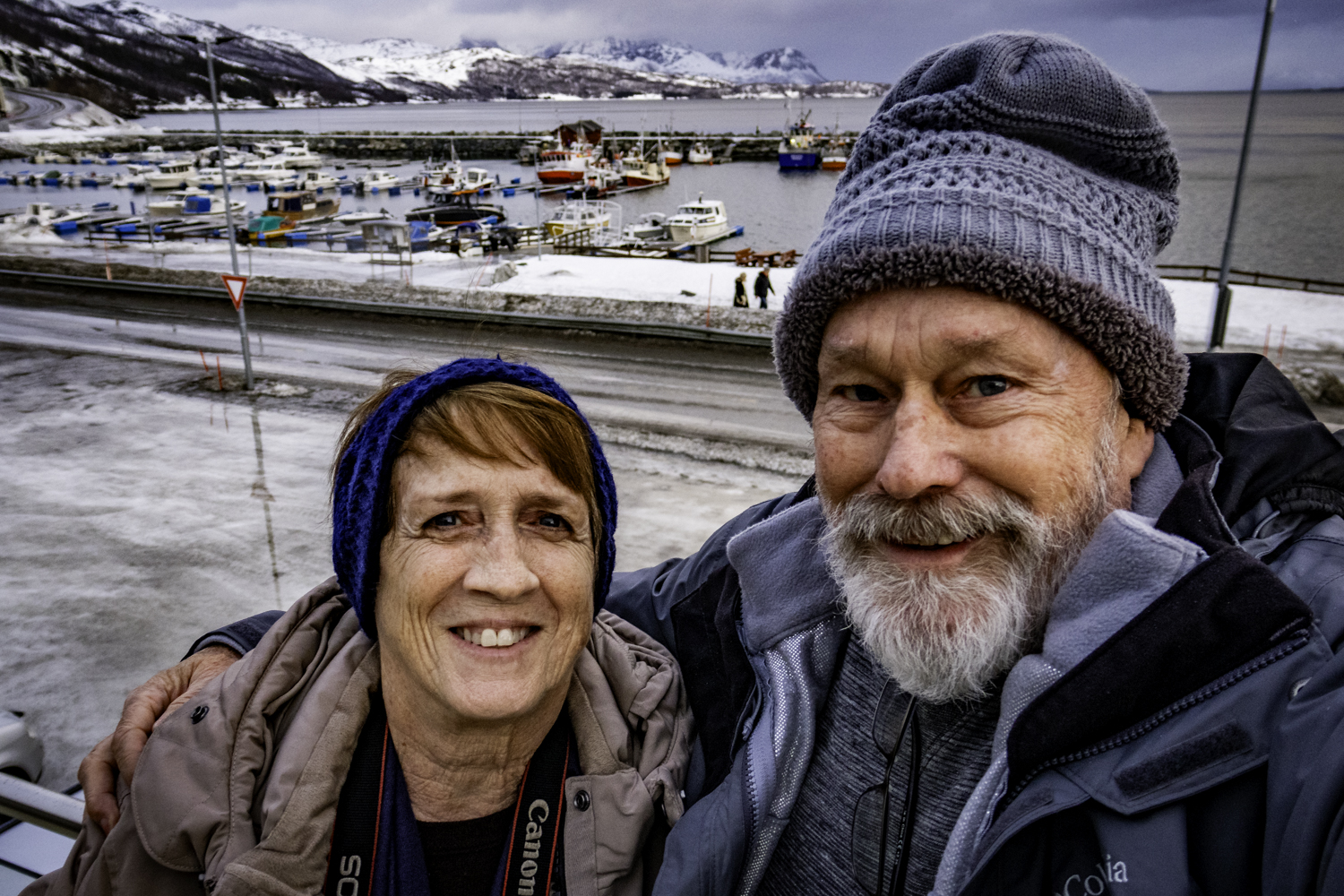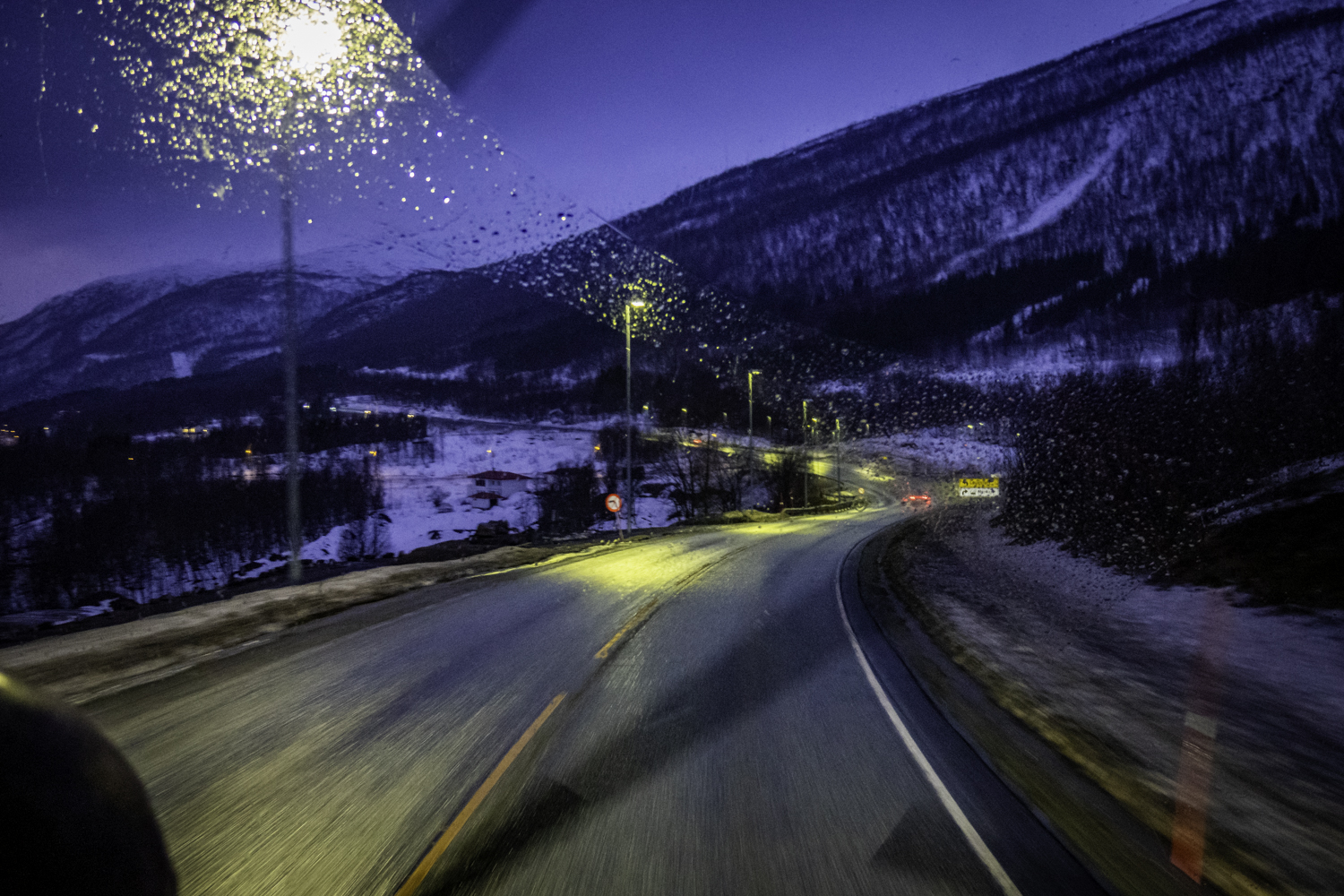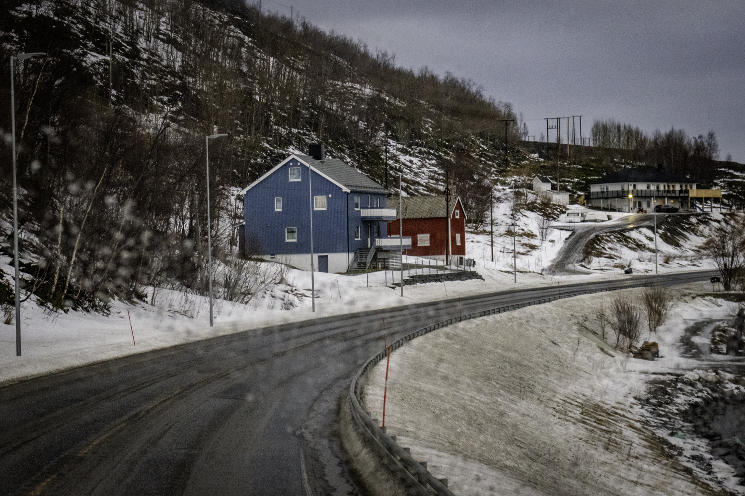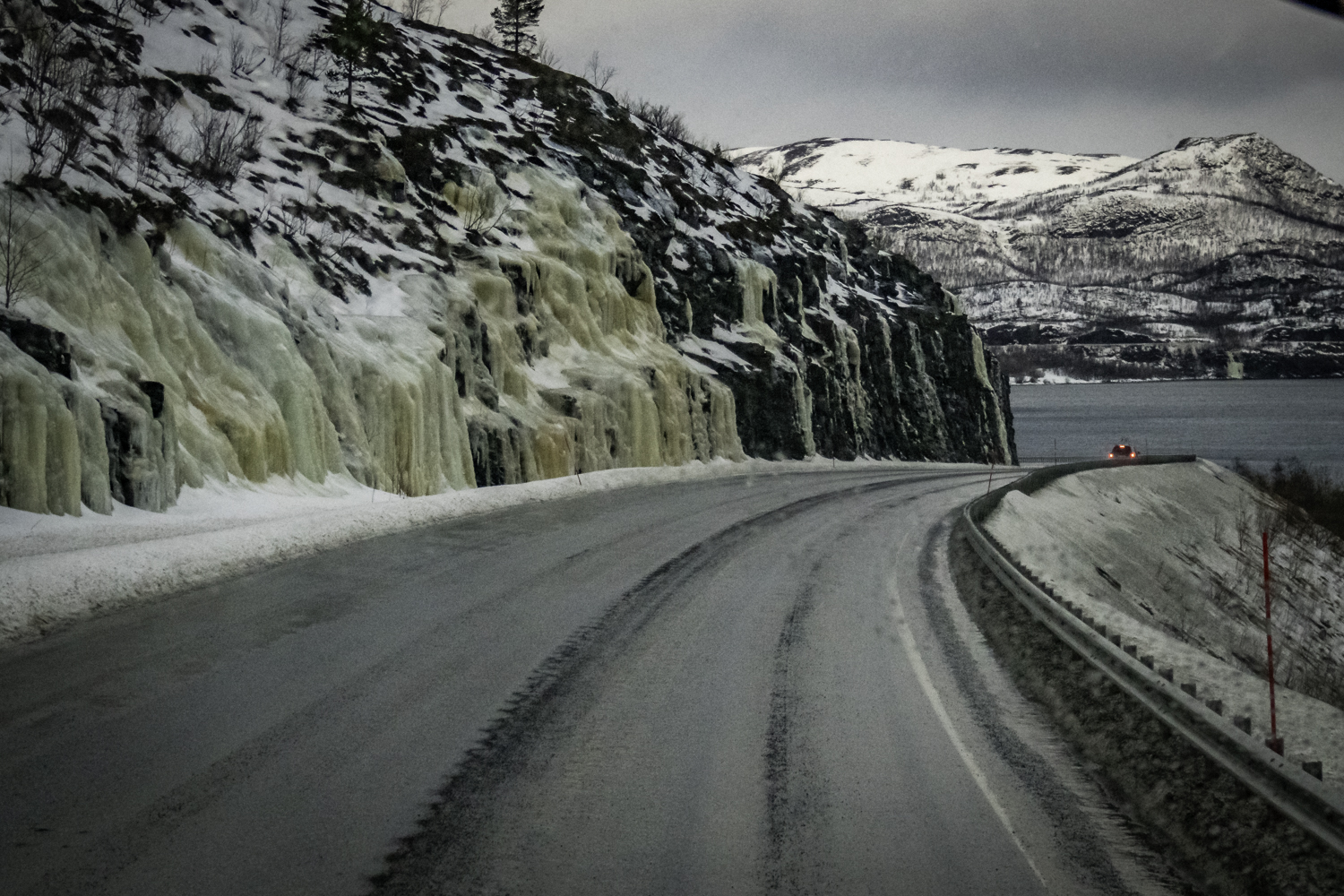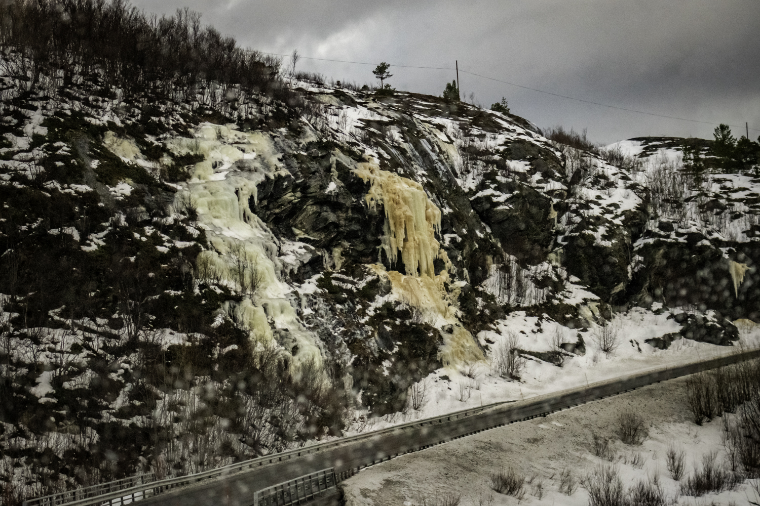 The scenery is fantastic today, driving to Tromso by the fjords. Bits of blue sky and green water assault our senses. Colorful houses and towns along the way. Our cameras are happy! We go through many tunnels and over bridges. Frozen waterfalls are in abundance!