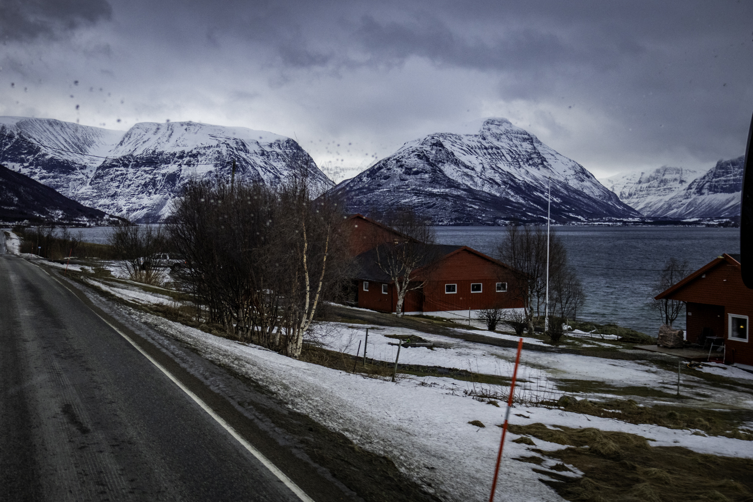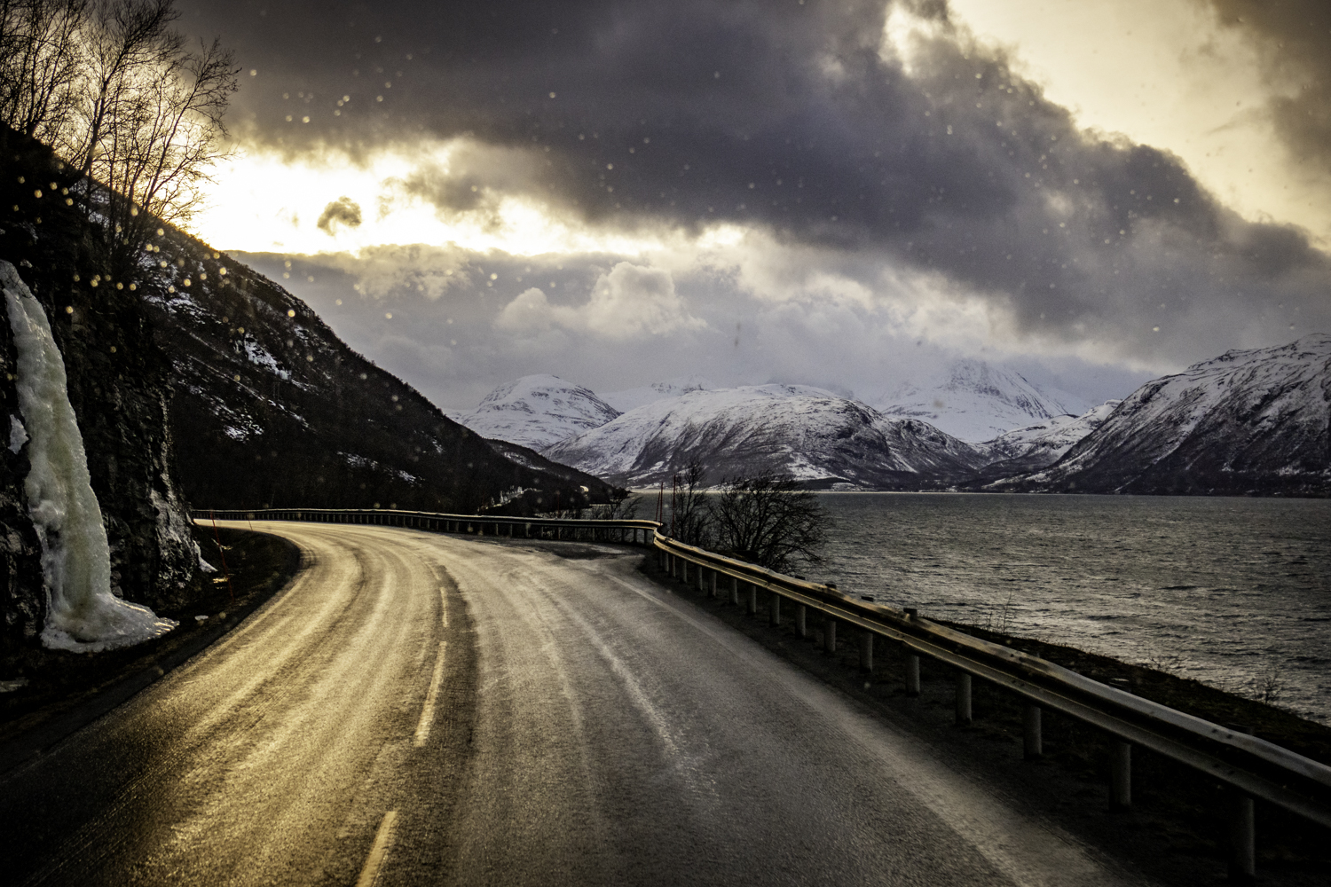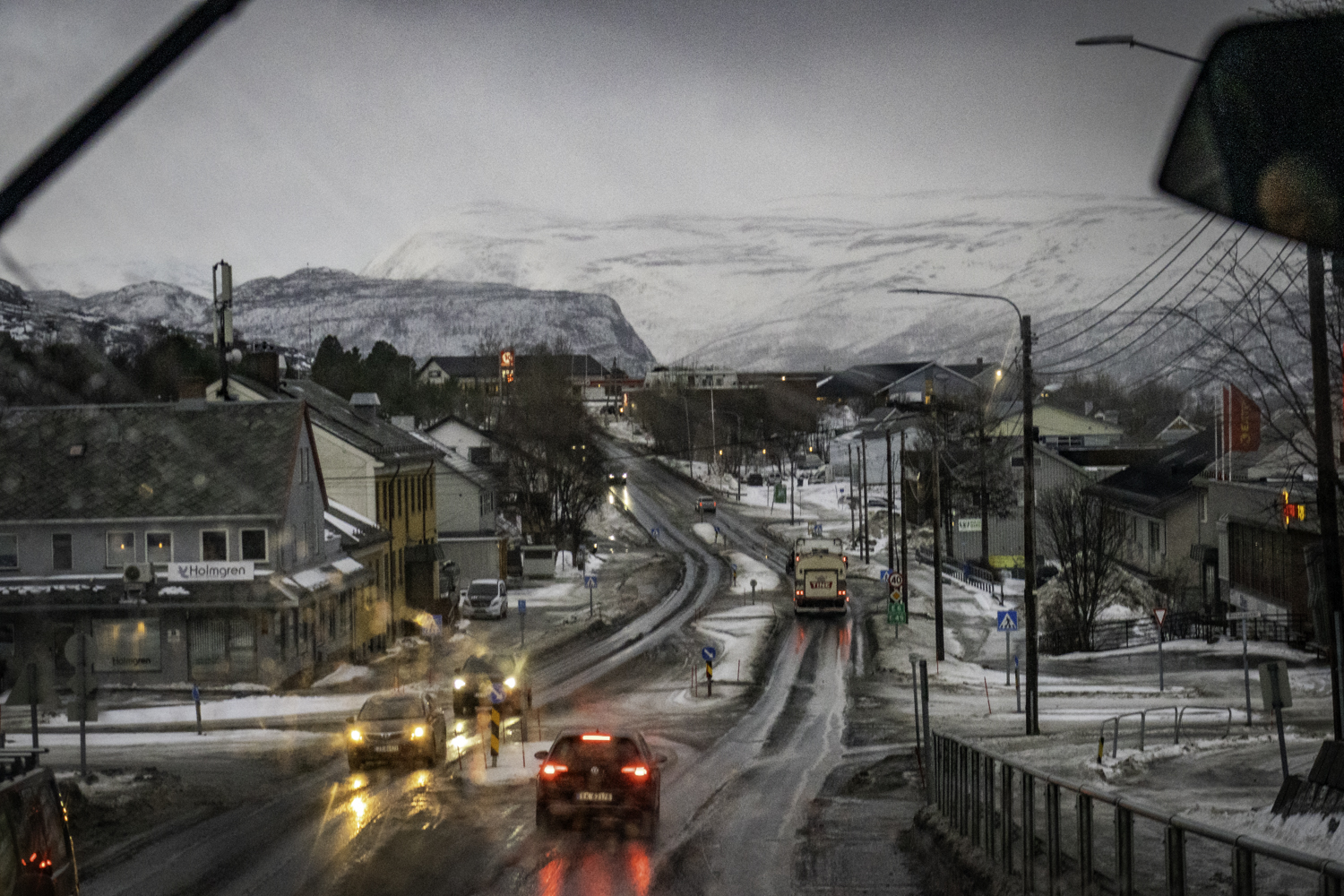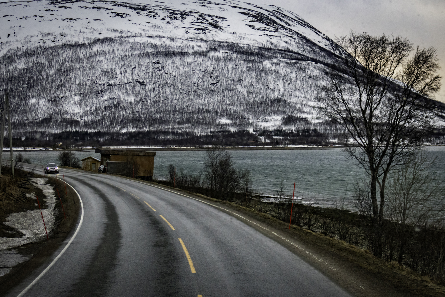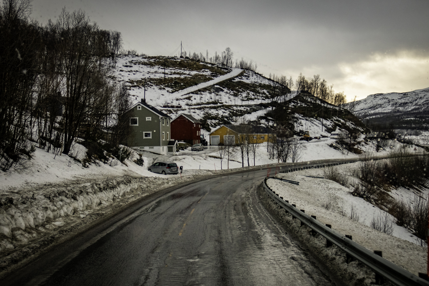 The scenery is fantastic today, driving to Tromso by the fjords. Bits of blue sky and green water assault our senses. Colorful houses and towns along the way. Our cameras are happy! We go through many tunnels and over bridges. Frozen waterfalls are in abundance!