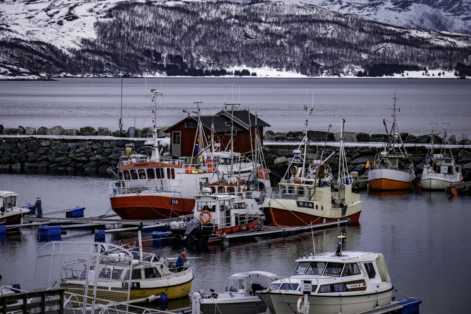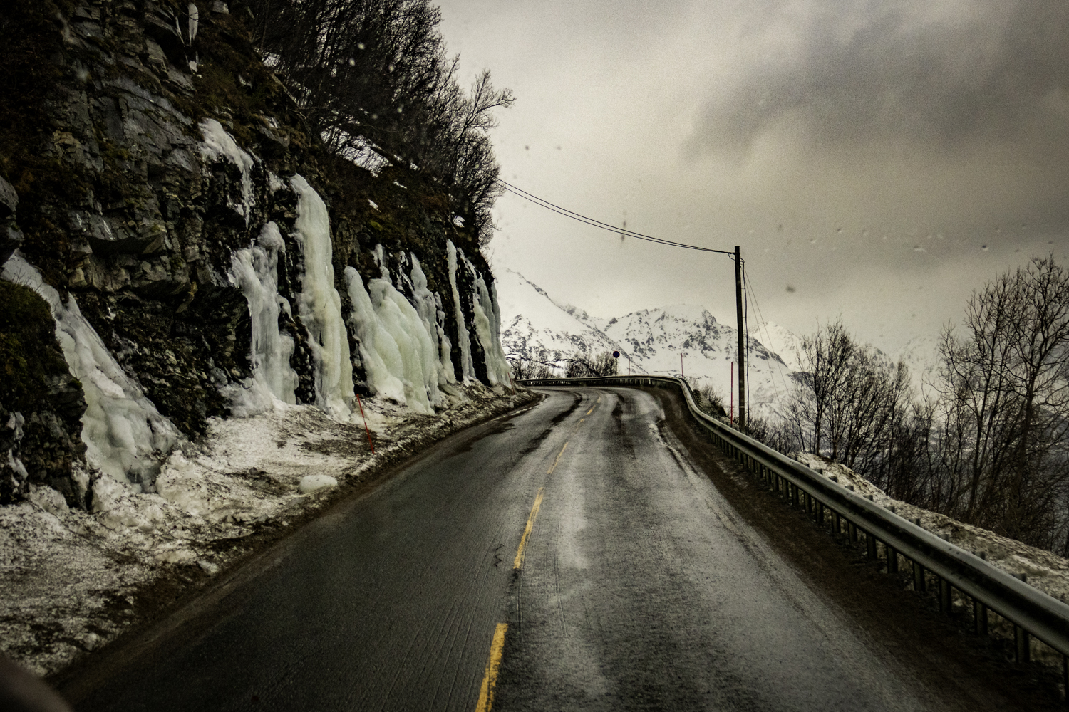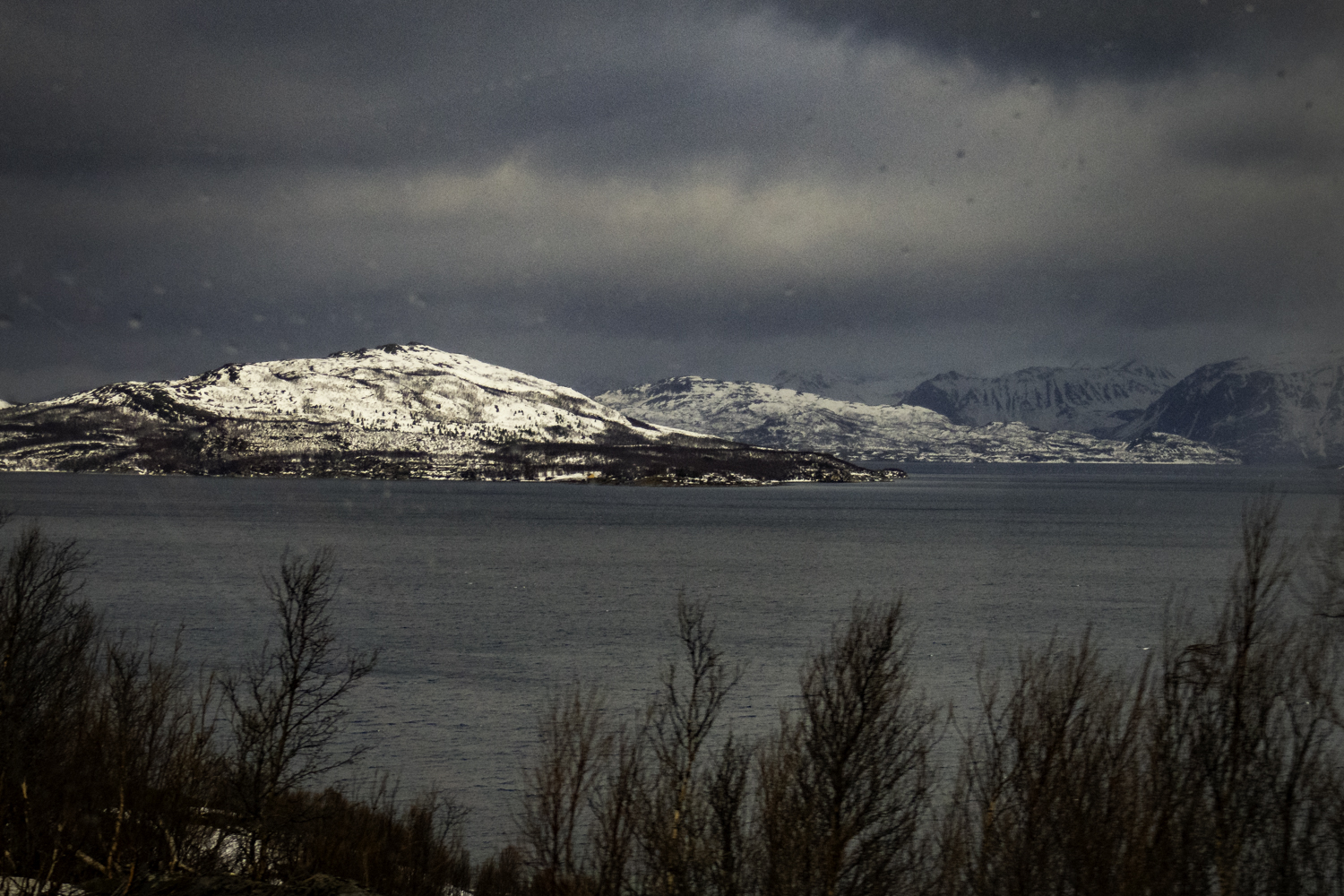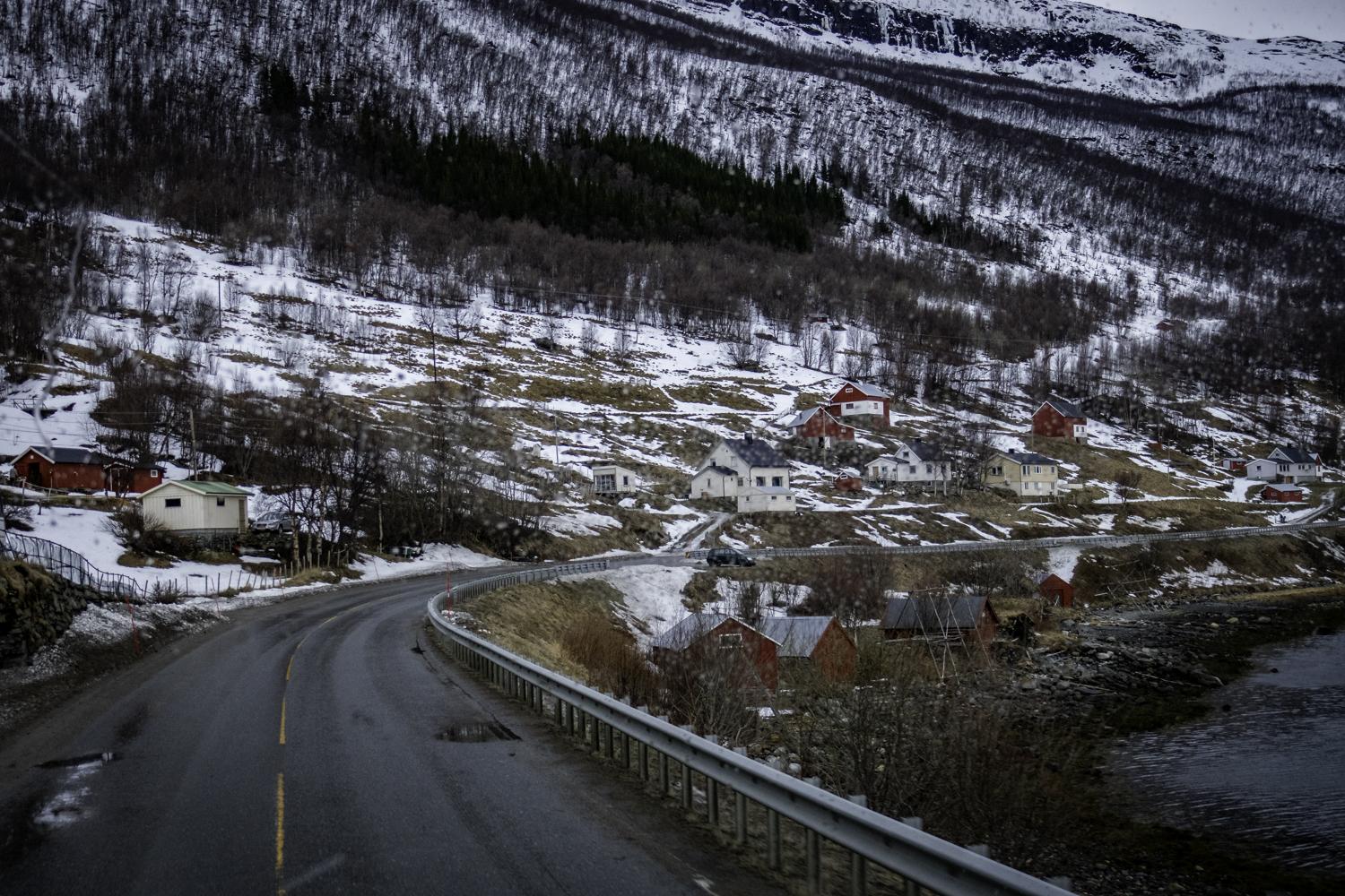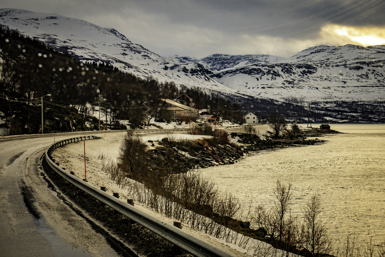 The scenery is fantastic today, driving to Tromso by the fjords. Bits of blue sky and green water assault our senses. Colorful houses and towns along the way. Our cameras are happy! We go through many tunnels and over bridges. Frozen waterfalls are in abundance!