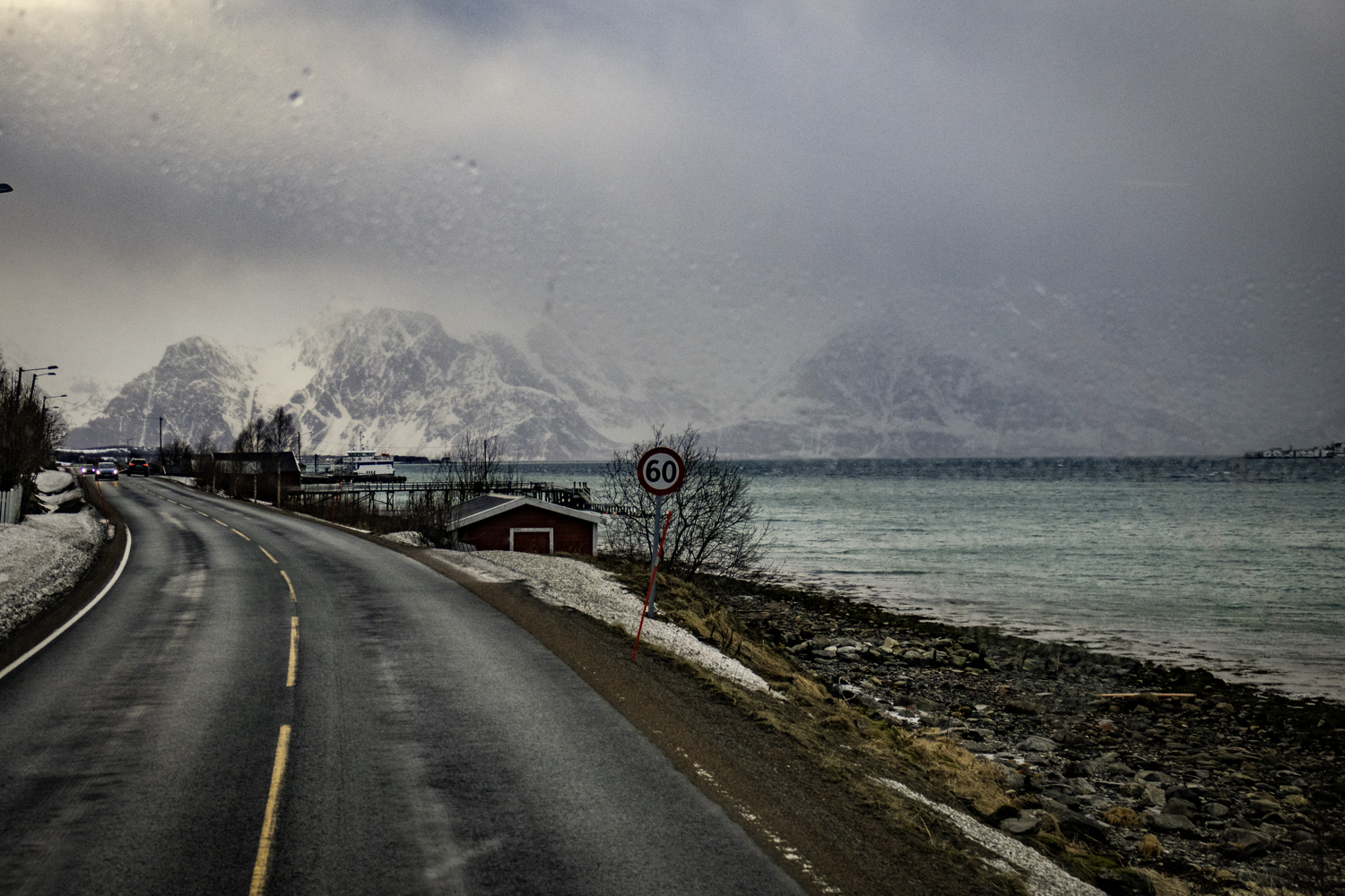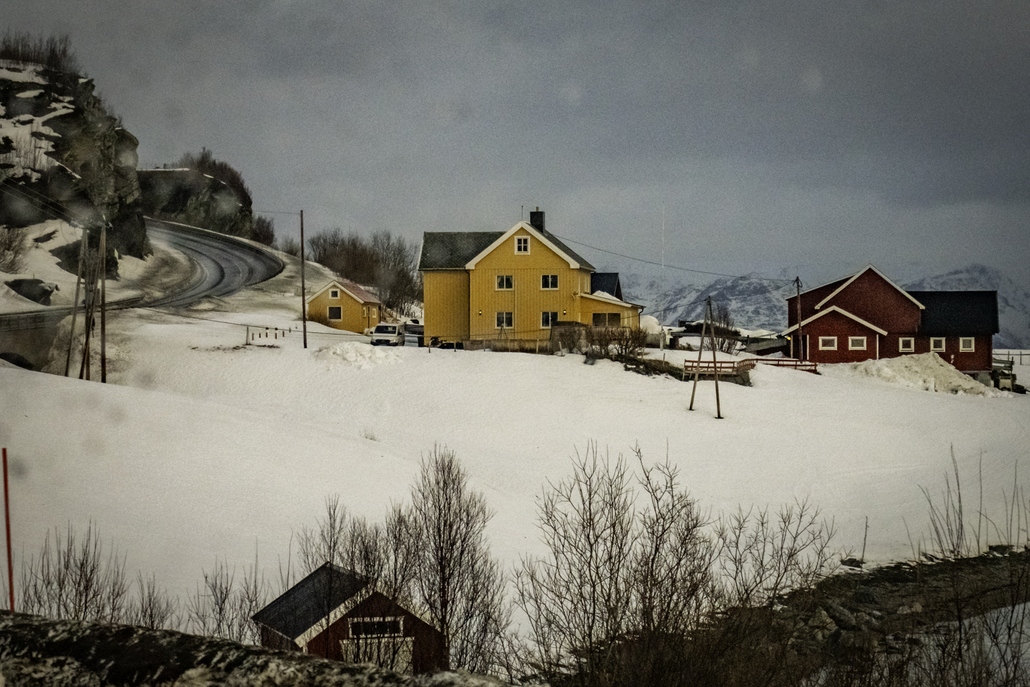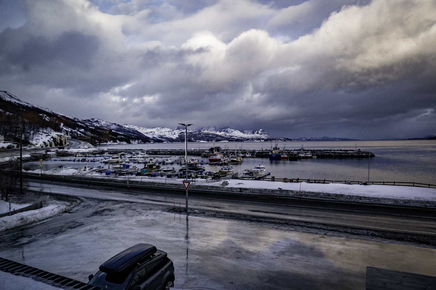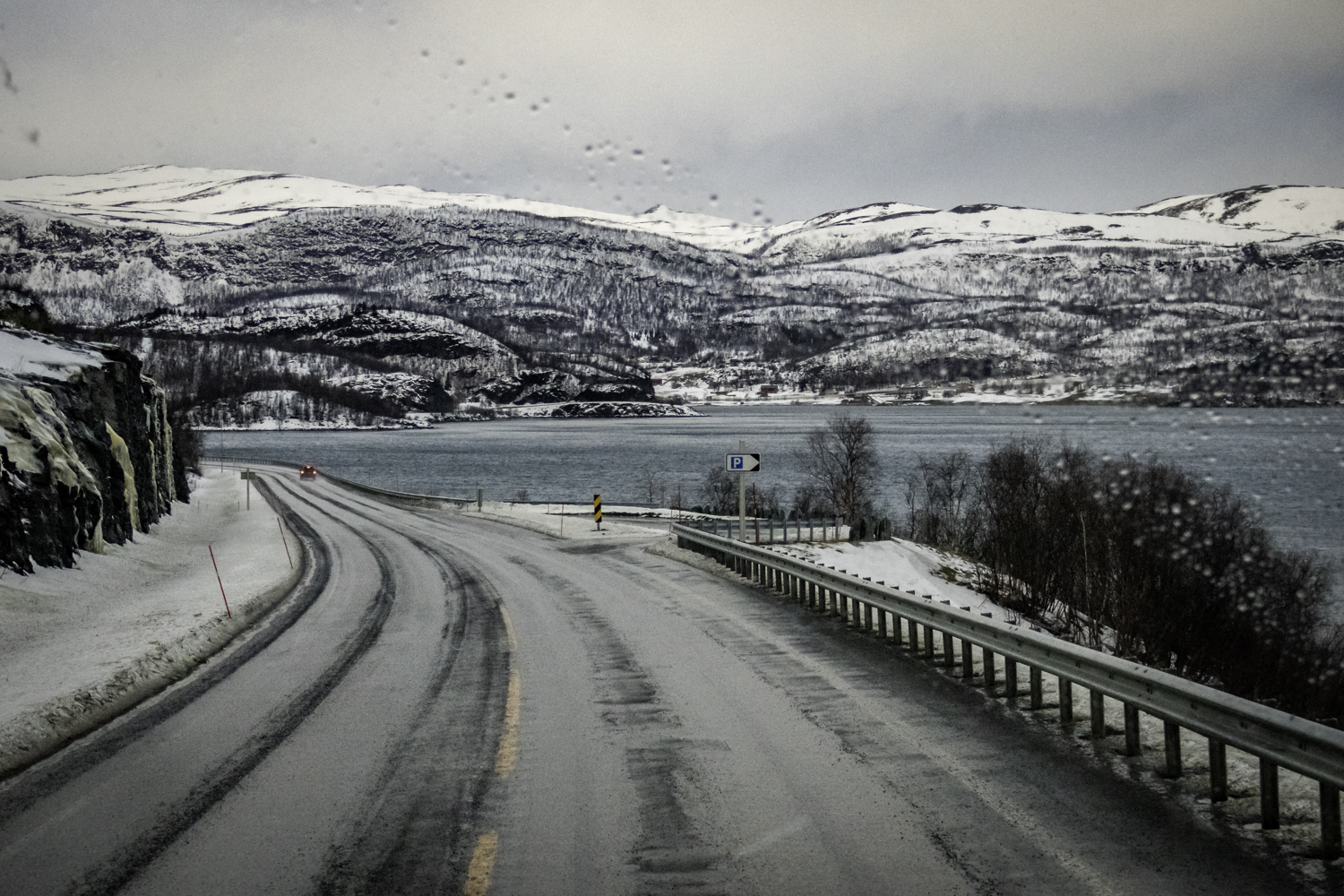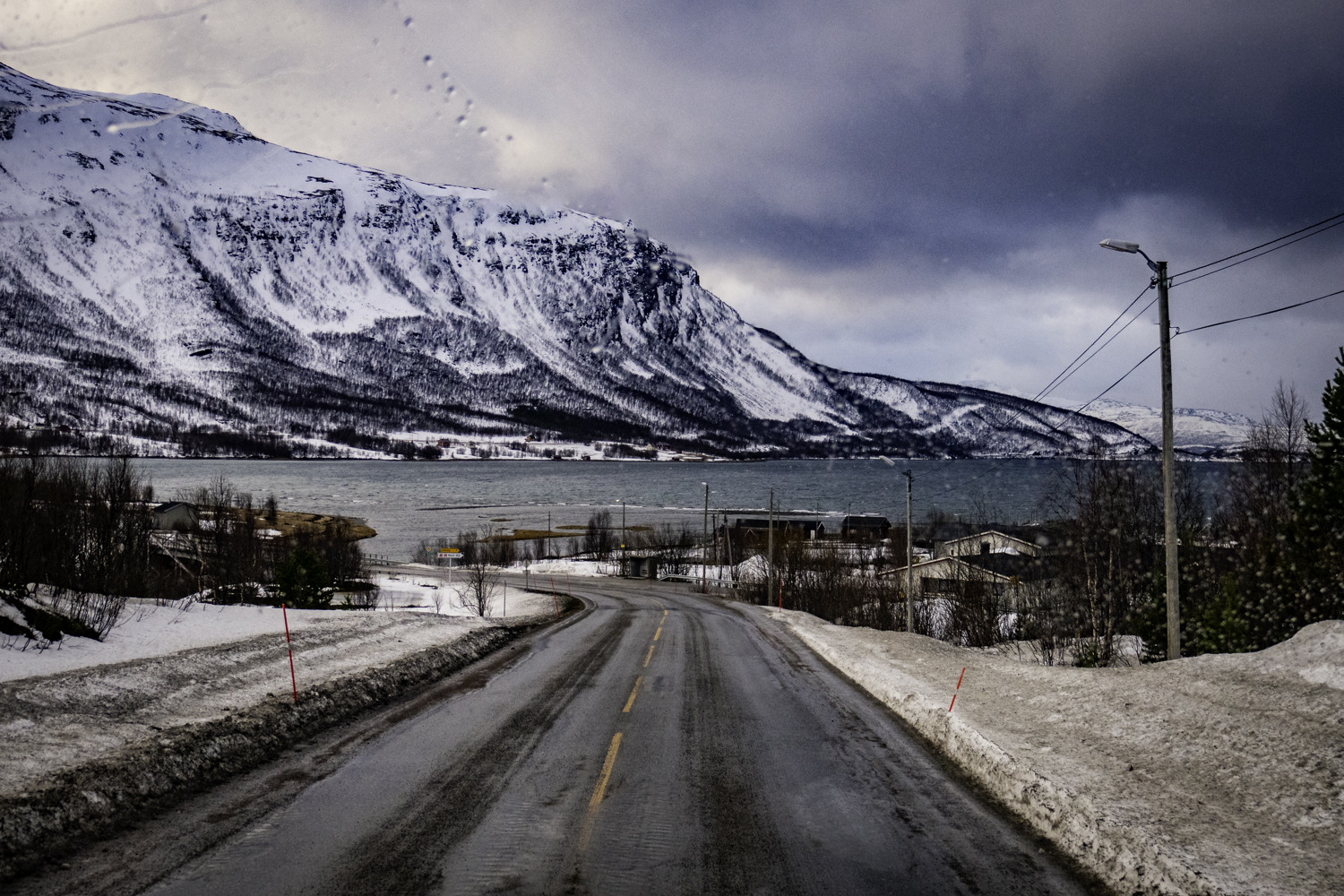 The scenery is fantastic today, driving to Tromso by the fjords. Bits of blue sky and green water assault our senses. Colorful houses and towns along the way. Our cameras are happy! We go through many tunnels and over bridges. Frozen waterfalls are in abundance!