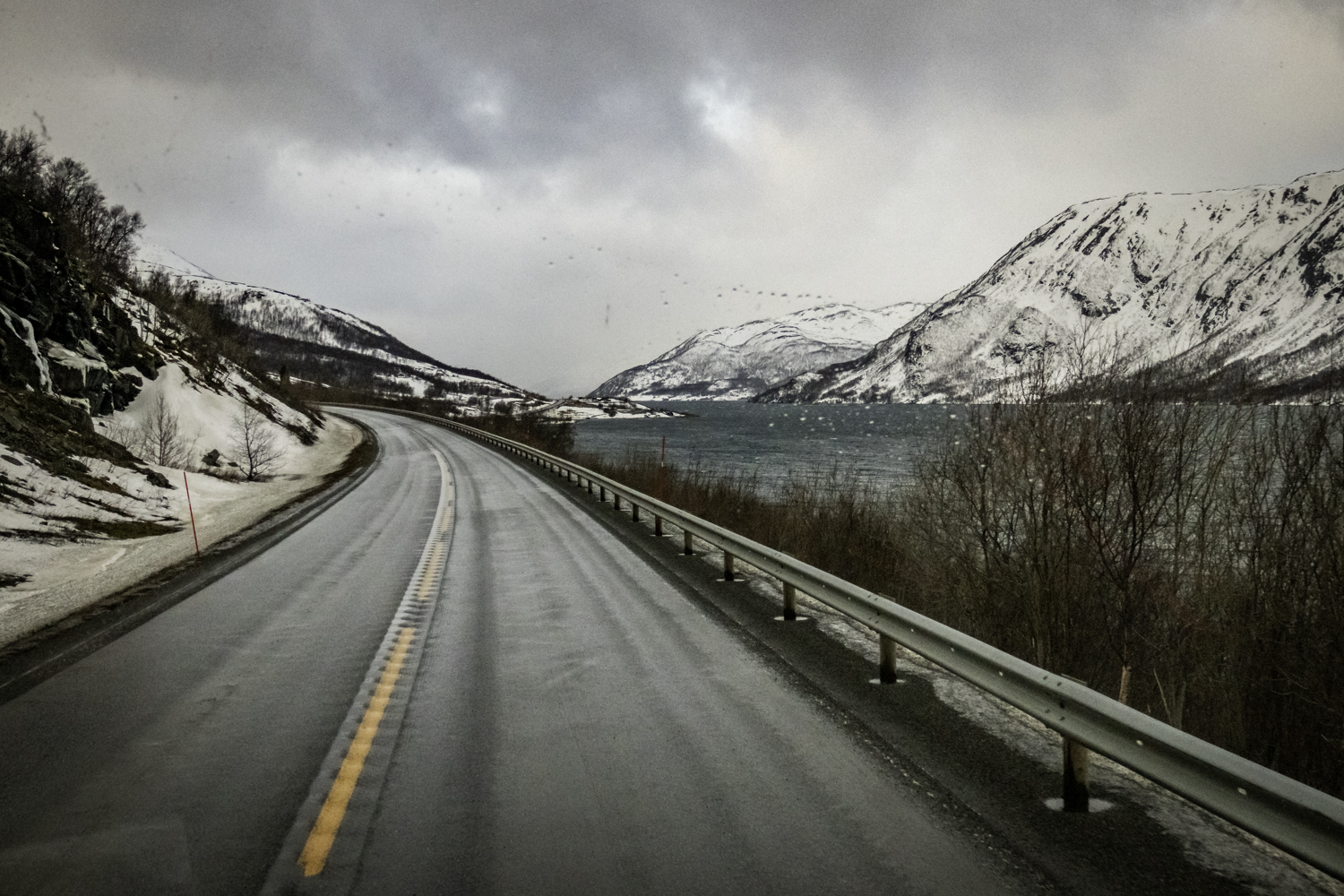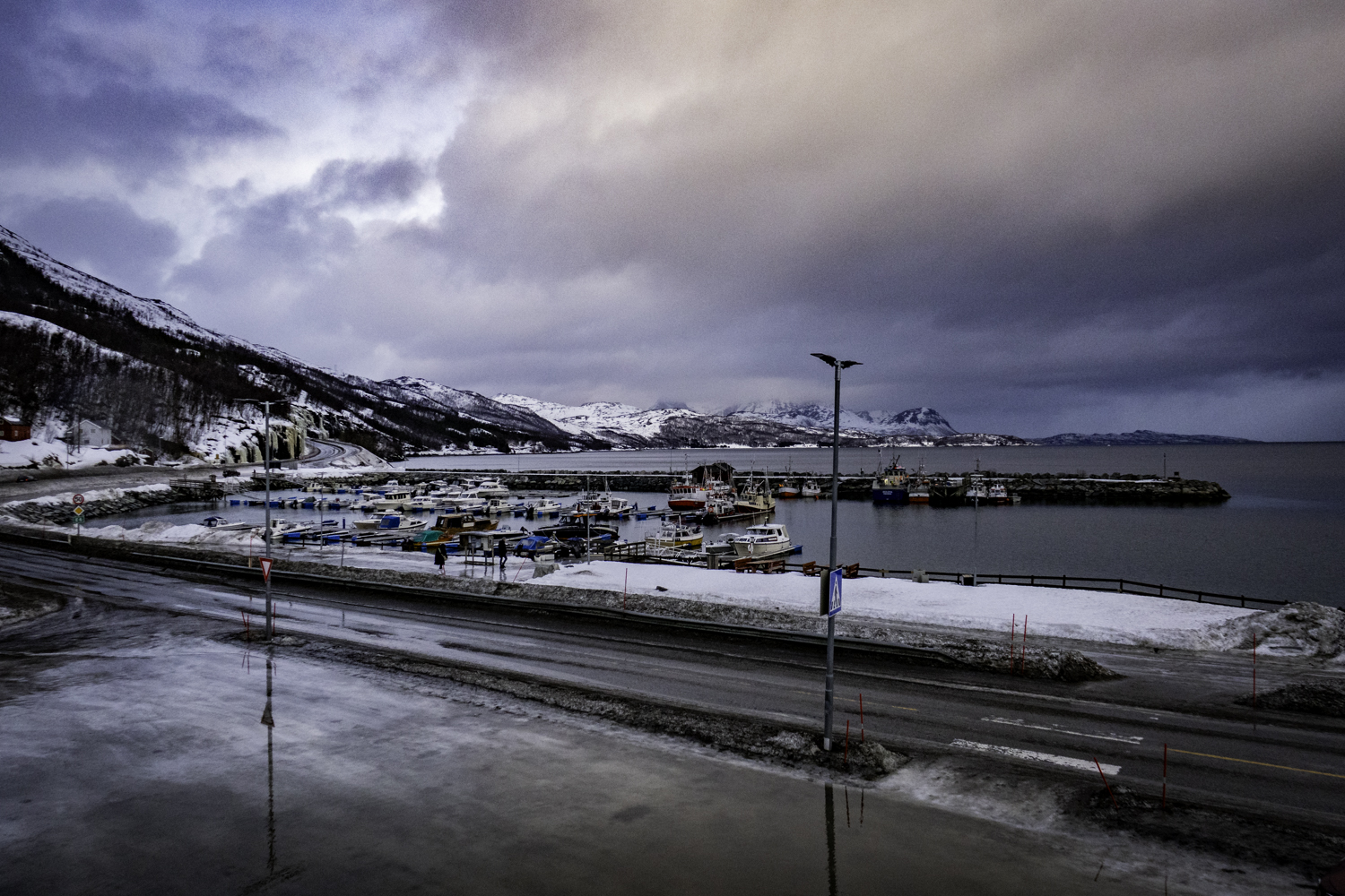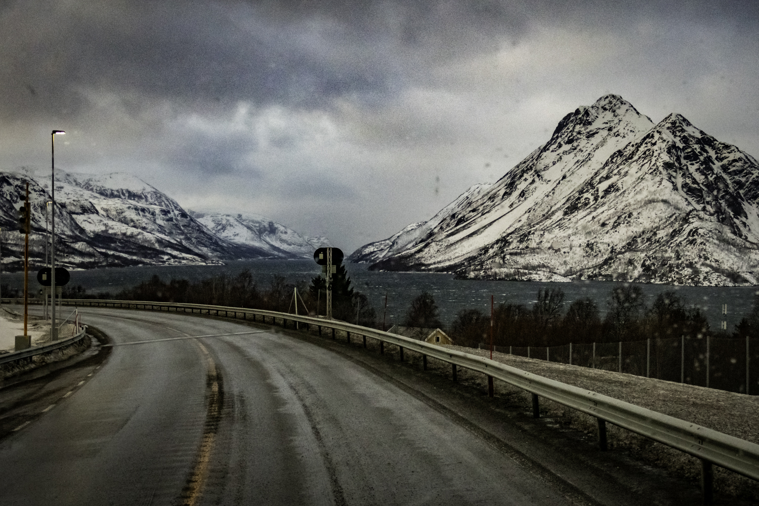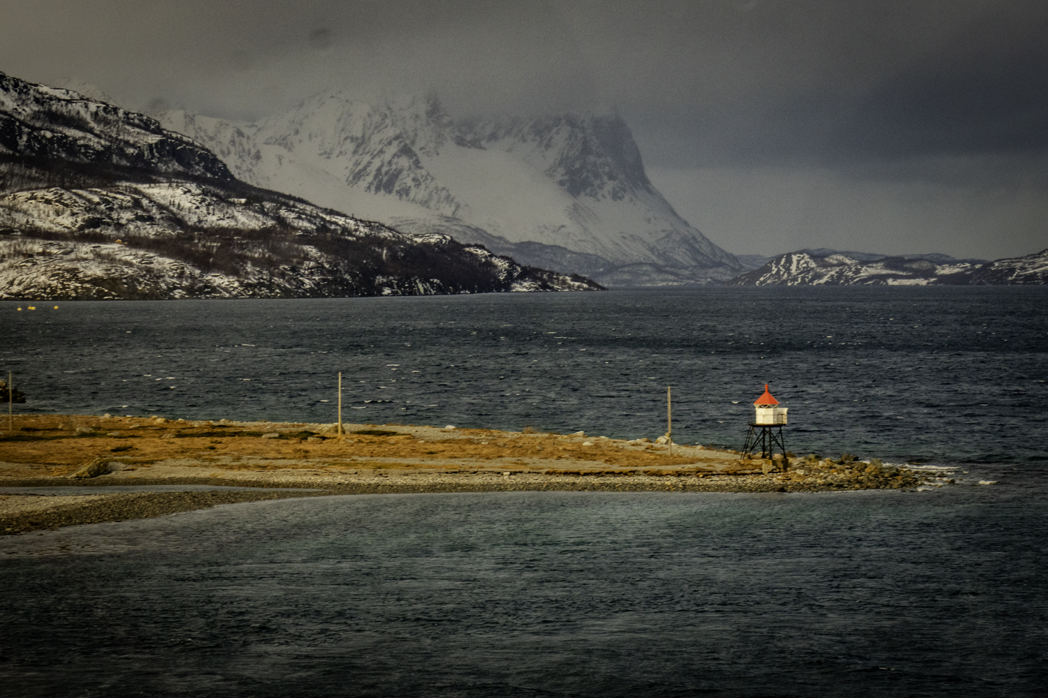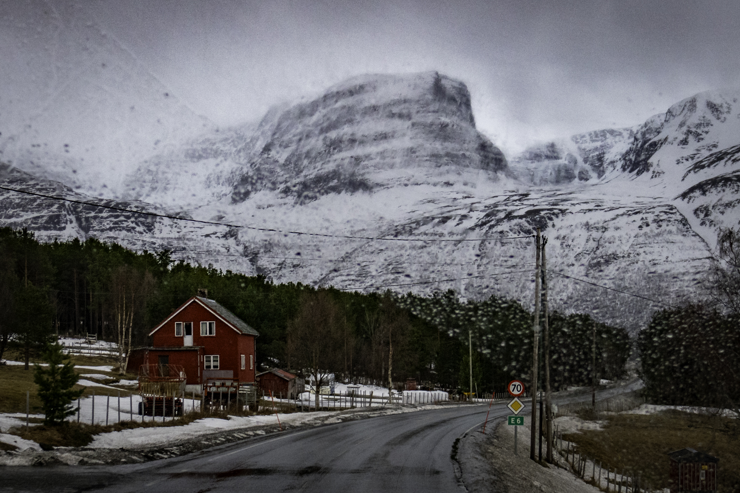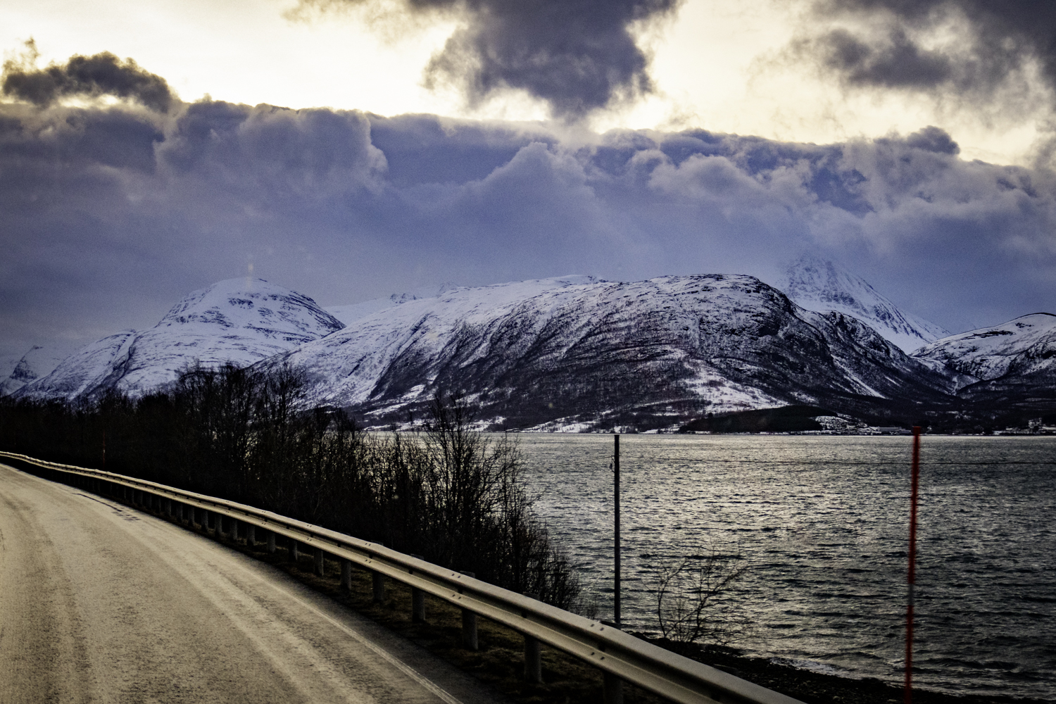The scenery is fantastic today, driving to Tromso by the fjords. Bits of blue sky and green water assault our senses. Colorful houses and towns along the way. Our cameras are happy! We go through many tunnels and over bridges. Frozen waterfalls are in abundance!