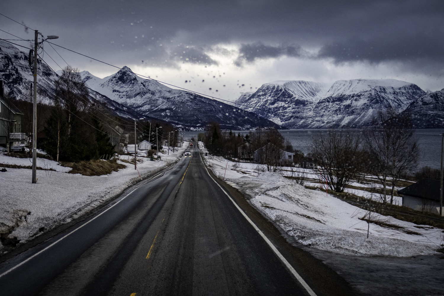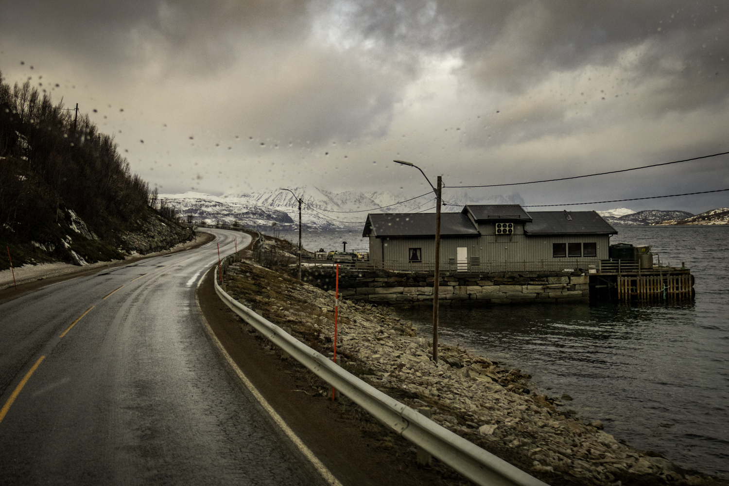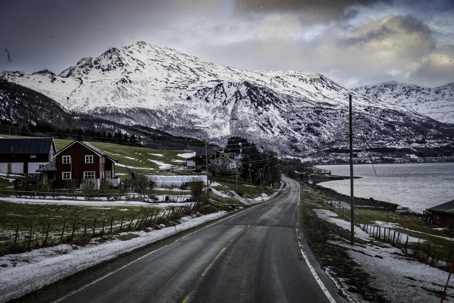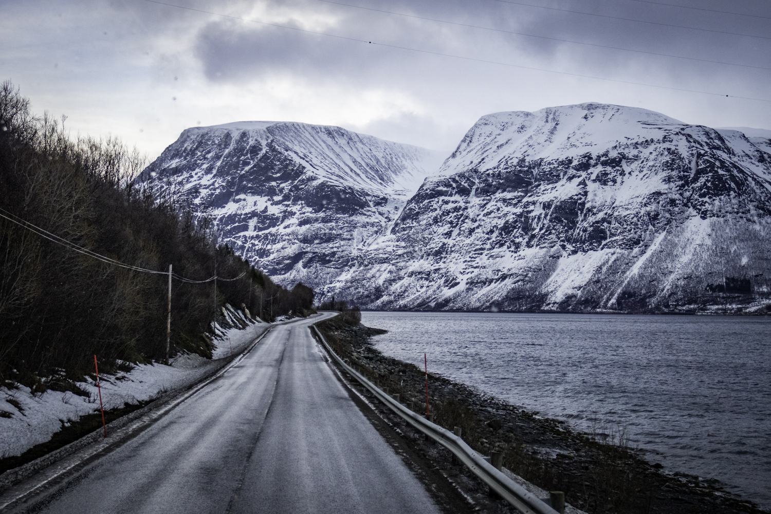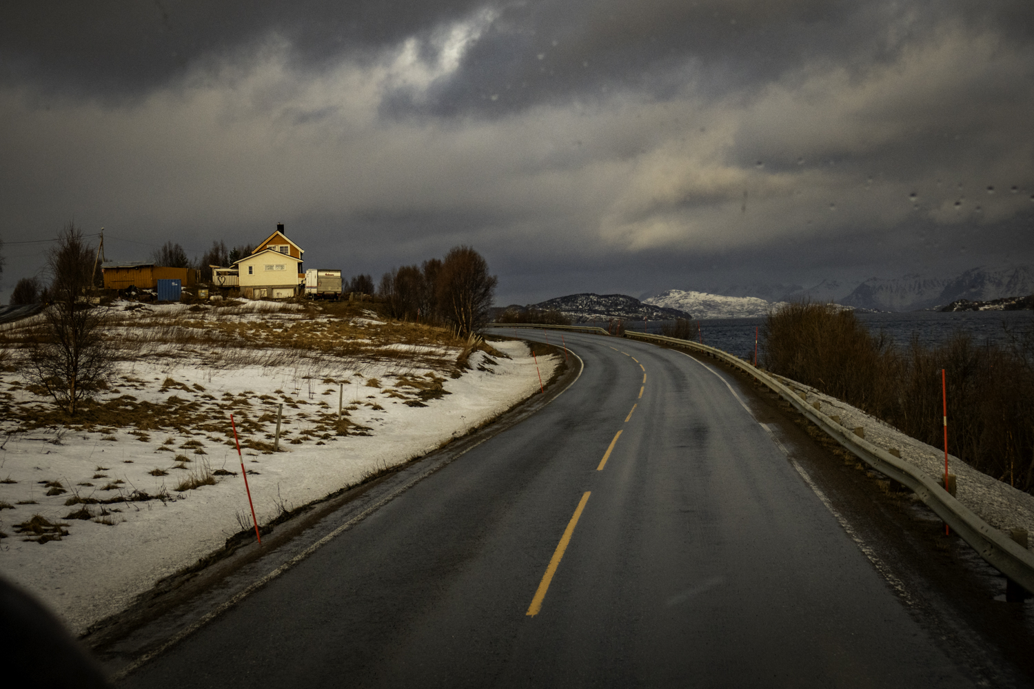 The scenery is fantastic today, driving to Tromso by the fjords. Bits of blue sky and green water assault our senses. Colorful houses and towns along the way. Our cameras are happy! We go through many tunnels and over bridges. Frozen waterfalls are in abundance!