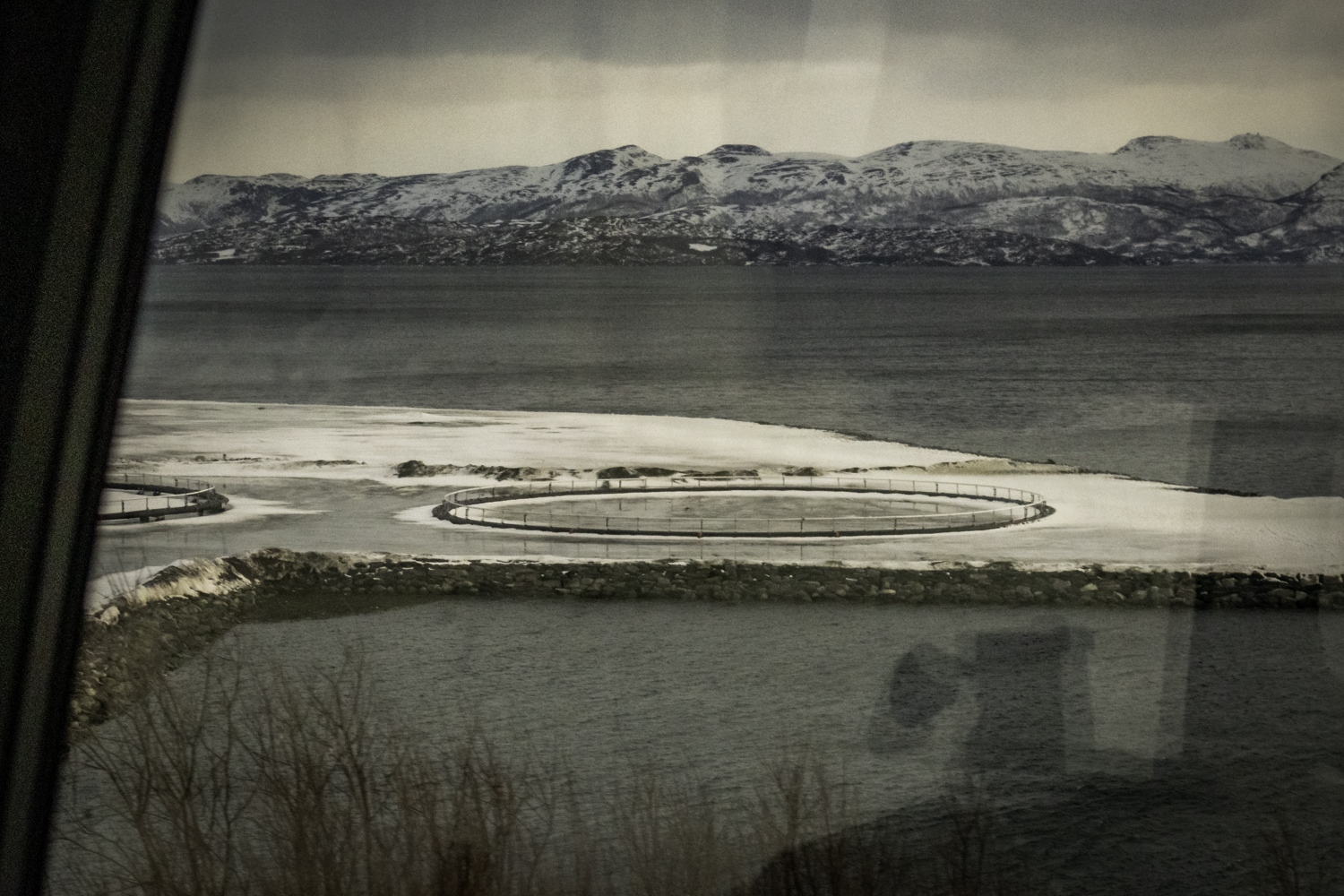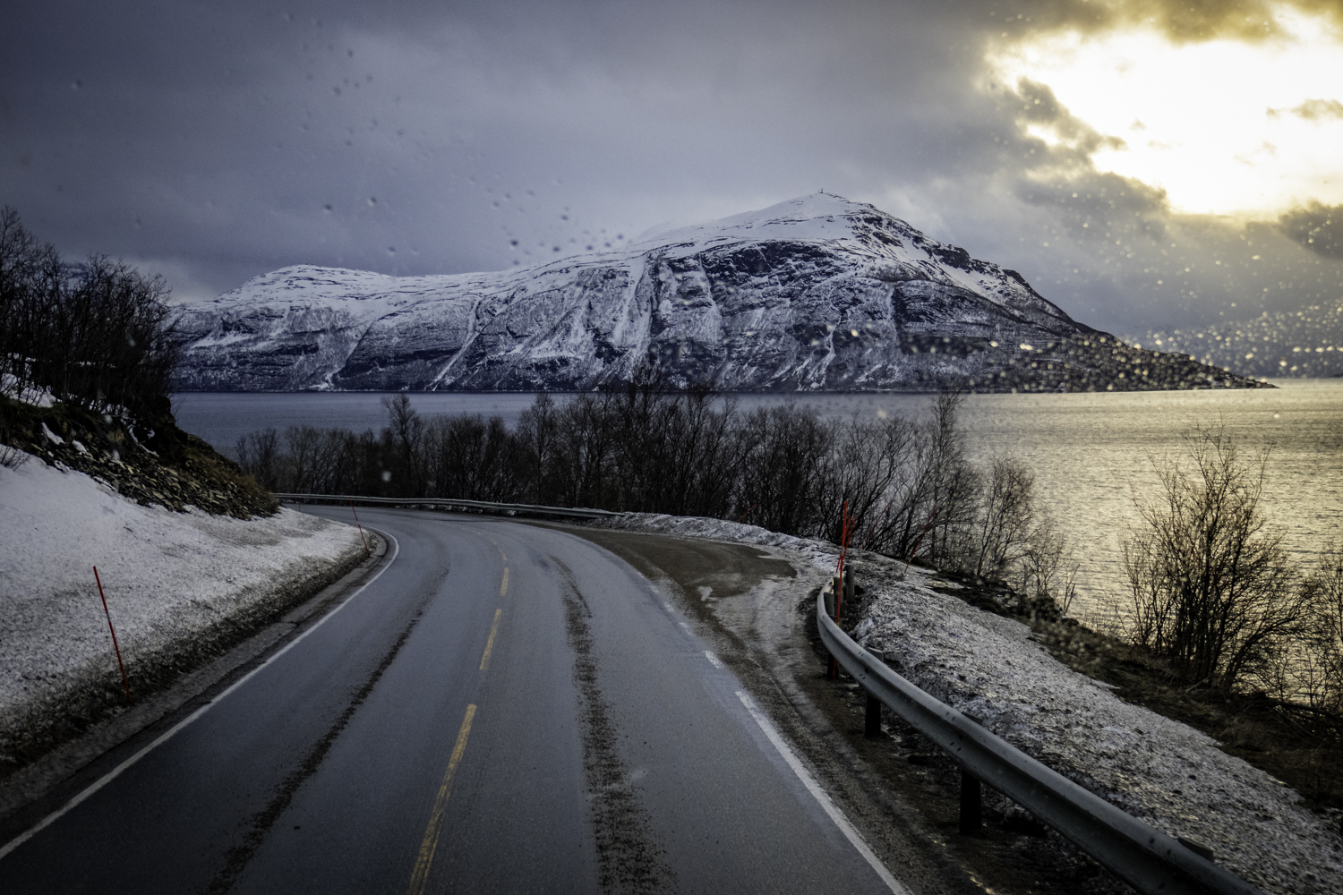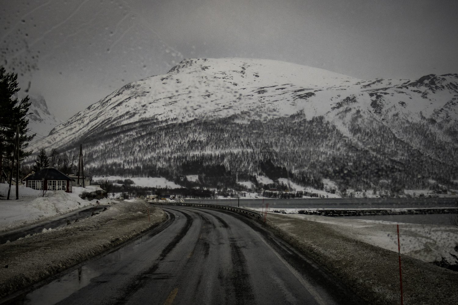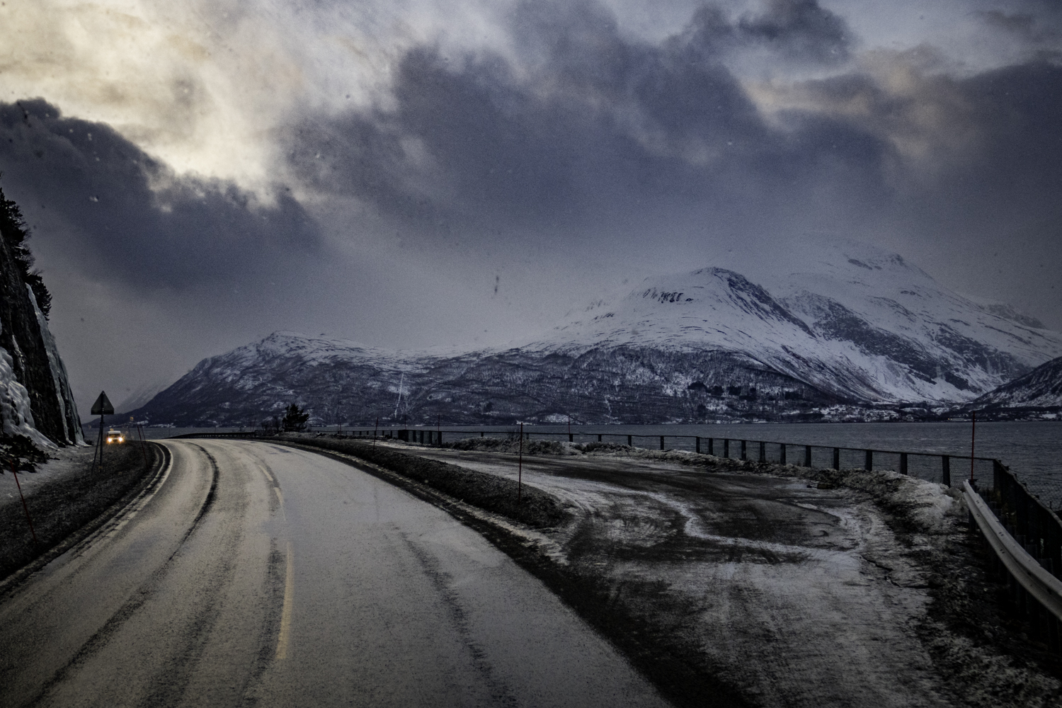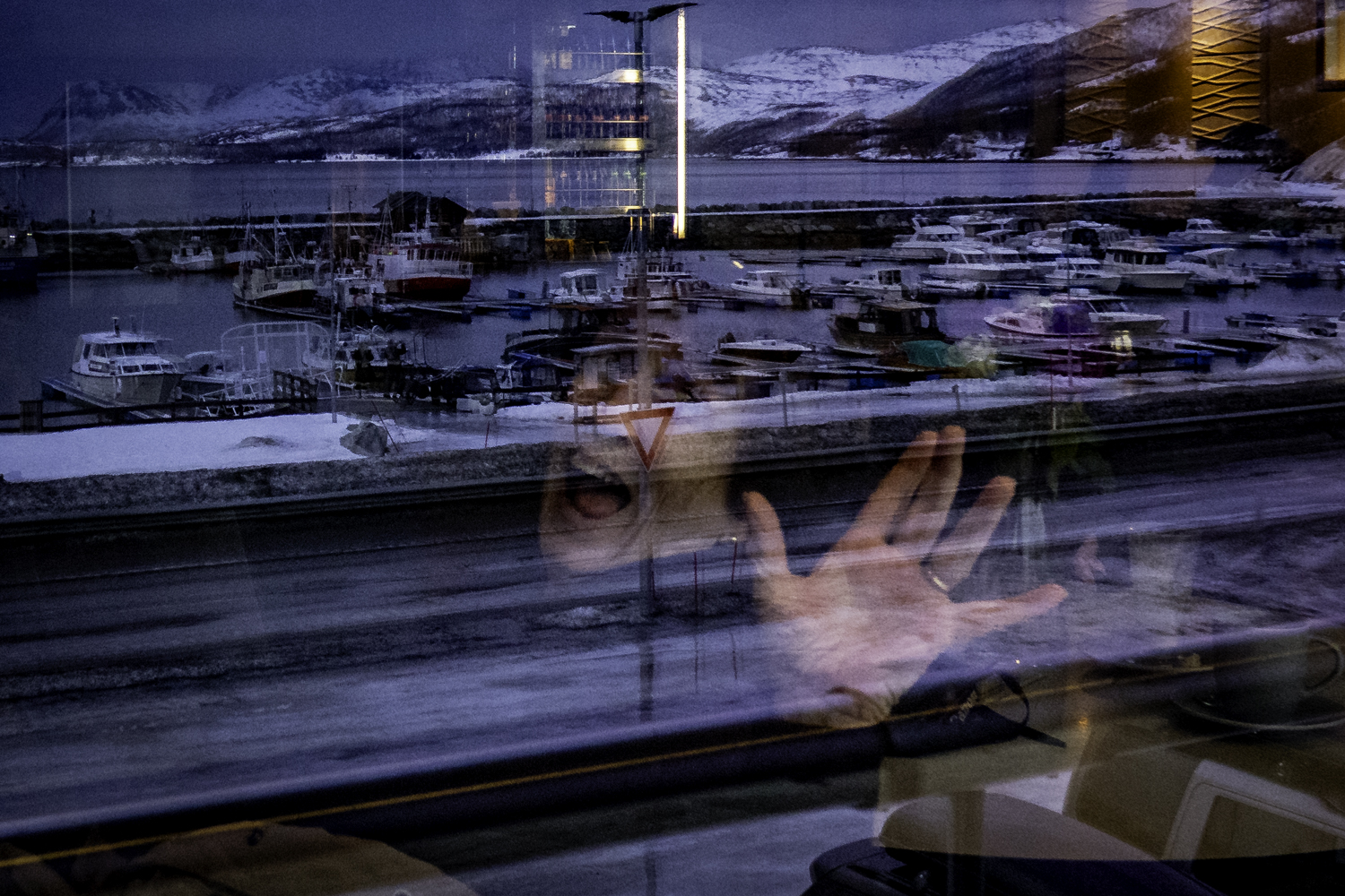 The scenery is fantastic today, driving to Tromso by the fjords. Bits of blue sky and green water assault our senses. Colorful houses and towns along the way. Our cameras are happy! We go through many tunnels and over bridges. Frozen waterfalls are in abundance!