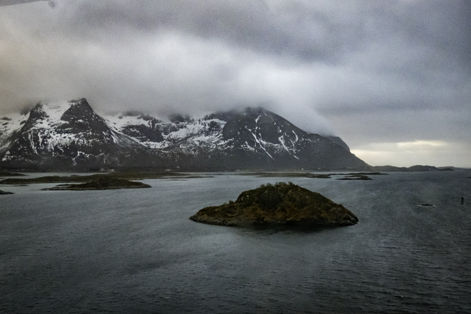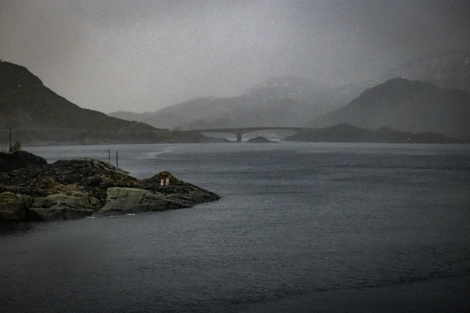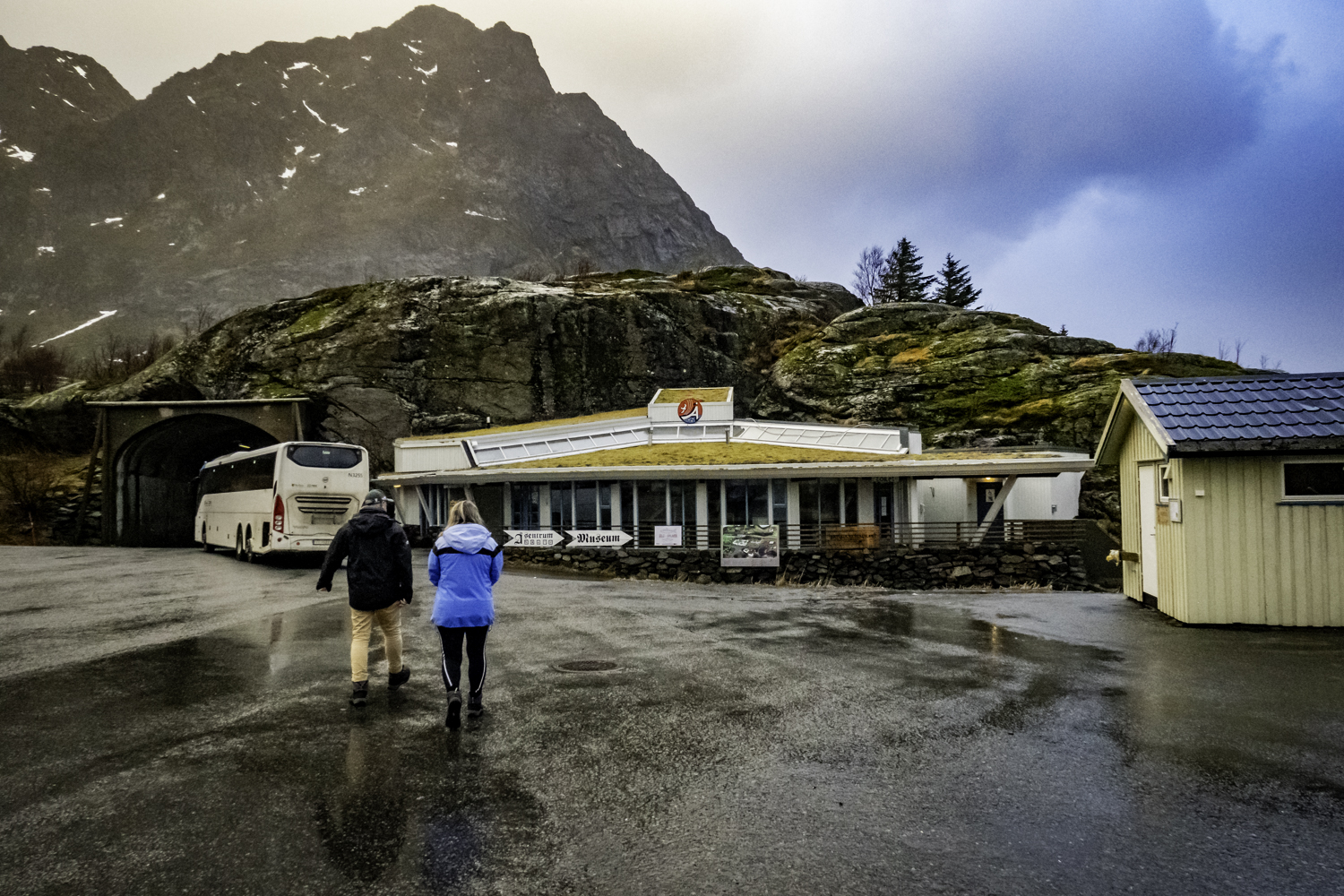 Today we board the bus without luggage as we will return here tonight. We are off to see more of the Lofoten Islands and possibly another WWII museum. It is raining lightly. We travel to “A” (yes, that’s the name!) at the end of the road after driving through another tunnel in the Lofoten Islands. We see bridges, islands and fish farms. The tunnel at the end opens to a parking lot. There is a Kafe here and rest rooms. We stop for pics and a comfort stop.