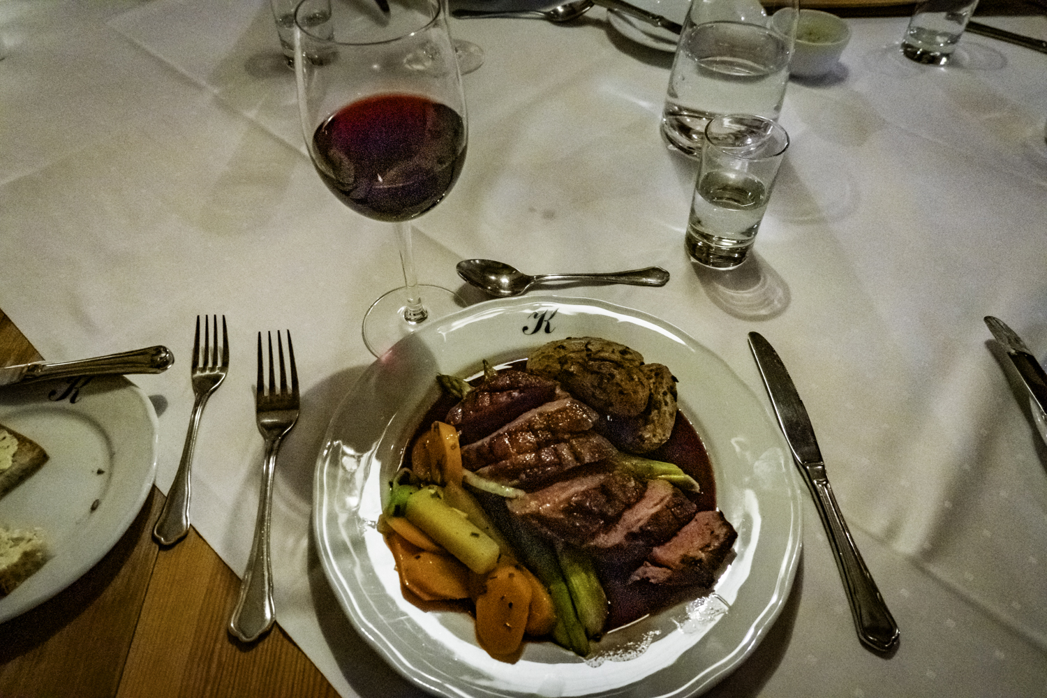 We eat dinner in the closest restaurant tonight to avoid the rain and have duck and halibut.