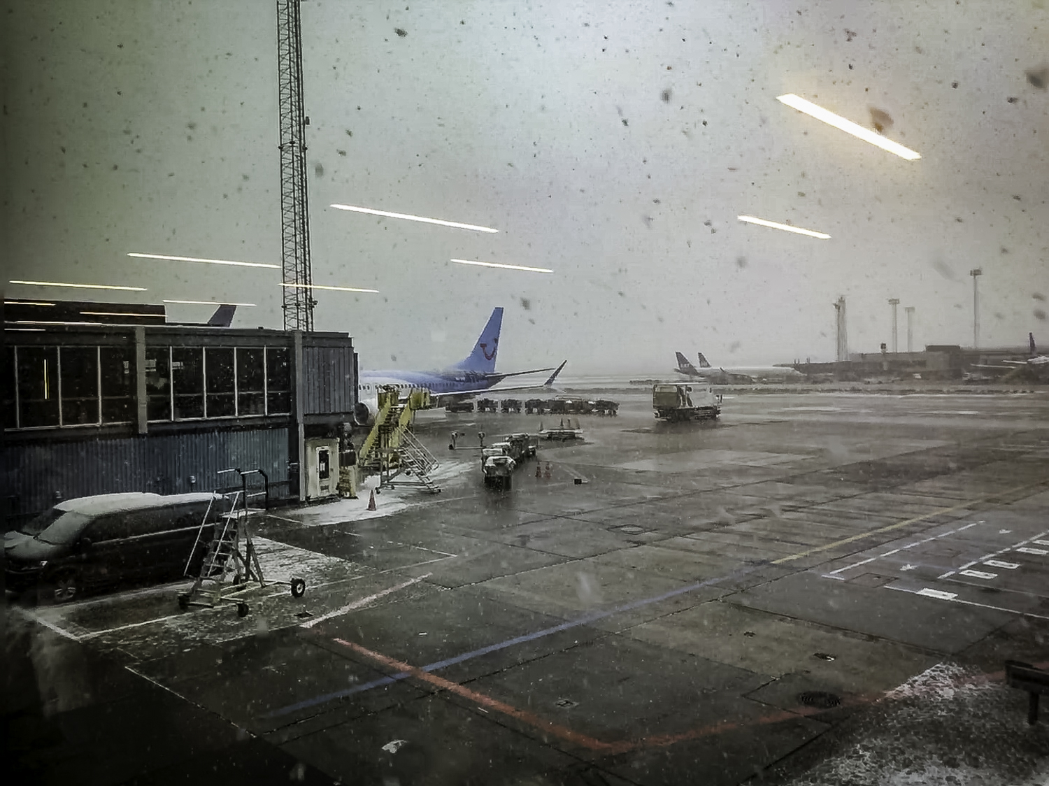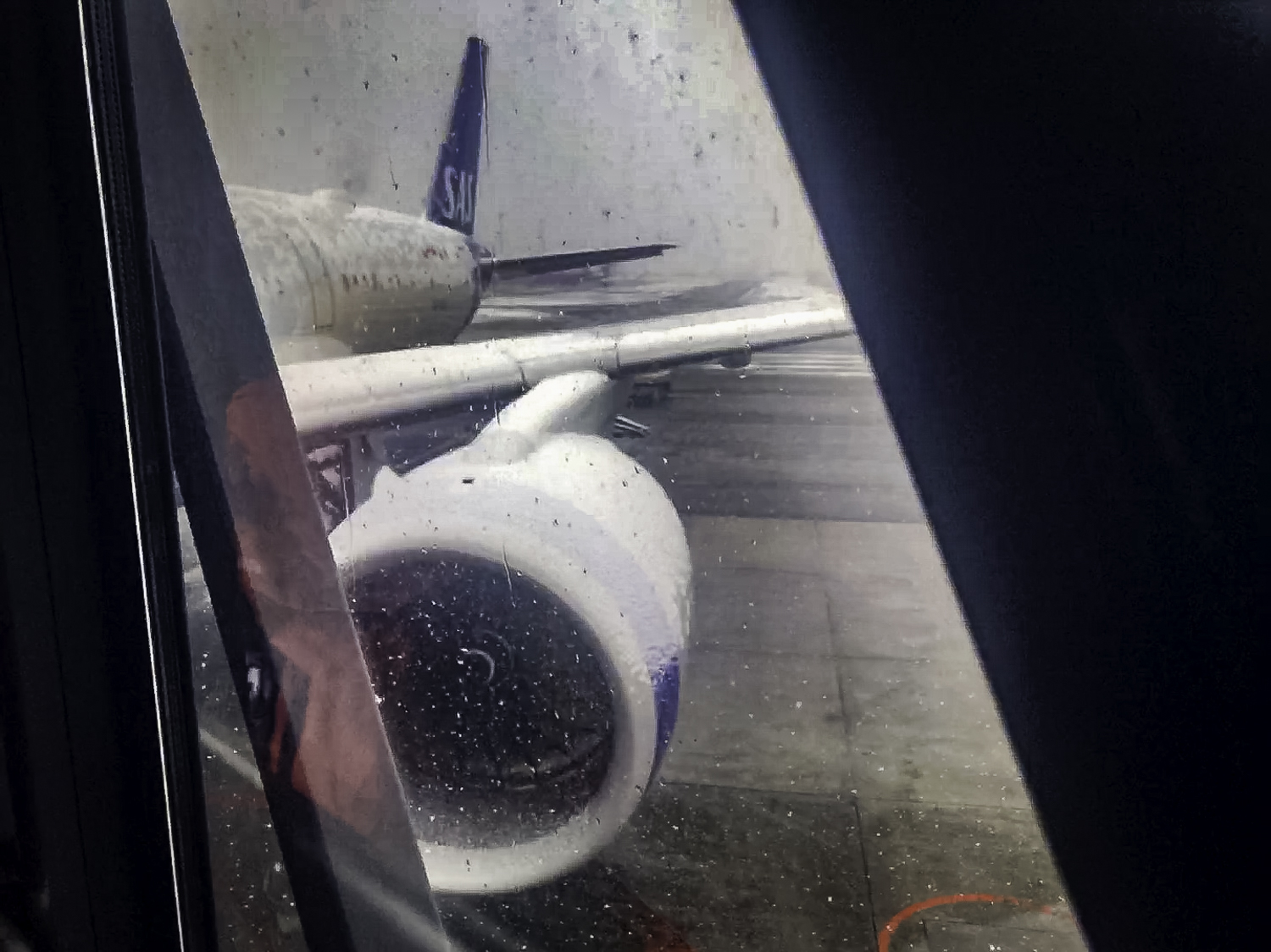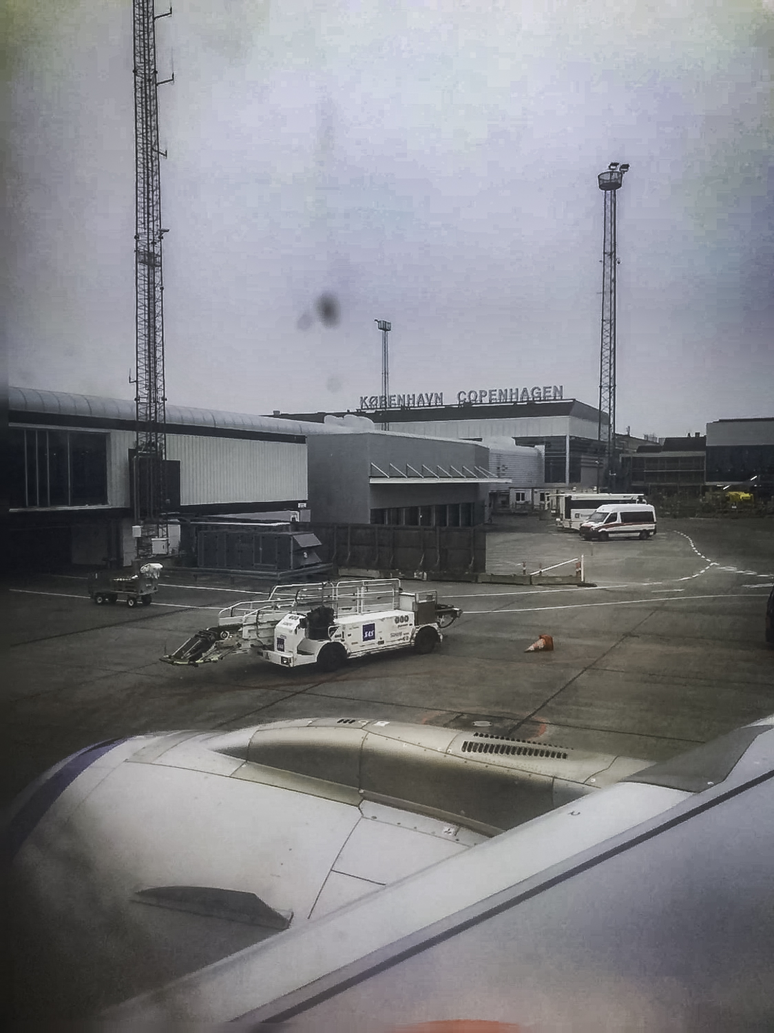 It’s snowing in Copenhagen. We have about an hour until boarding. By the time we board, it’s snowing harder. The top of the plane and the windows are covered in snow! We board and are delayed an hour at the gate. Suddenly there is something happening, something is pouring on the plane. Rusty red fluids run down over the windows. It turns out we are being de-iced. I guess that means we will be taking off soon. It’s a strange situation though.