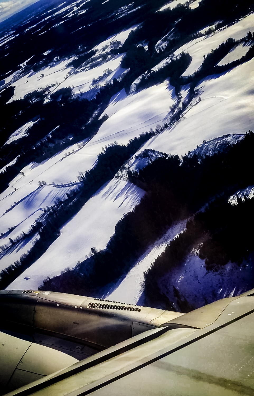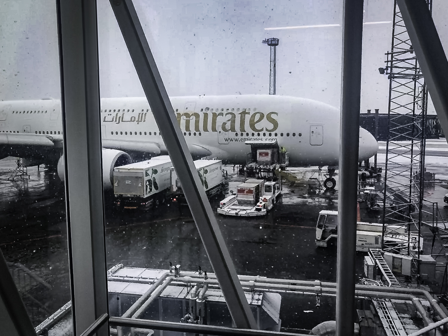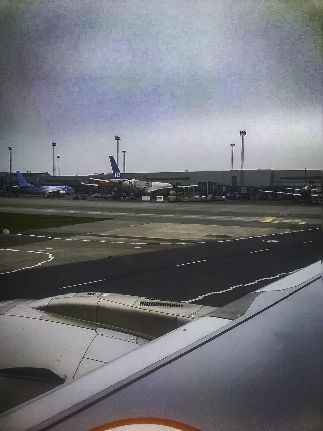 It’s snowing in Copenhagen. We have about an hour until boarding. By the time we board, it’s snowing harder. The top of the plane and the windows are covered in snow! We board and are delayed an hour at the gate. Suddenly there is something happening, something is pouring on the plane. Rusty red fluids run down over the windows. It turns out we are being de-iced. I guess that means we will be taking off soon. It’s a strange situation though.