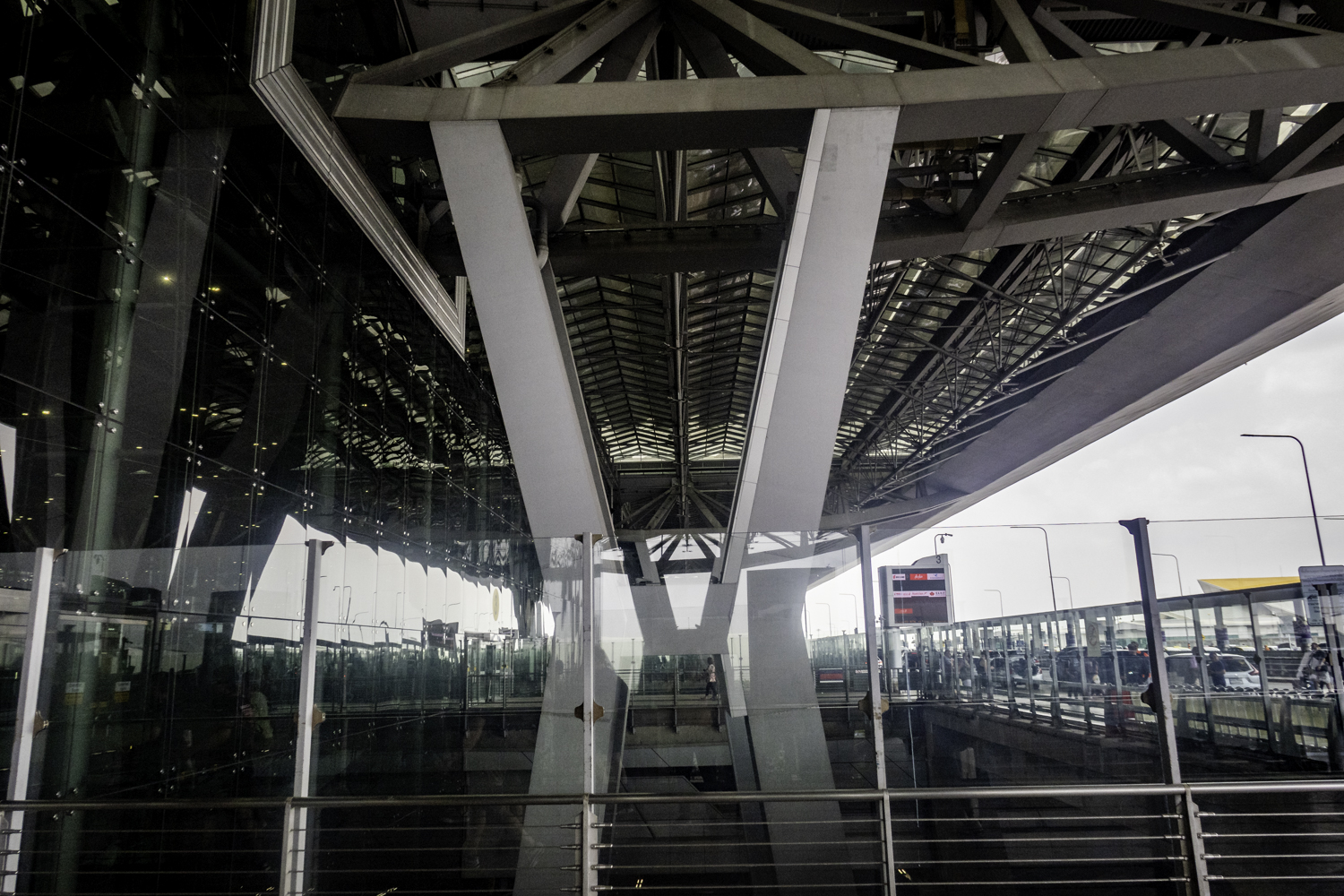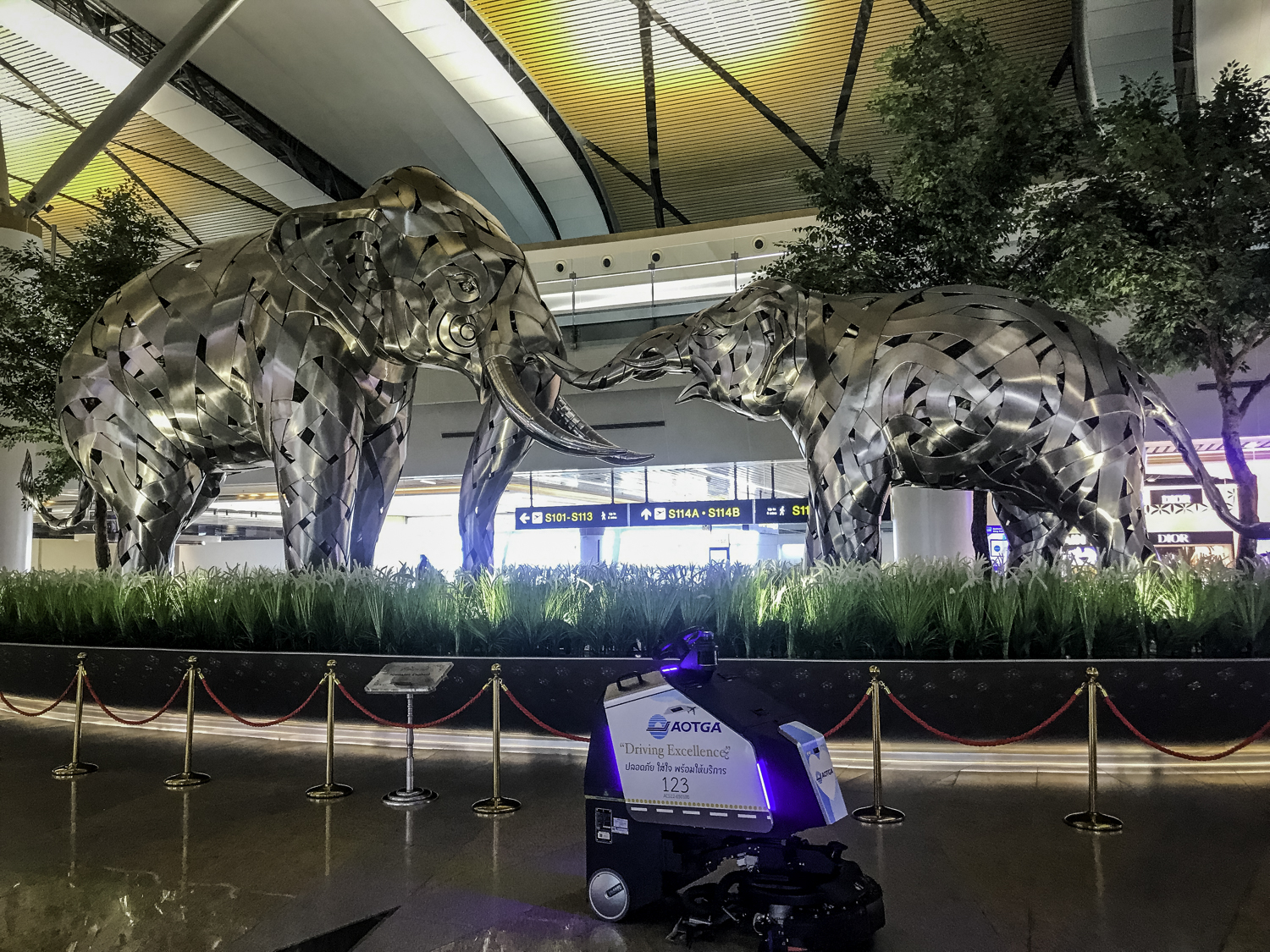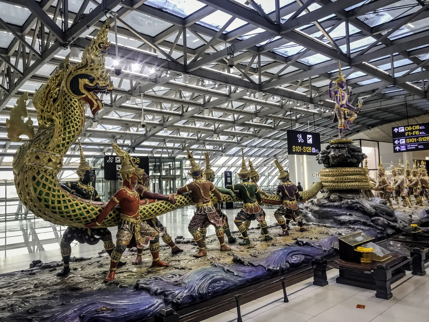 The airport in Bangkok is interesting. Suvarnabhumi Airport. The decorations and displays are colorful and elaborate. This is Thailand’s biggest airport and is one of the coolest transportation hubs in the world. The facilities are excellent and there are daily flights to every continent. Around 58 million passengers travel through Suvarnabhumi Airport every year. We walk quite a ways and then have to ride a tram bus.