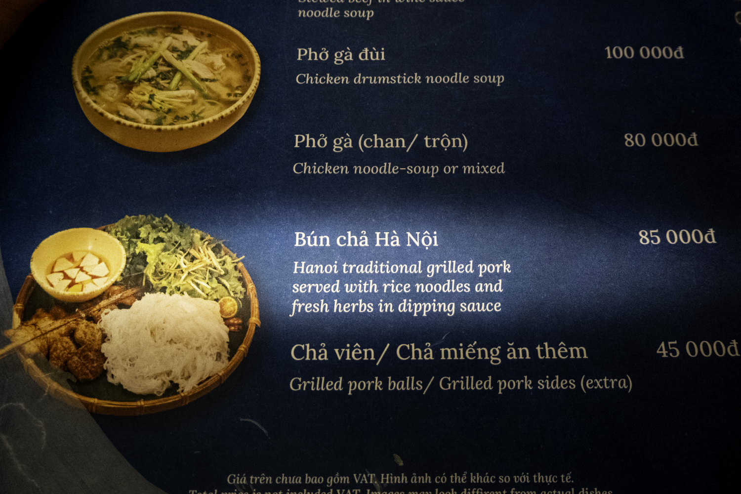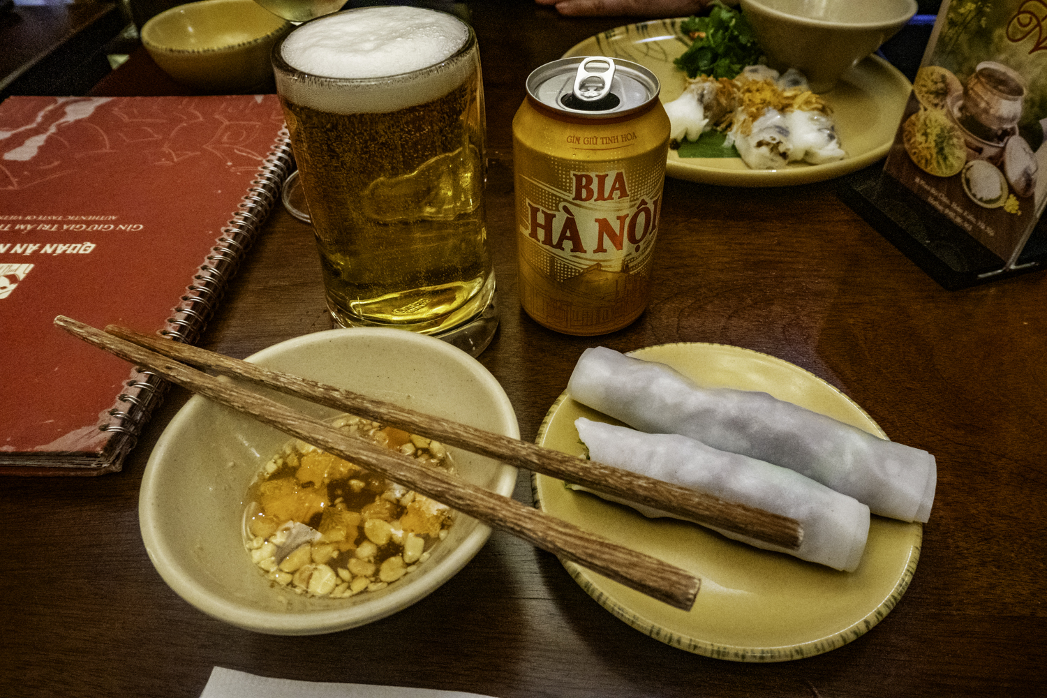 We get oriented and in our room on the 10th floor. We walk a half block to a recommended restaurant, Quan An Ngon, for dinner. We have Bun cha Ha Noi and Nem cua be and I have a Bia Ha Noi. Anthony Bourdain recommended these dishes and they are very tasty!