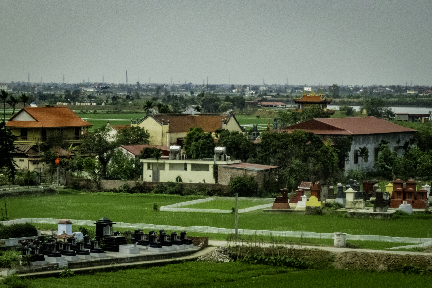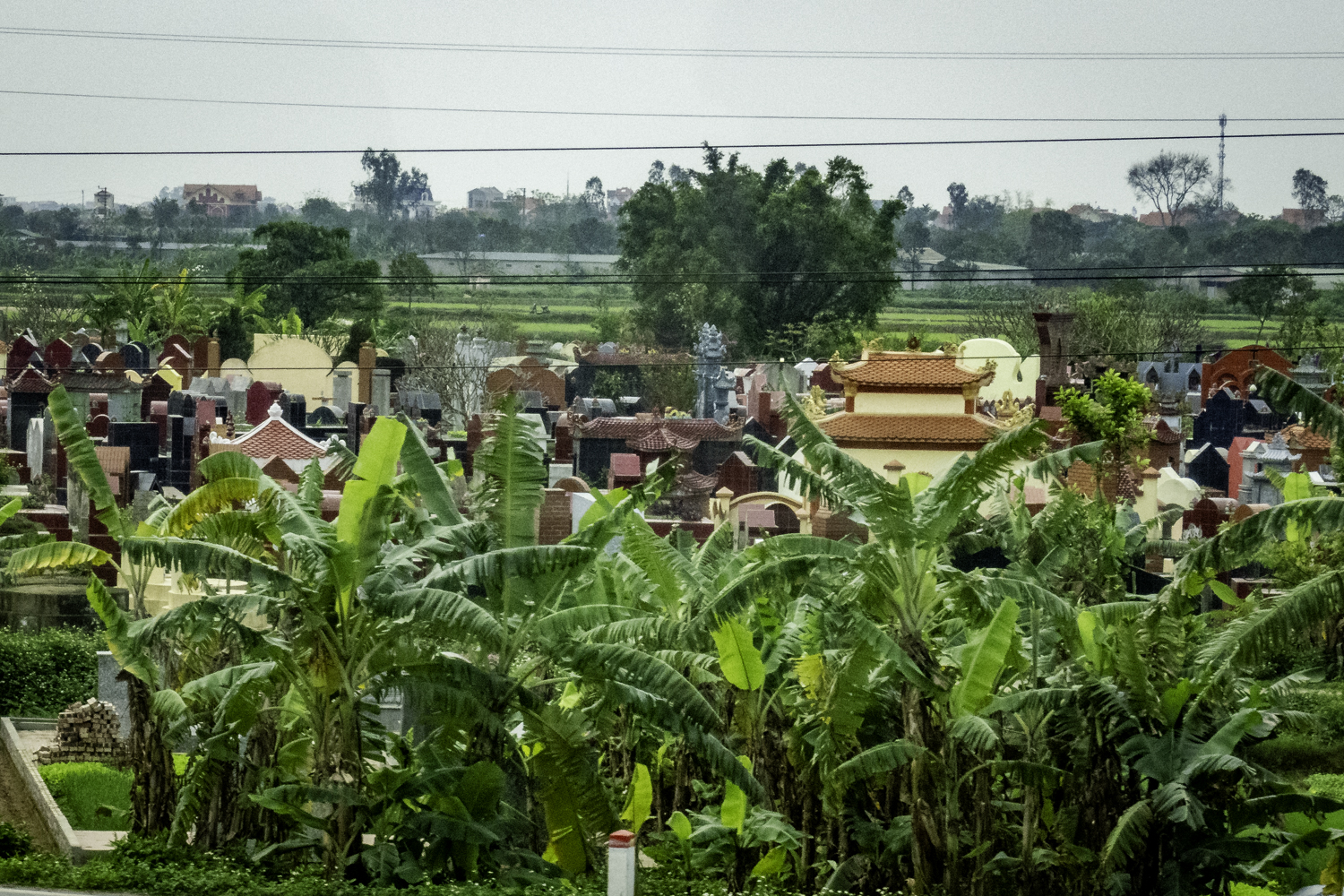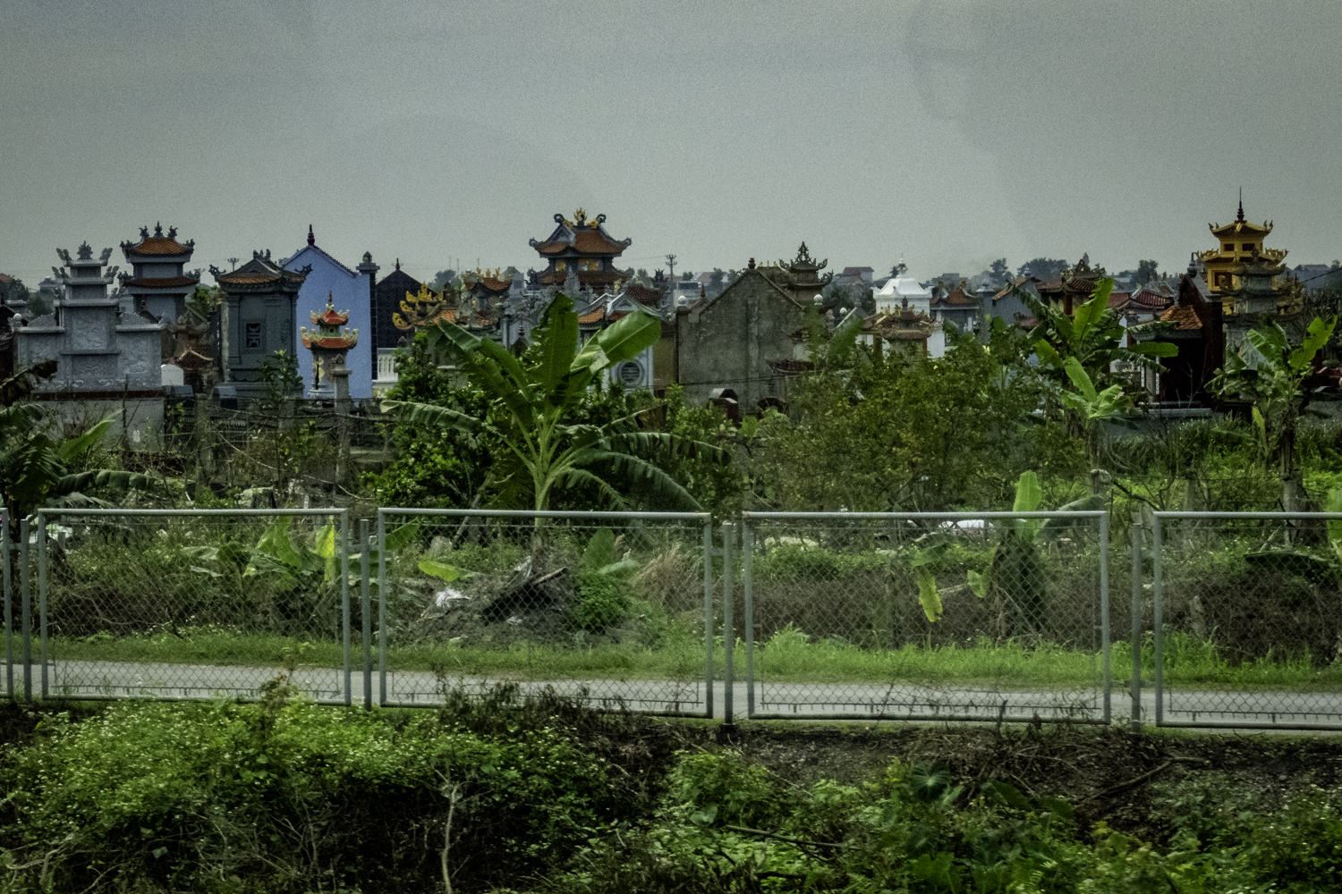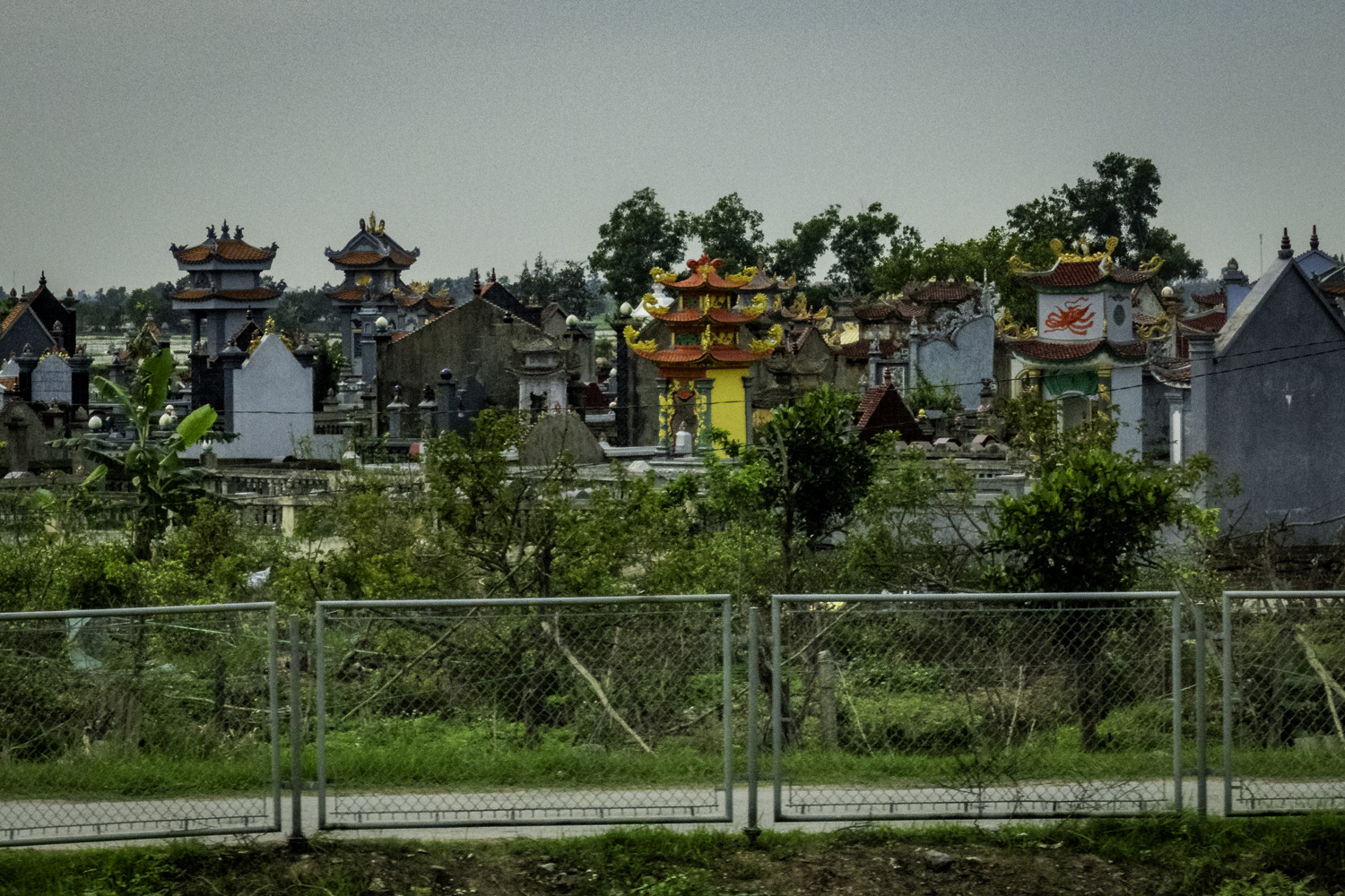 The Breakfast Buffet today is very good again. After we eat, we go up to our room and pack up our bags. We also pack a day bag for our next adventure. The hotel will store our bags for us. We board the bus at 9:00 AM and drive off towards the next part of the tour. It will be a 3 hour bus ride. The sights are interesting on the drive through rice paddies with sights of what appears to be antennas that crudely look like fake trees and graveyards and memorials in the rice paddies!