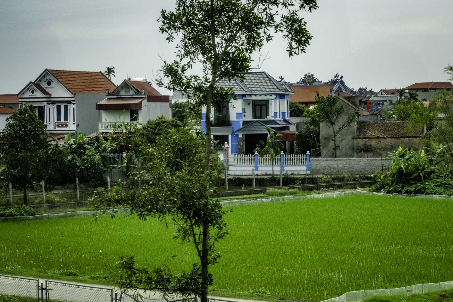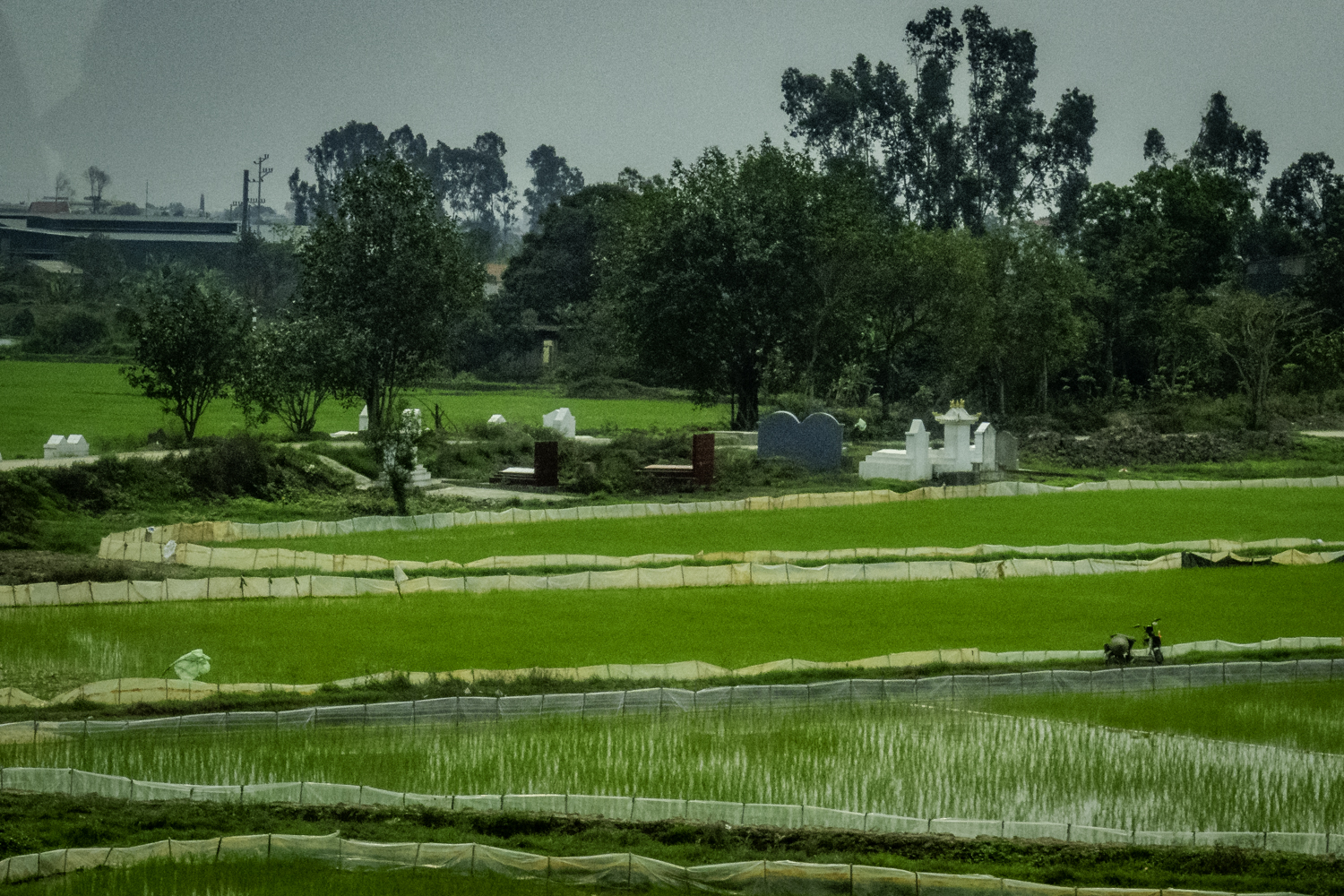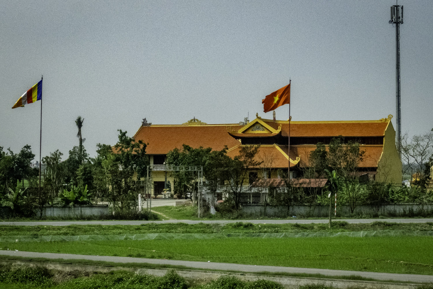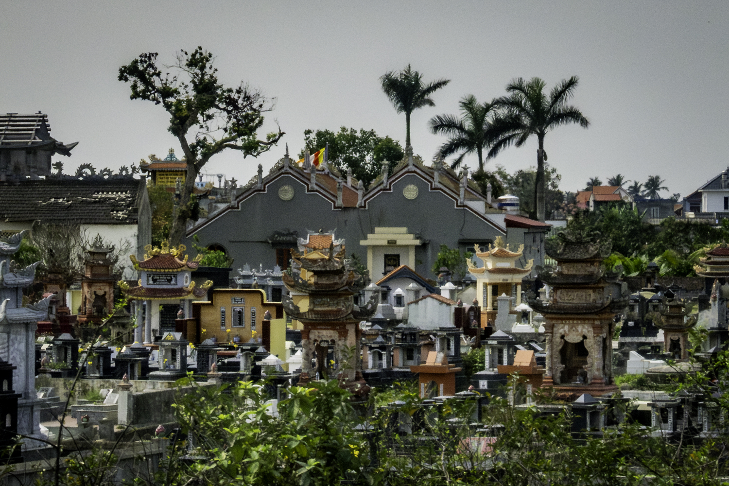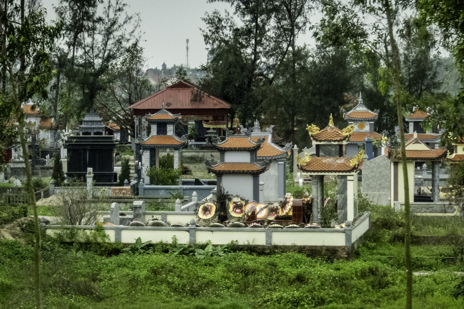 The Breakfast Buffet today is very good again. After we eat, we go up to our room and pack up our bags. We also pack a day bag for our next adventure. The hotel will store our bags for us. We board the bus at 9:00 AM and drive off towards the next part of the tour. It will be a 3 hour bus ride. The sights are interesting on the drive through rice paddies with sights of what appears to be antennas that crudely look like fake trees and graveyards and memorials in the rice paddies!