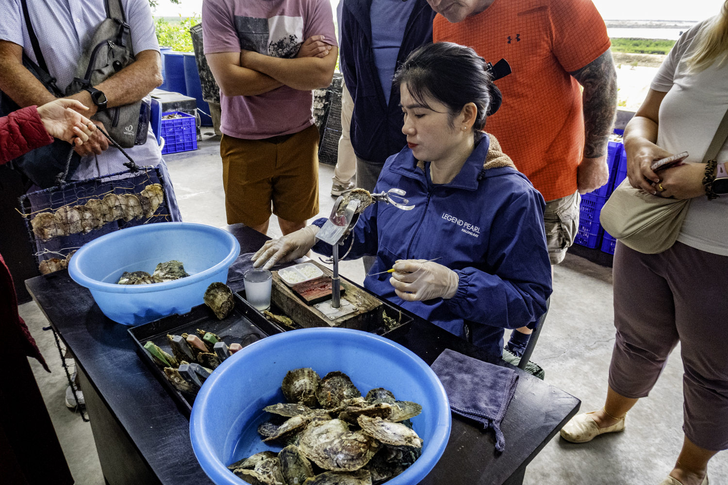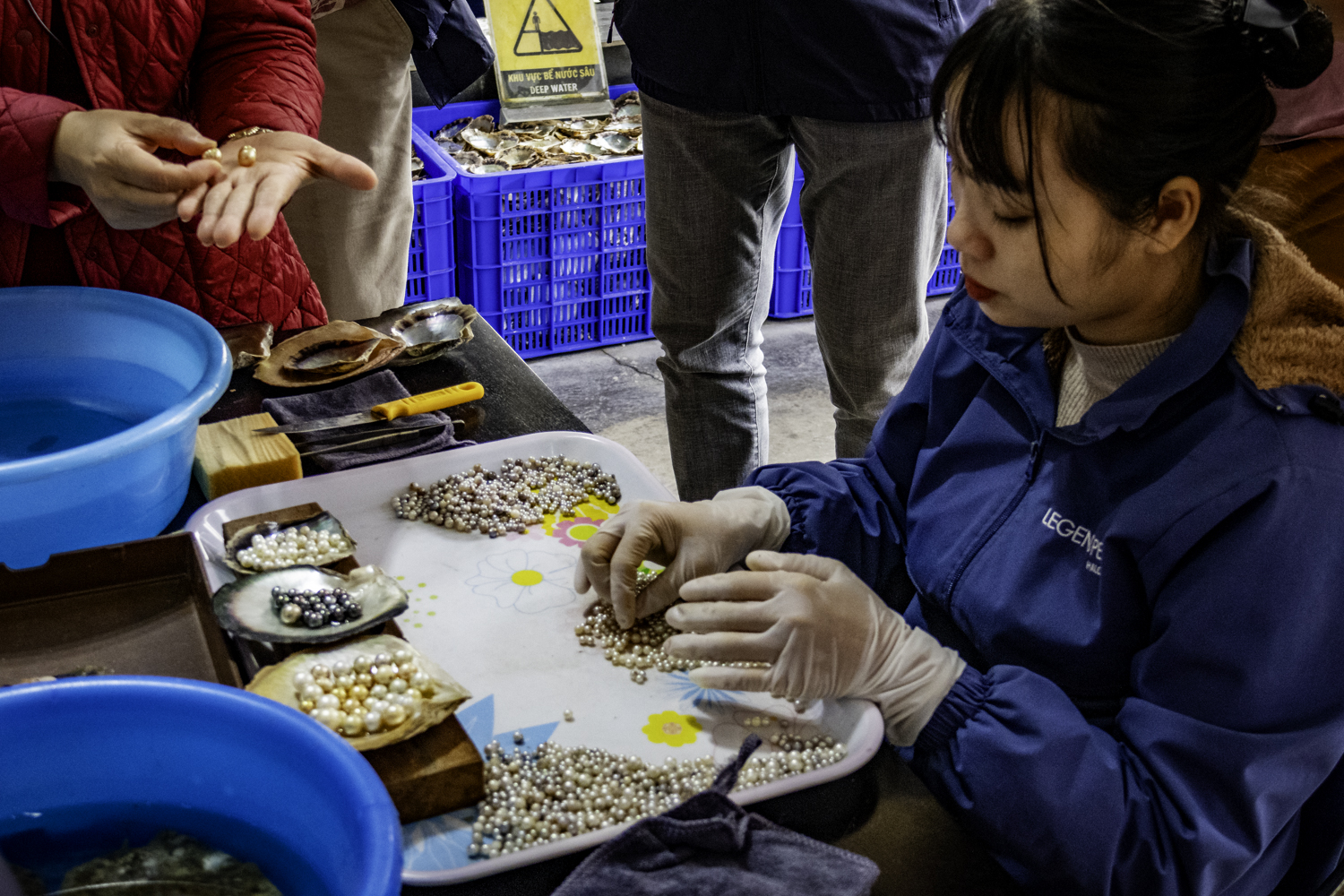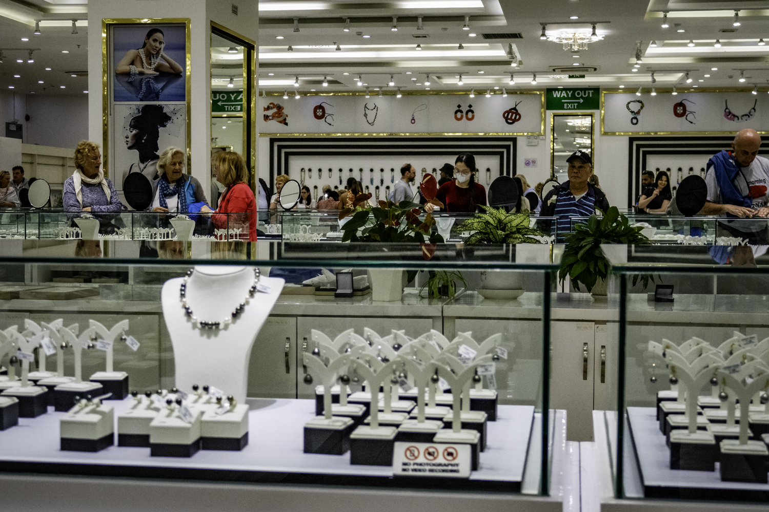 We make a stop to visit a pearl factory where pearls are harvested from oysters and sorted for size and color. Then they are made into jewelry of all kinds. We get to watch workers removing the pearls and sort them.