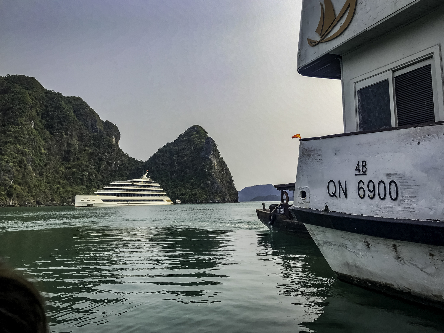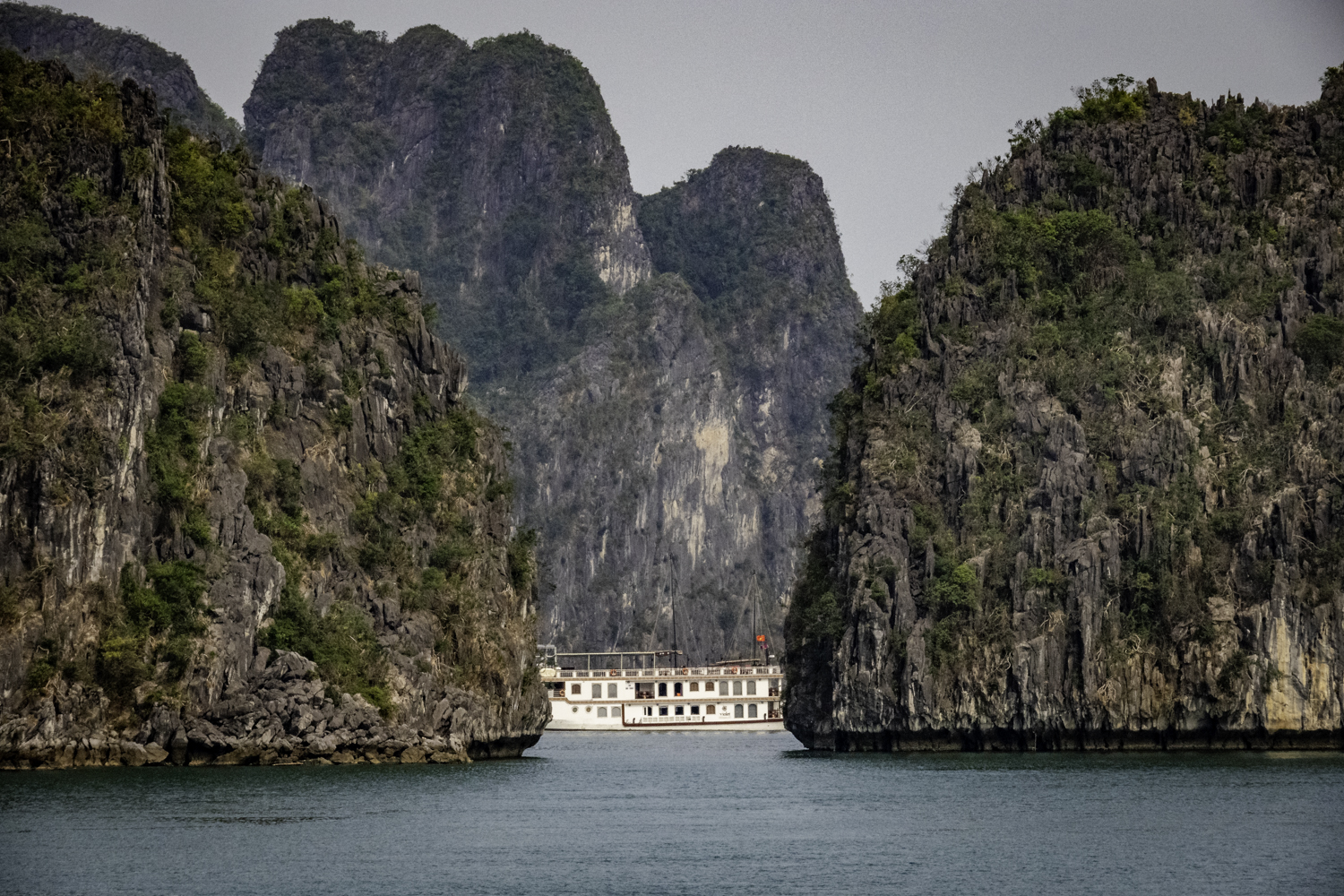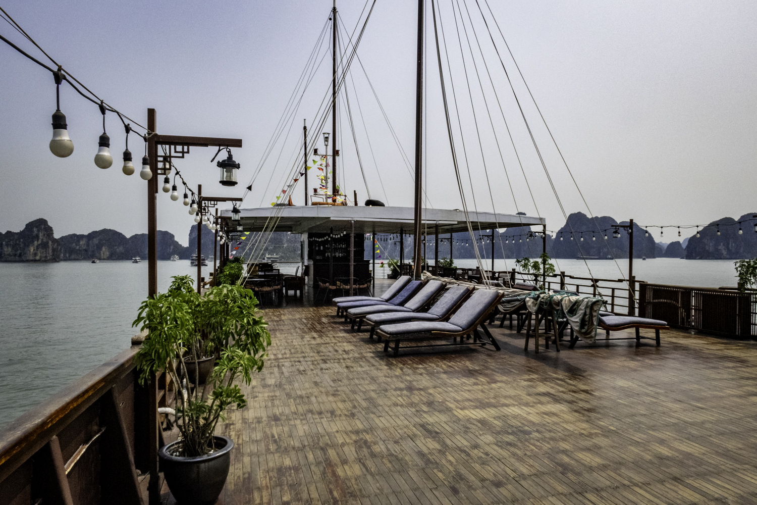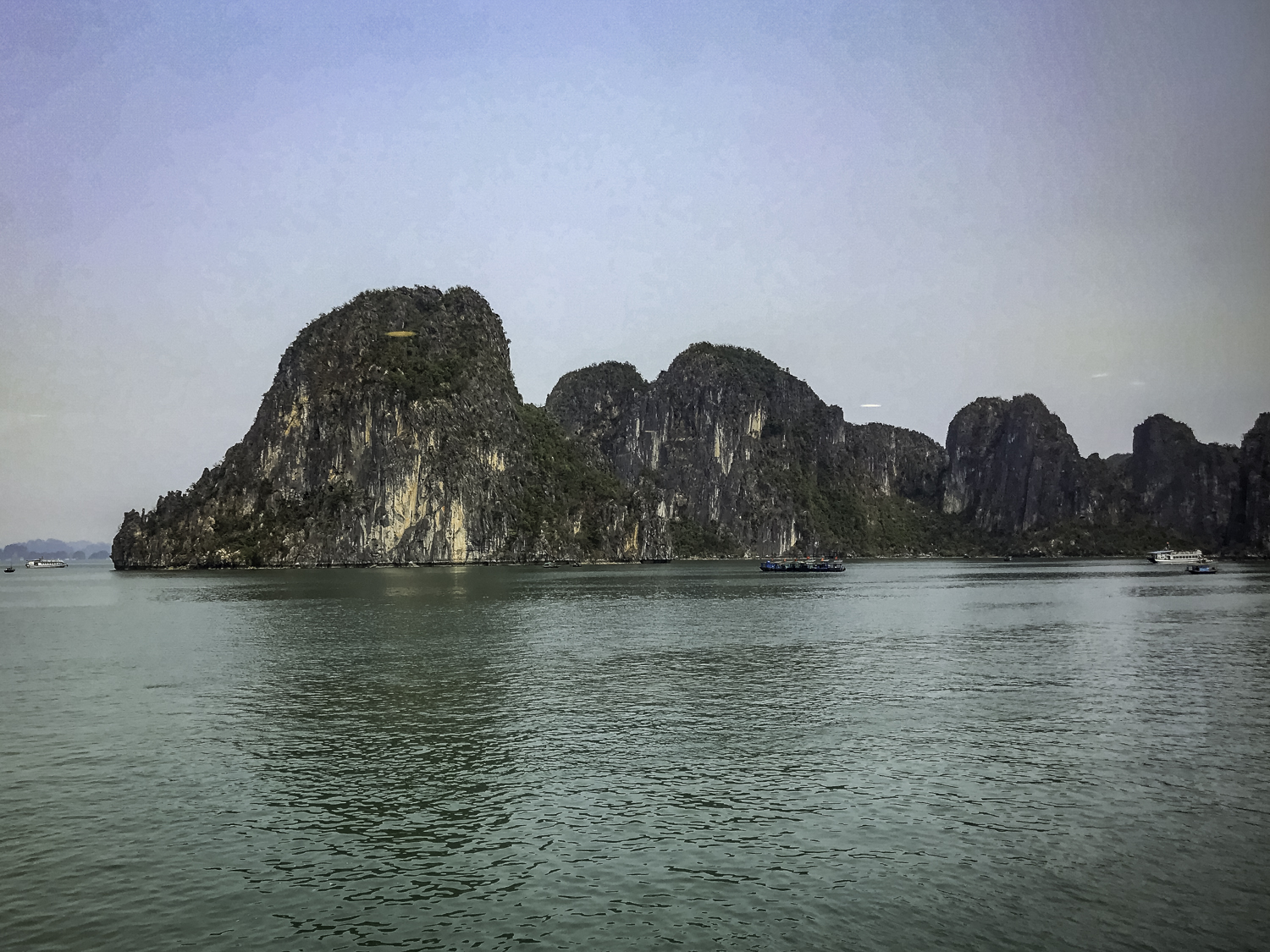 I go up on top and get started with Happy Hour early. A glass of wine in hand, my camera in the other, I watch the world go by! At least I watch Ha Long Bay go by. I even spot a large cruise ship in the distance.