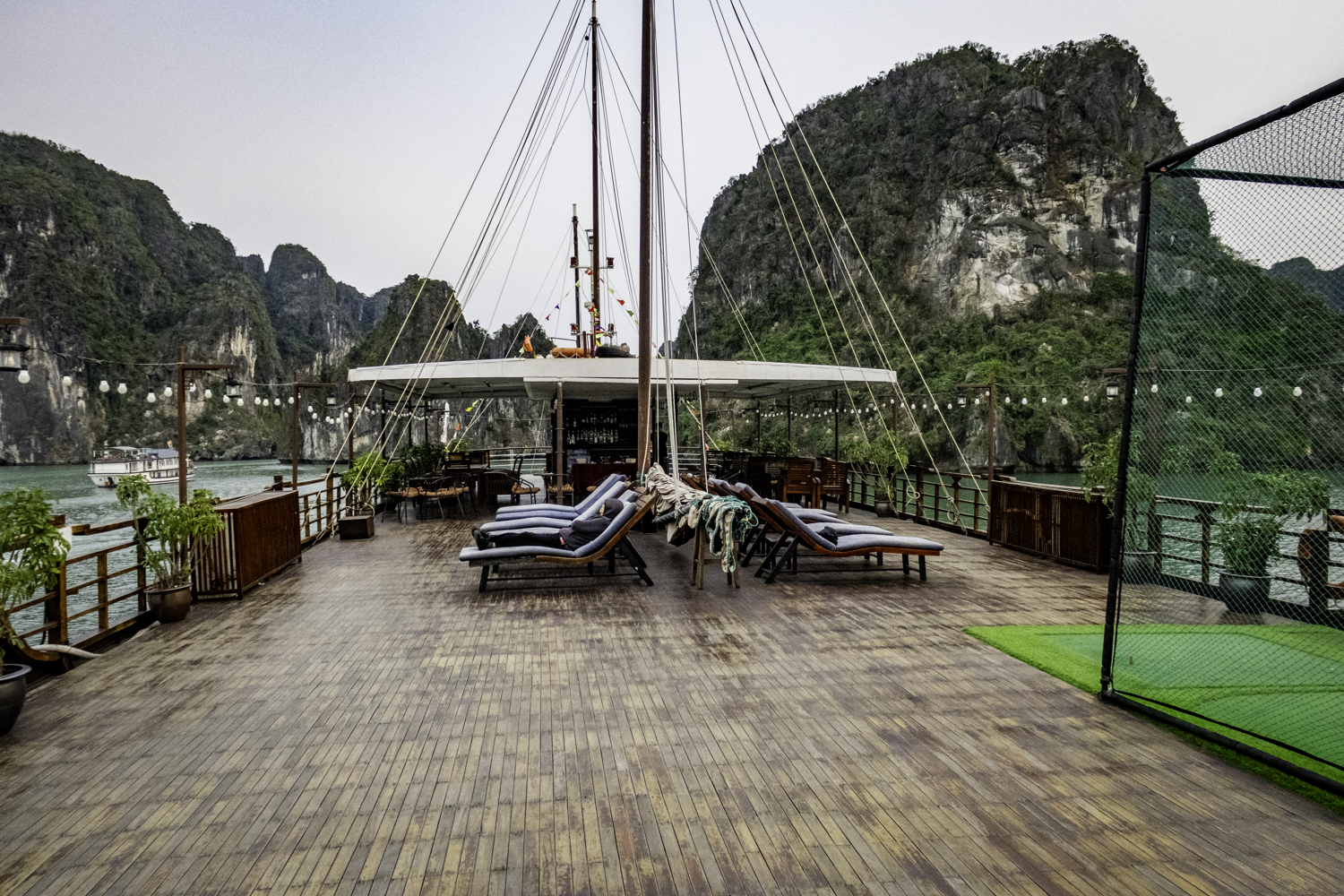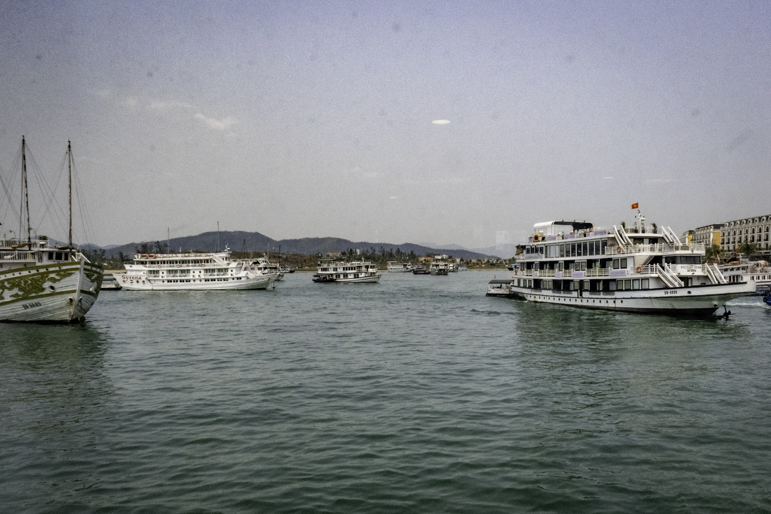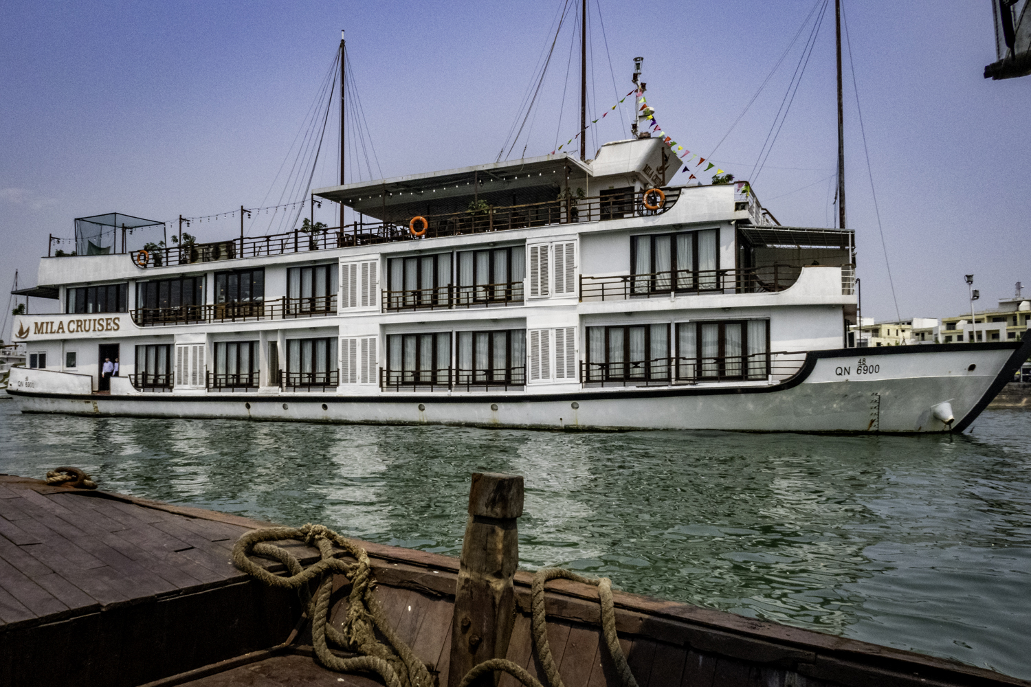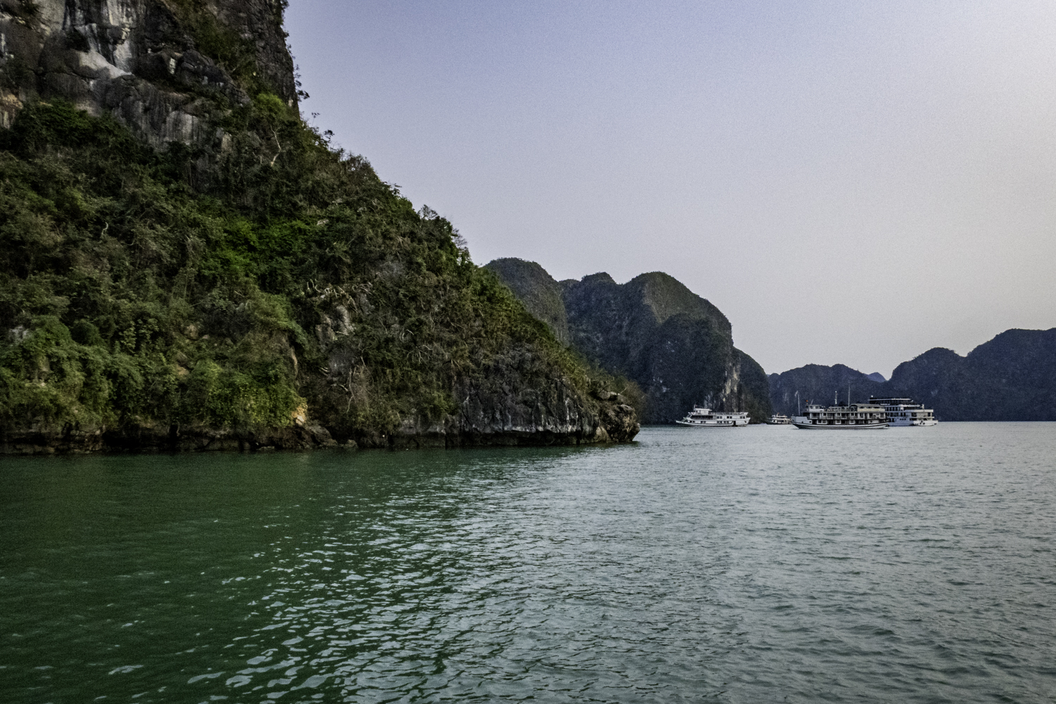 I go up on top and get started with Happy Hour early. A glass of wine in hand, my camera in the other, I watch the world go by! At least I watch Ha Long Bay go by. I even spot a large cruise ship in the distance.