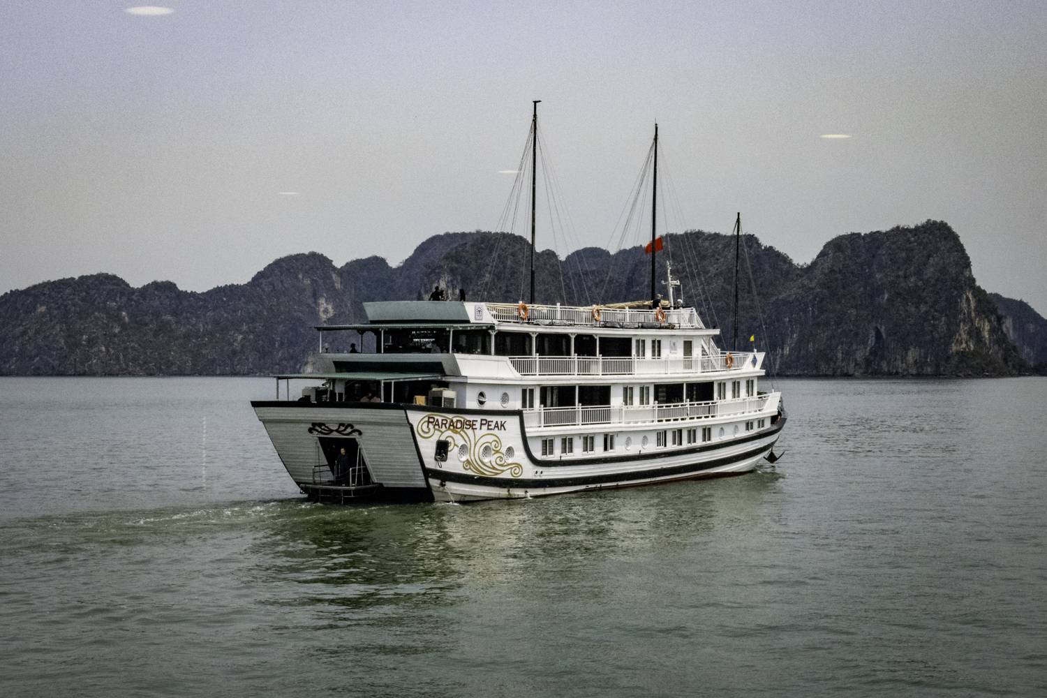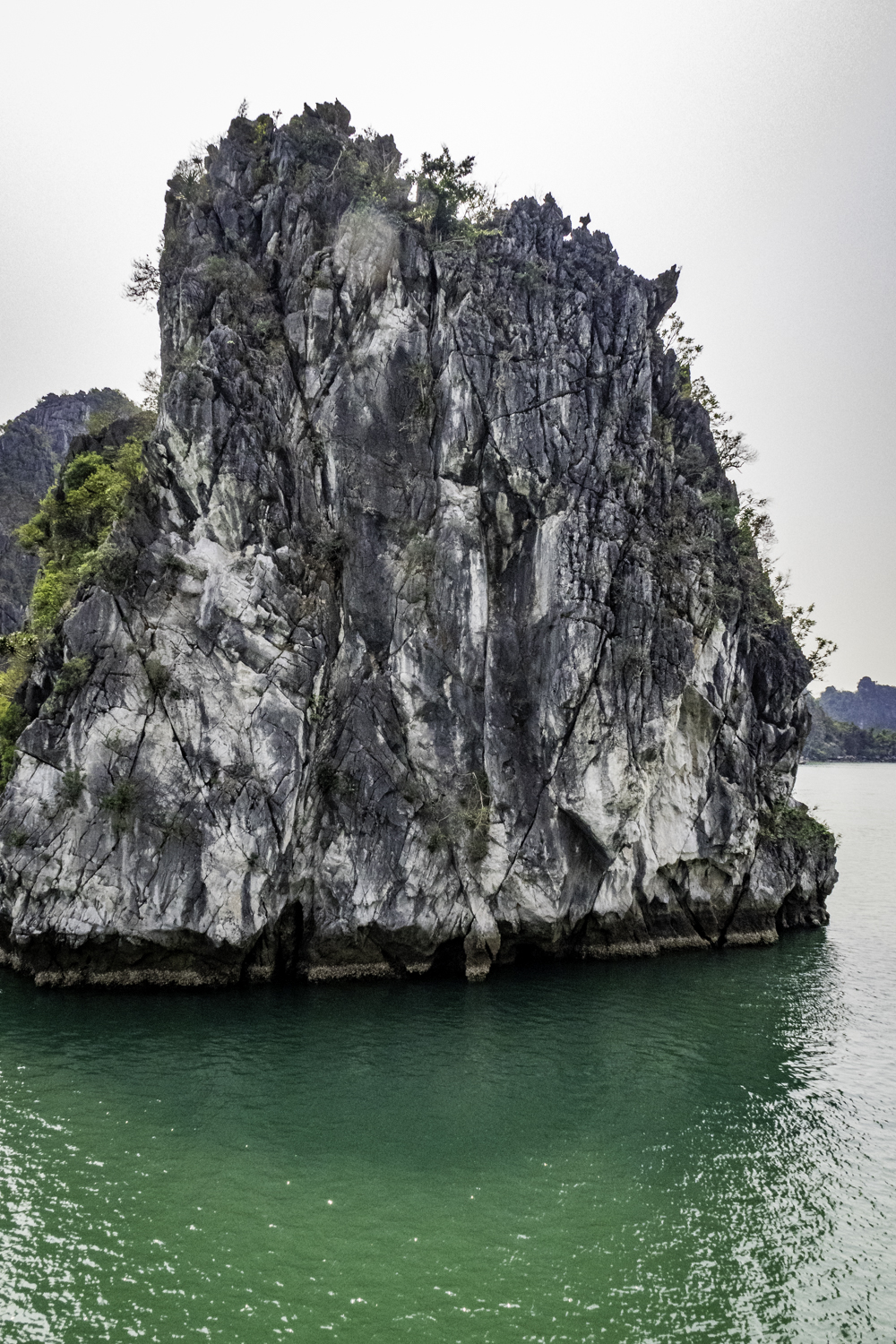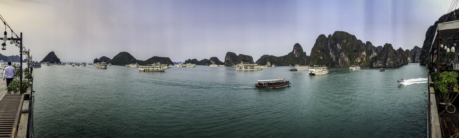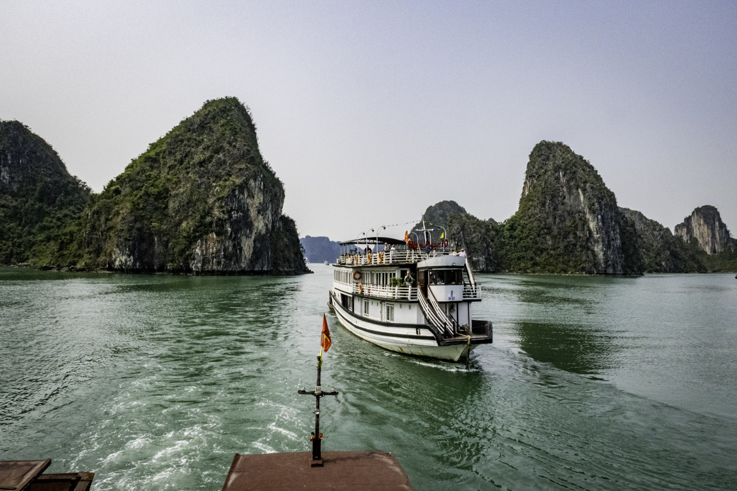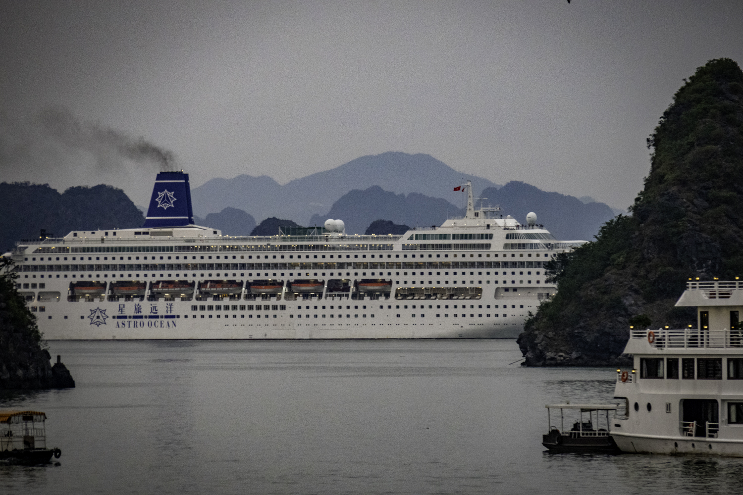 I go up on top and get started with Happy Hour early. A glass of wine in hand, my camera in the other, I watch the world go by! At least I watch Ha Long Bay go by. I even spot a large cruise ship in the distance.