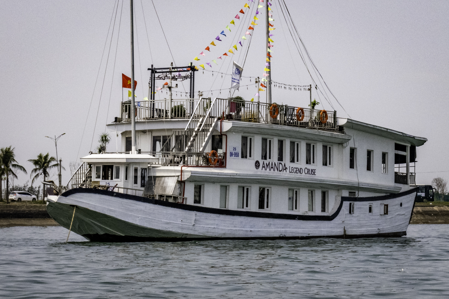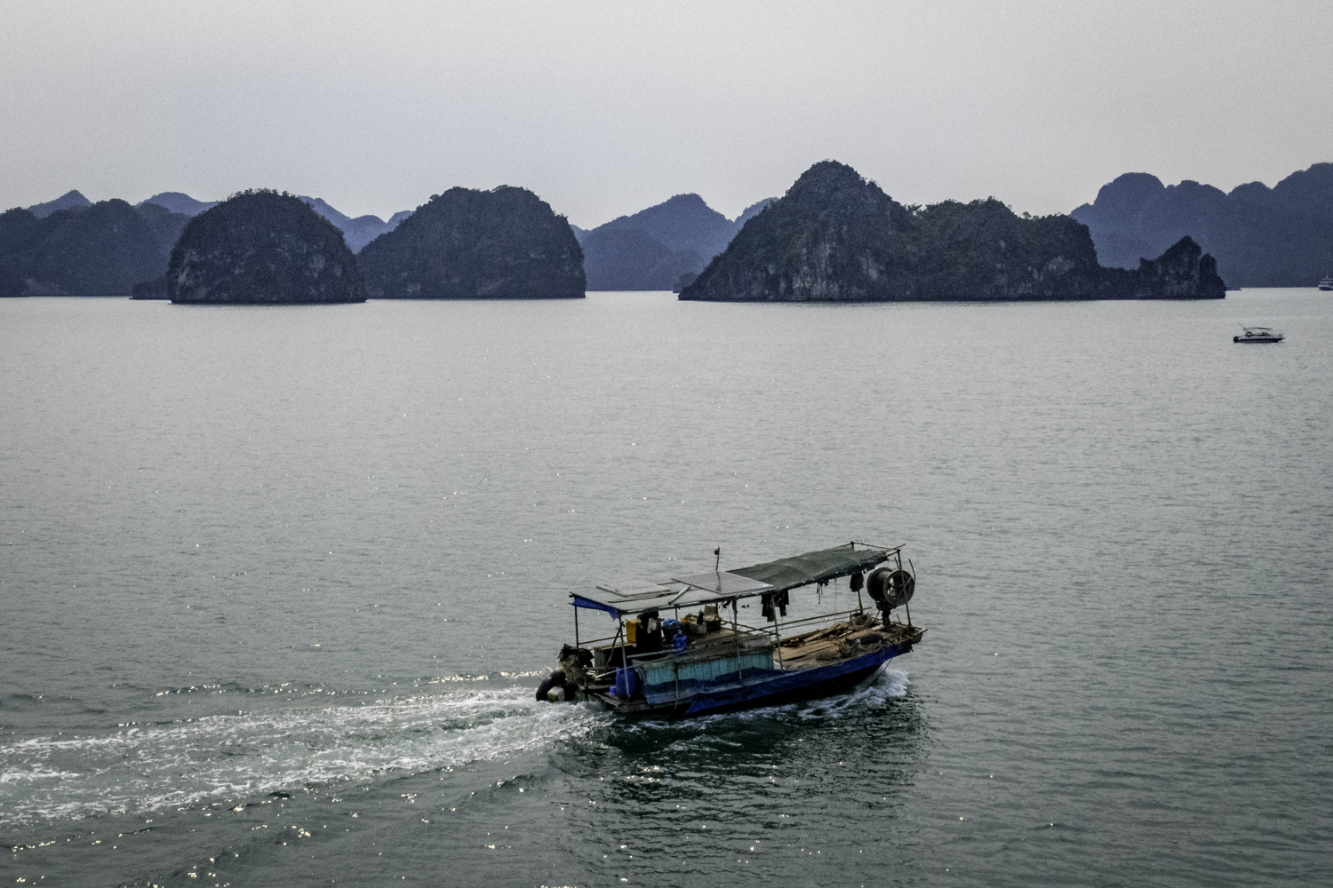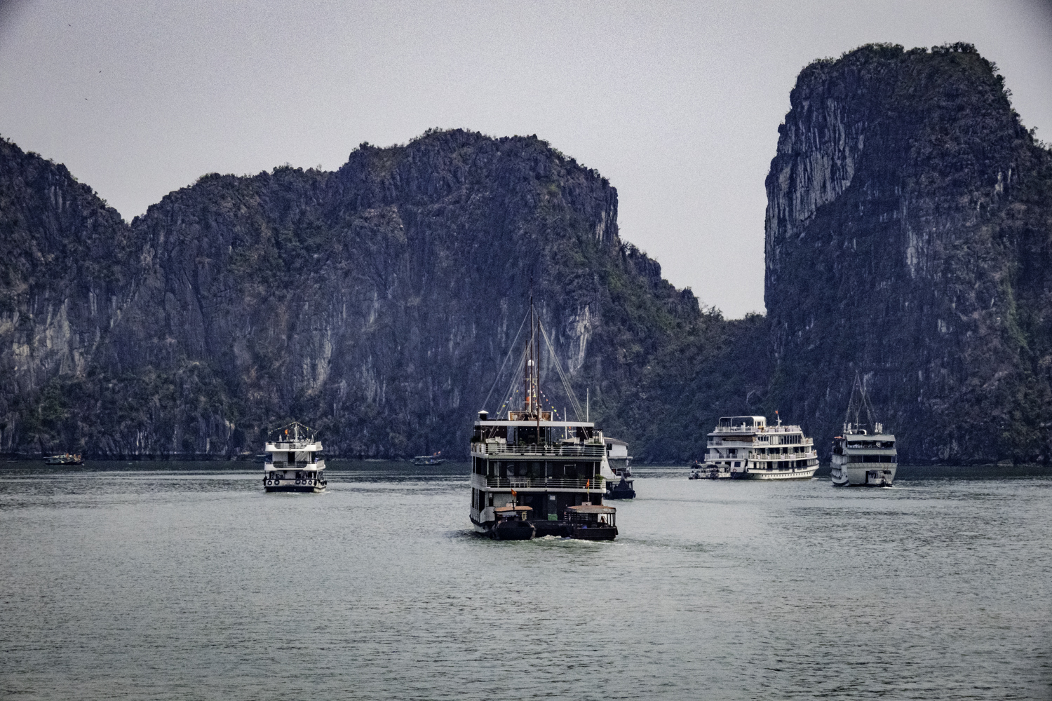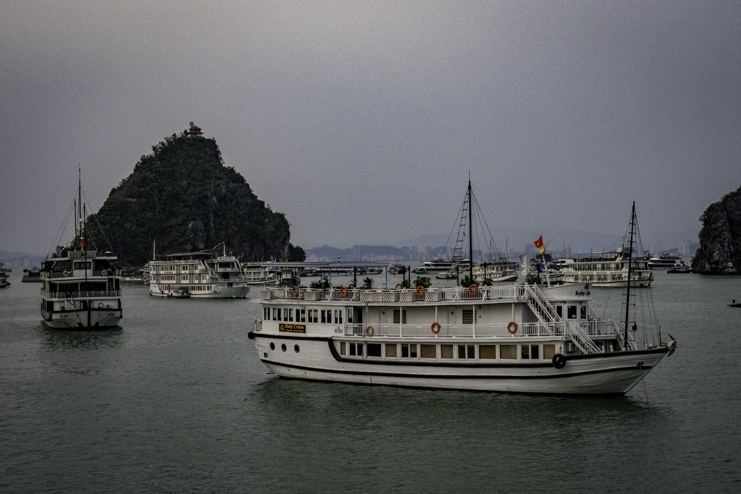 I go up on top and get started with Happy Hour early. A glass of wine in hand, my camera in the other, I watch the world go by! At least I watch Ha Long Bay go by. I even spot a large cruise ship in the distance.