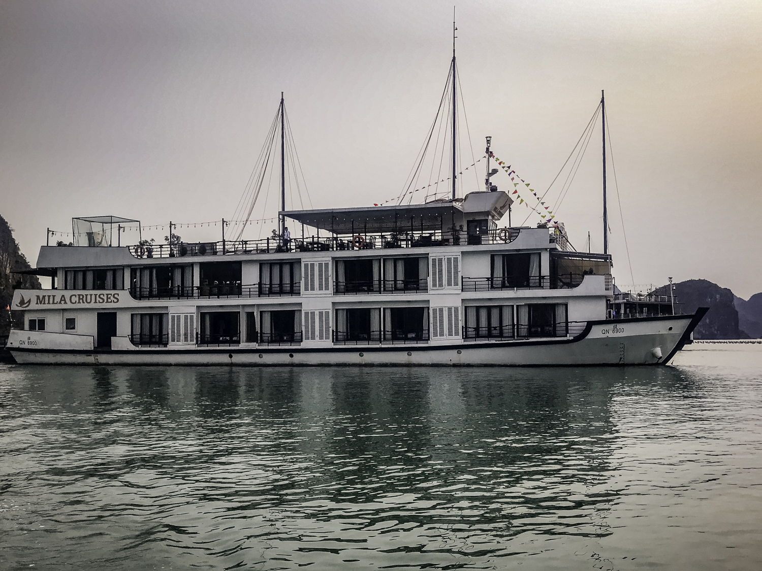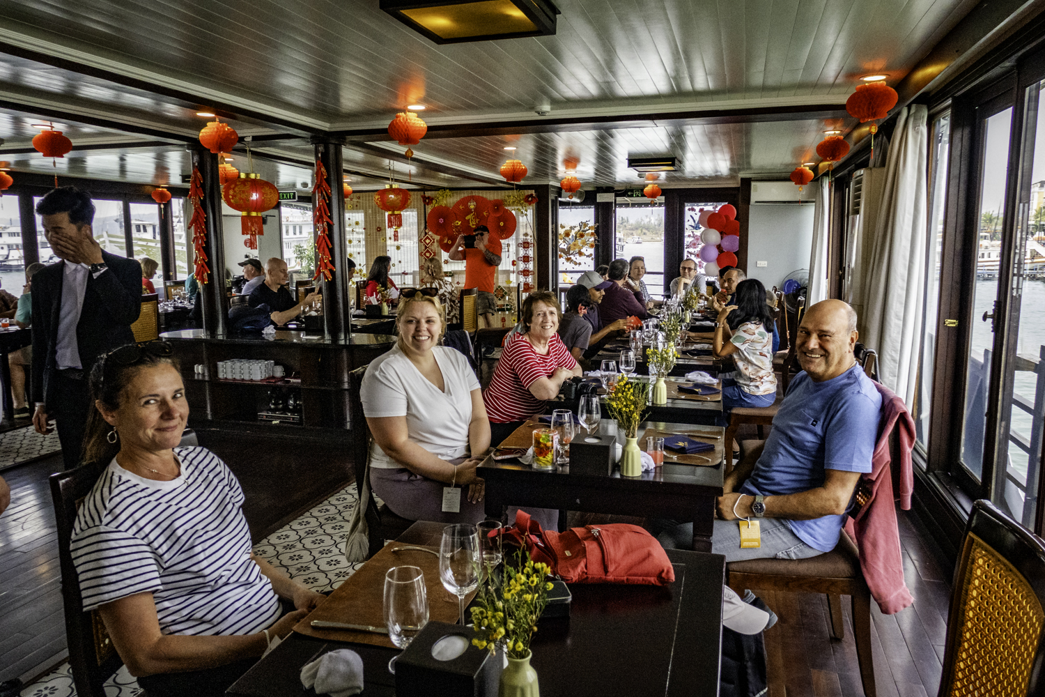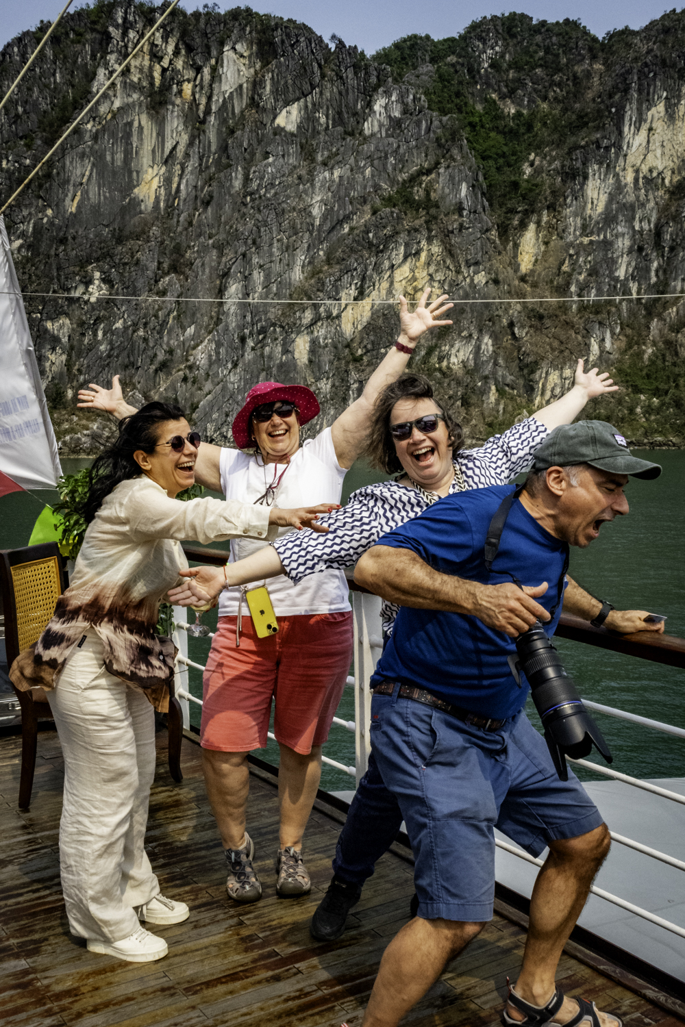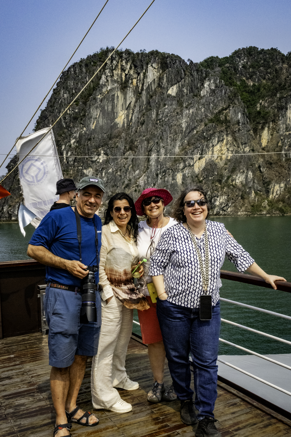 We board a small boat that takes us to an authentic Chinese Junk (boat) that will be our home for the next 24 hours, the “Mila Cruises”. We have an orientation meeting and then have a fabulous buffet lunch on board. After, we go up to the top of the boat and entertain our cameras with the marvels of Ha Long Bay.