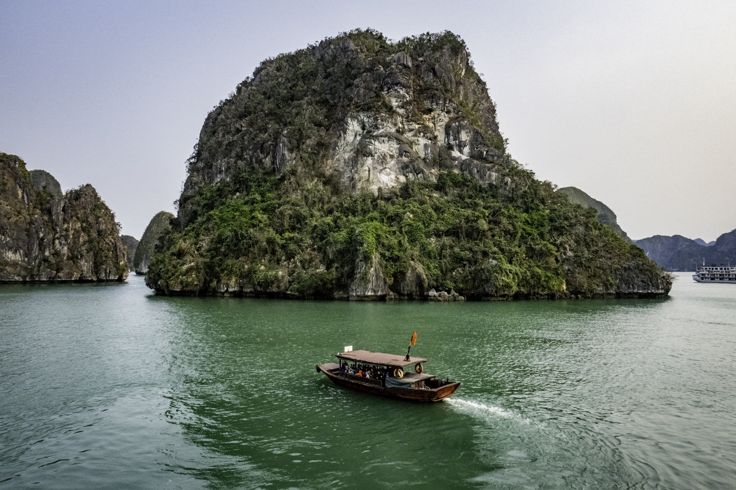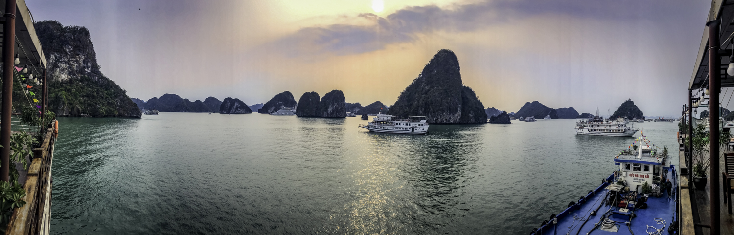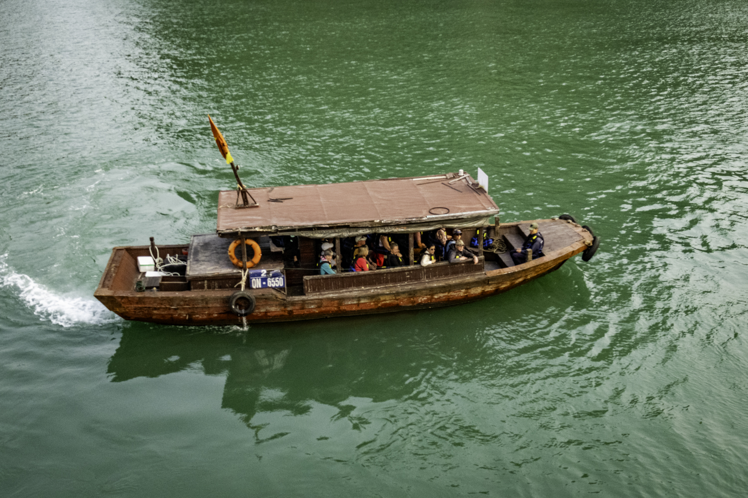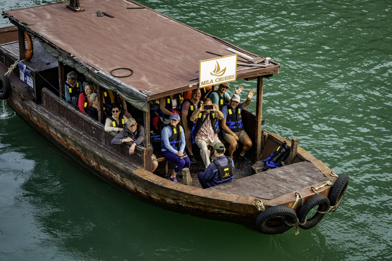 We board a small boat that takes us to an authentic Chinese Junk (boat) that will be our home for the next 24 hours, the “Mila Cruises”. We have an orientation meeting and then have a fabulous buffet lunch on board. After, we go up to the top of the boat and entertain our cameras with the marvels of Ha Long Bay.