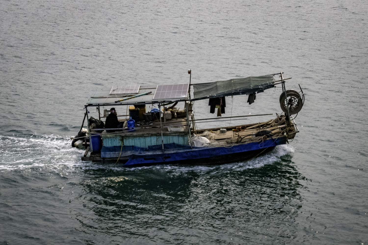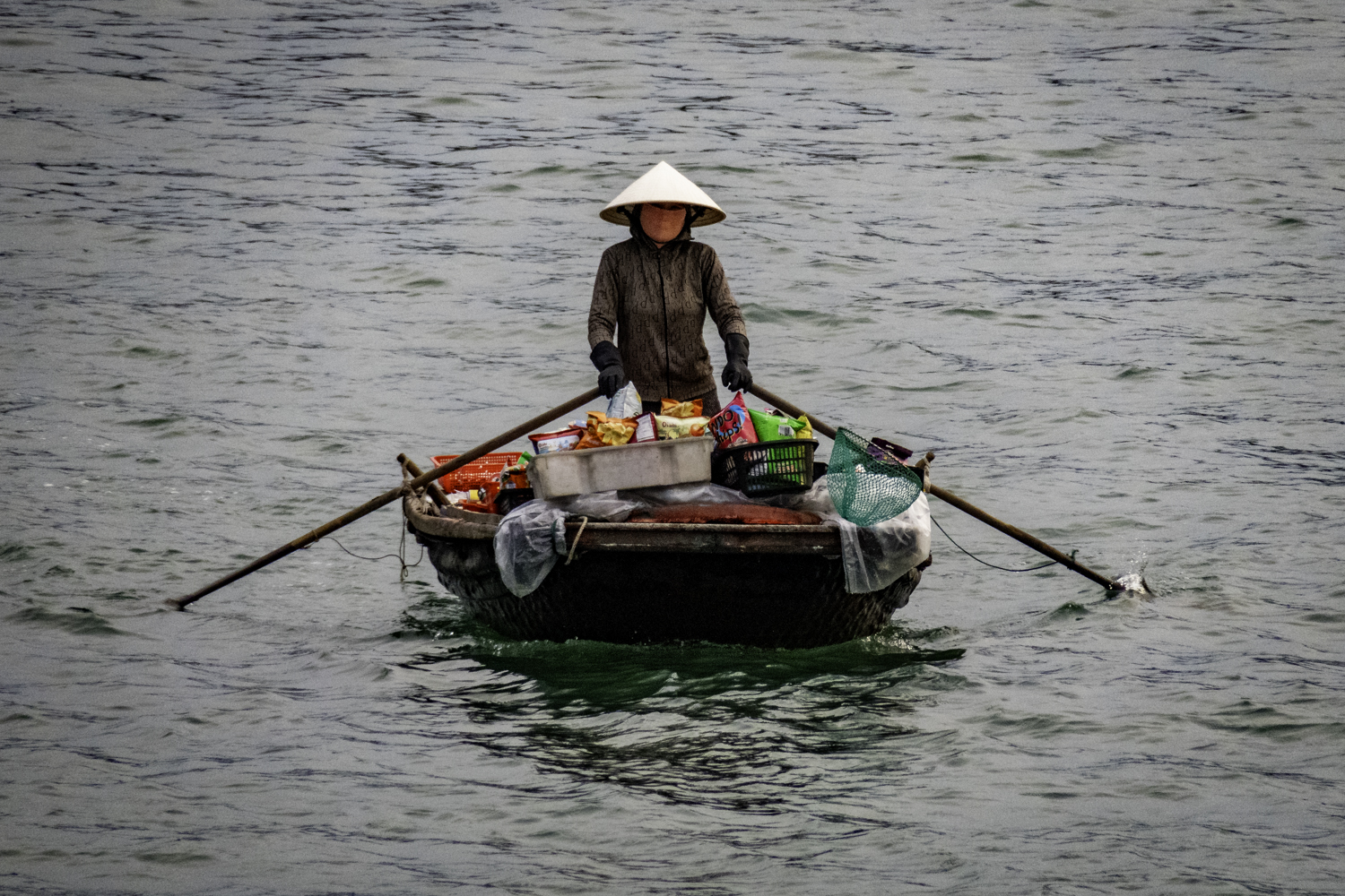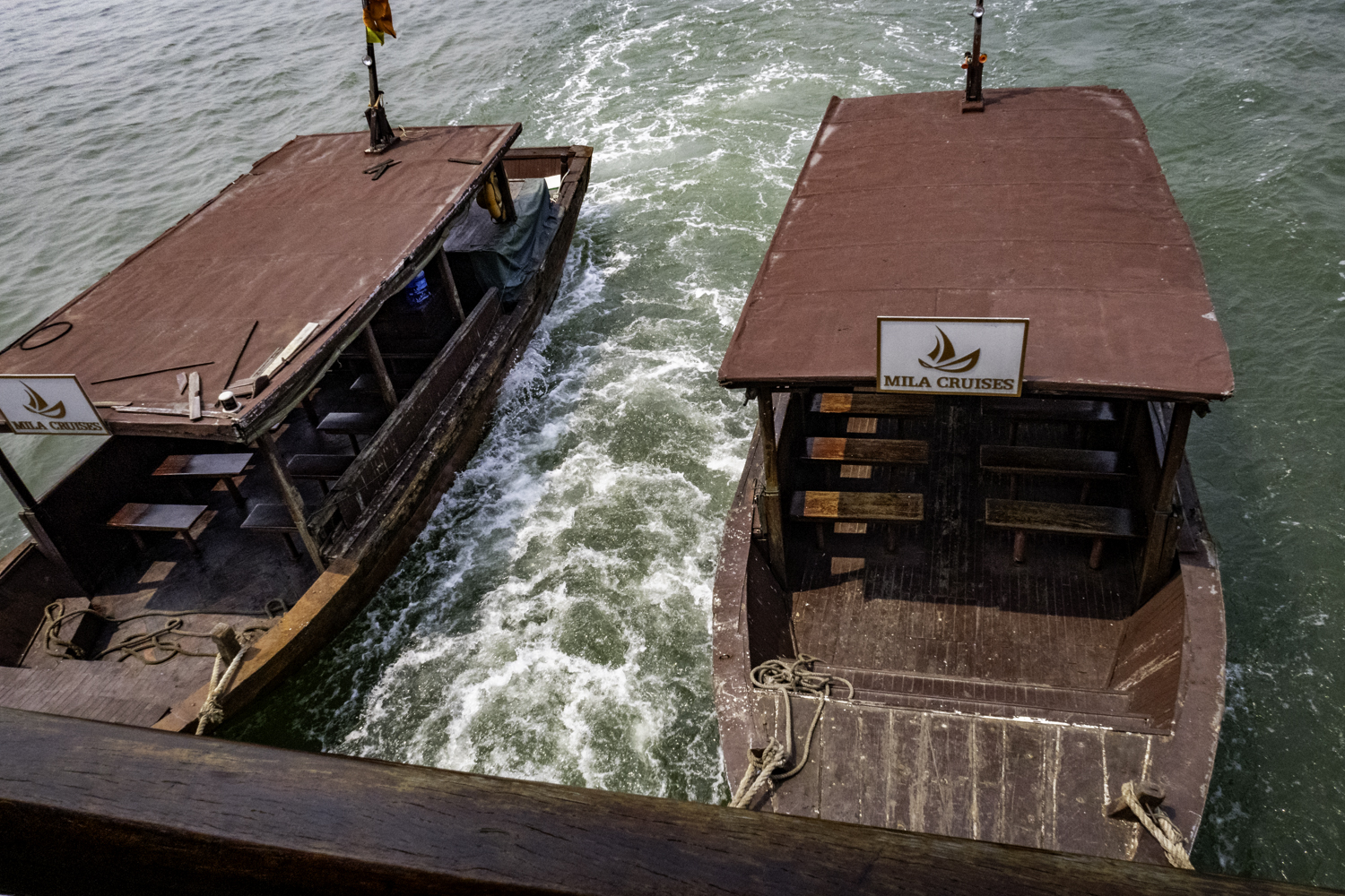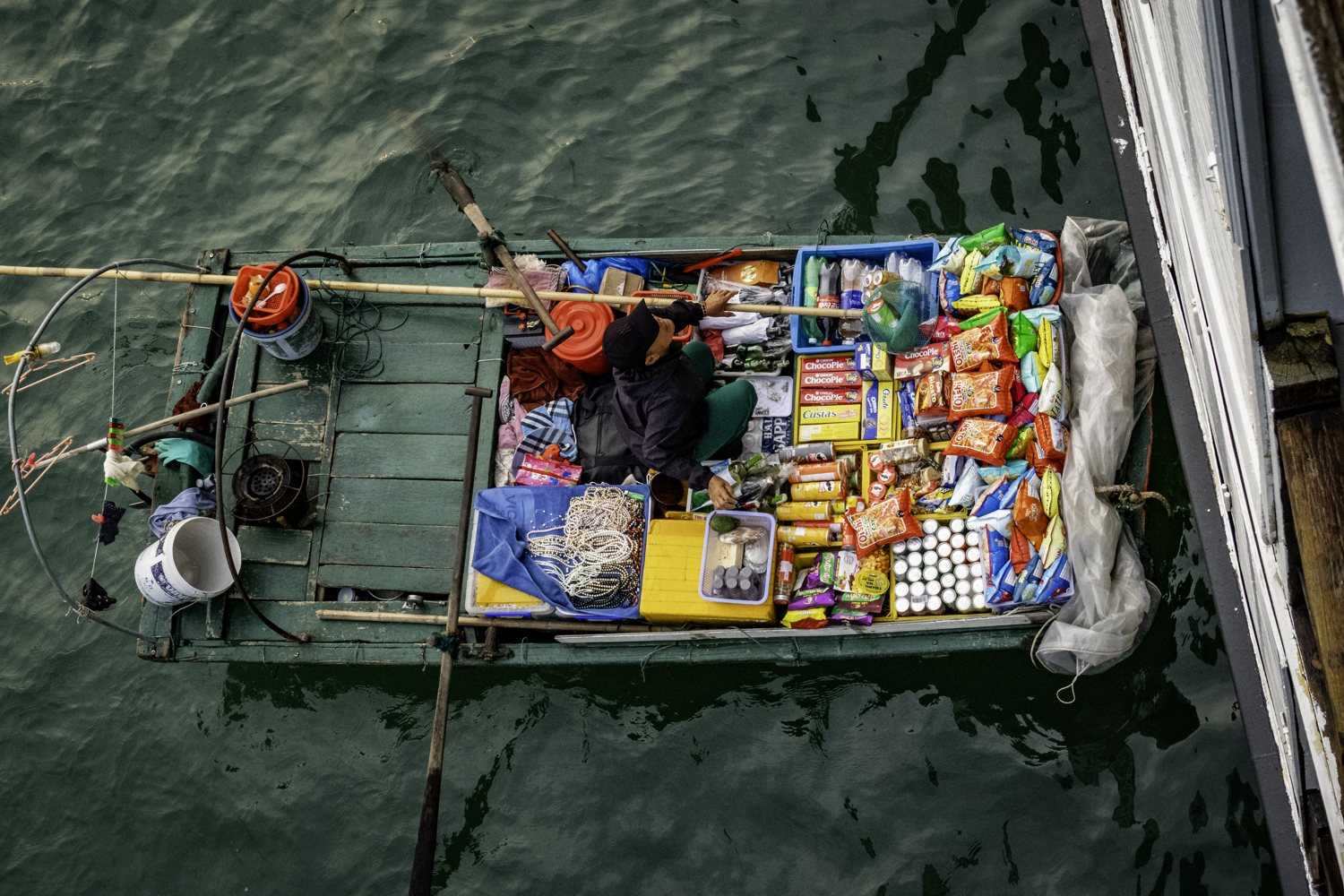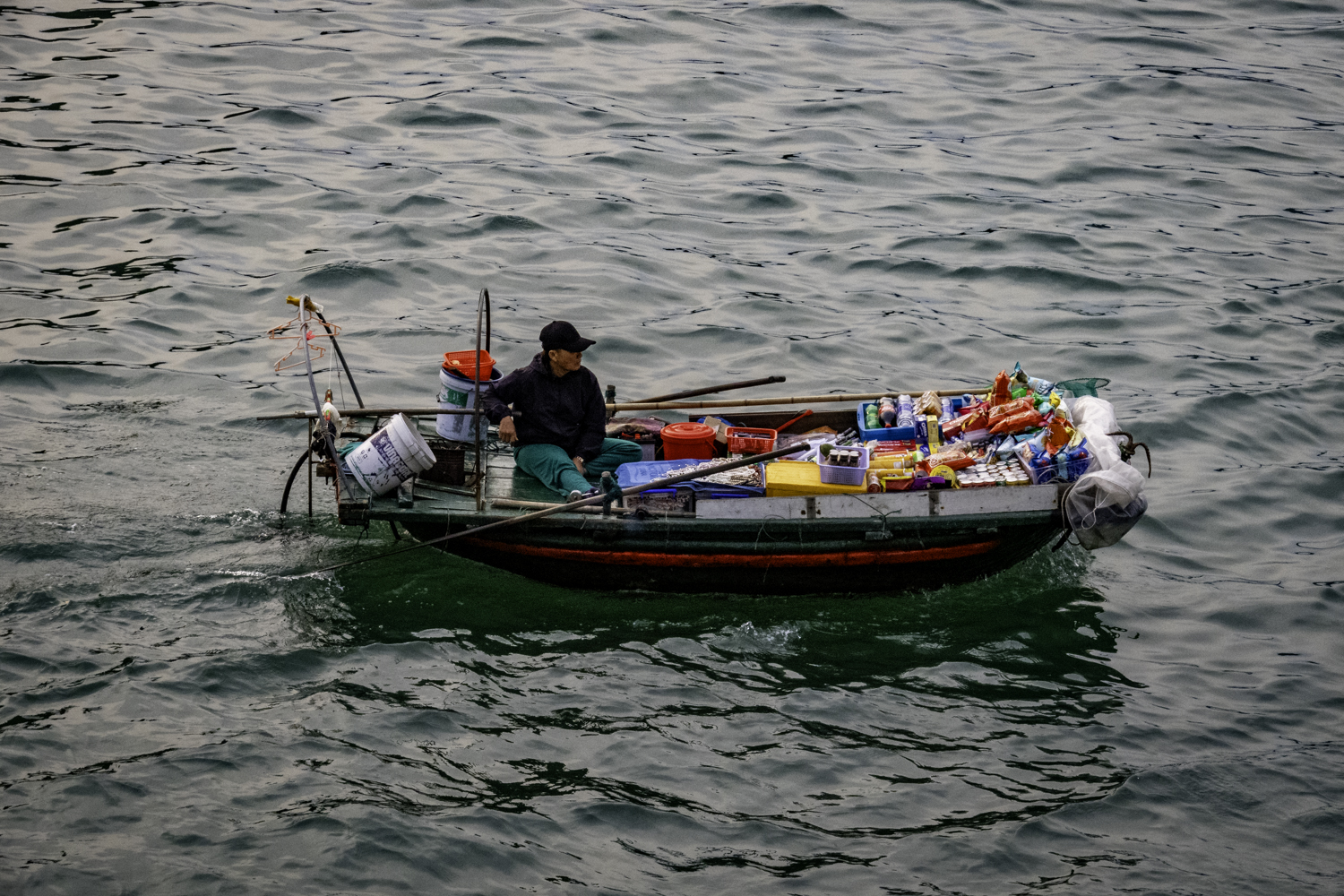 A small boat vendor rows up but rows away when there isn’t a crowd to greet him. Another vendor comes along in a motor powered boat but also goes away when there is no crowd to greet him. But he is an entrepreneur and comes around again. He spots me and my camera and heads for me. I step back out of sight and he floats around looking for me or anyone else. I don’t want to lead him on as I don’t want to buy his trinkets.