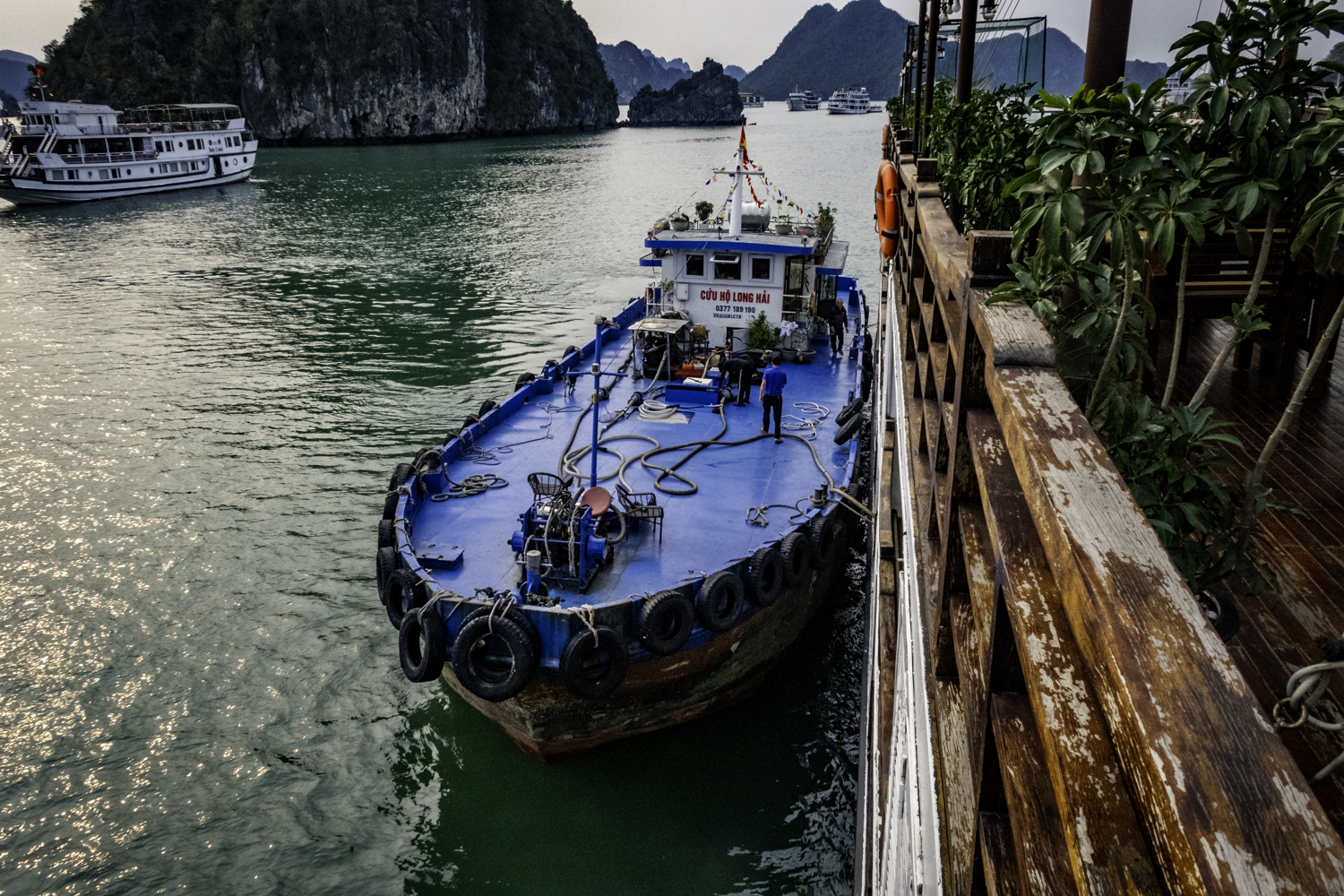 The kayak excursion is short and we are the last to return. We get back on the ship just in time for the next activity, hiking up one of the islands to a cave. I am feeling quite mellow and decide not to go. Elee does not go either and chooses to get a massage on board instead. A fuel tanker sidles up to us and hooks up.
