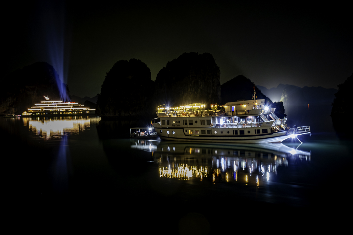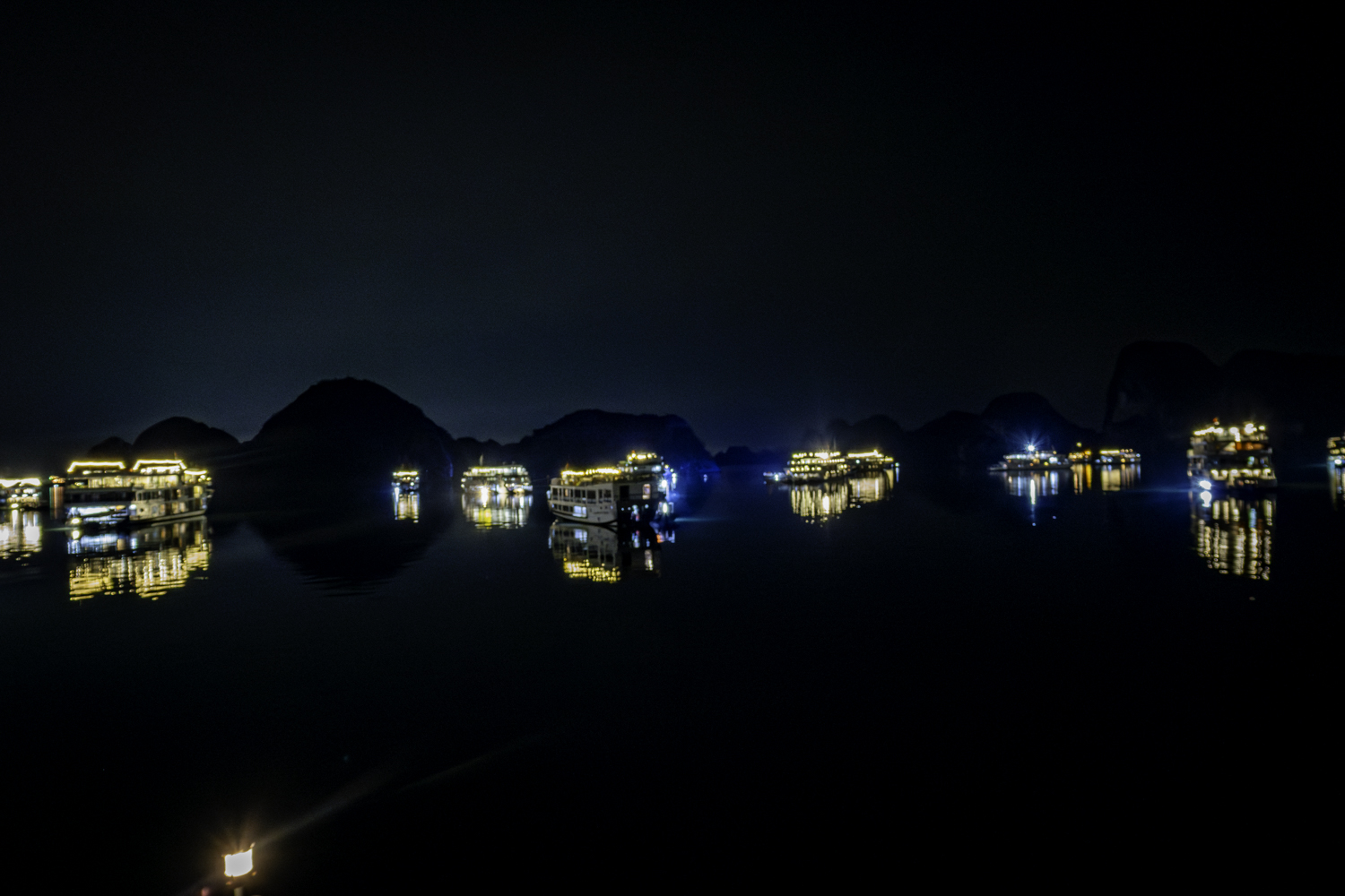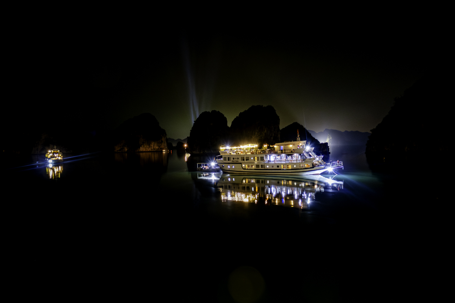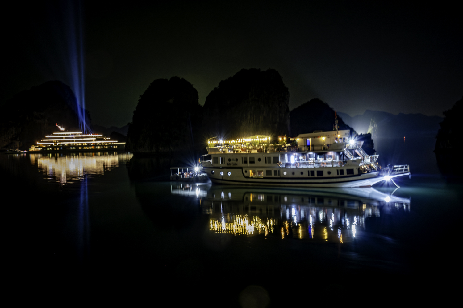 Even though being tired, my camera drags me back up on deck for some more night photo fun. A couple of the boats in the bay put on light shows for all to enjoy!