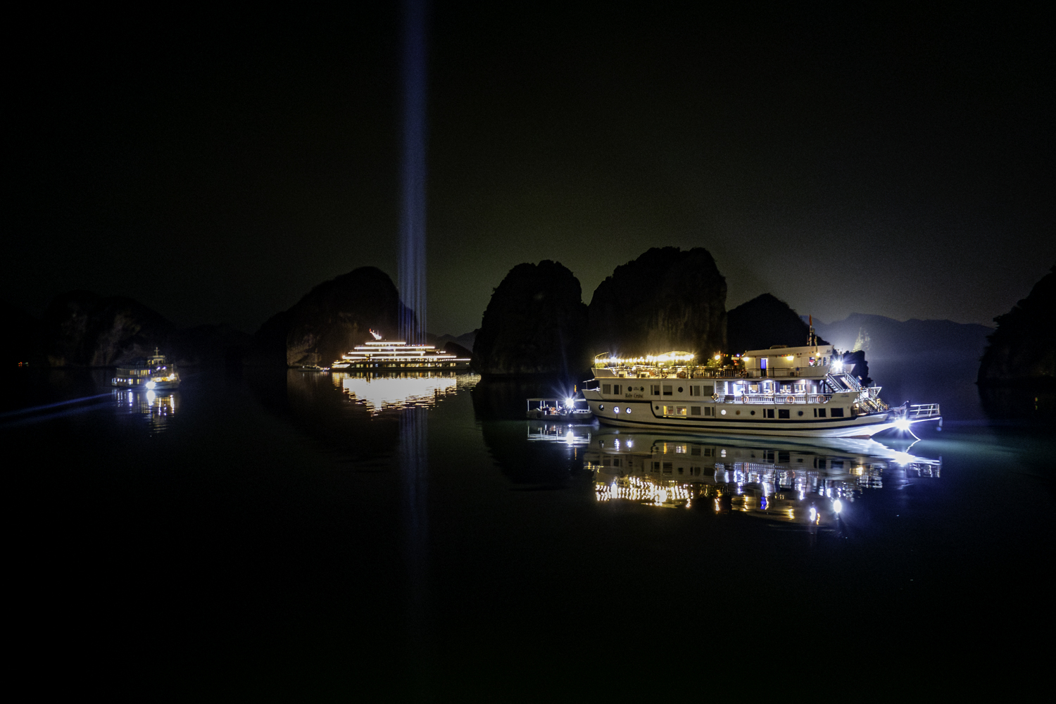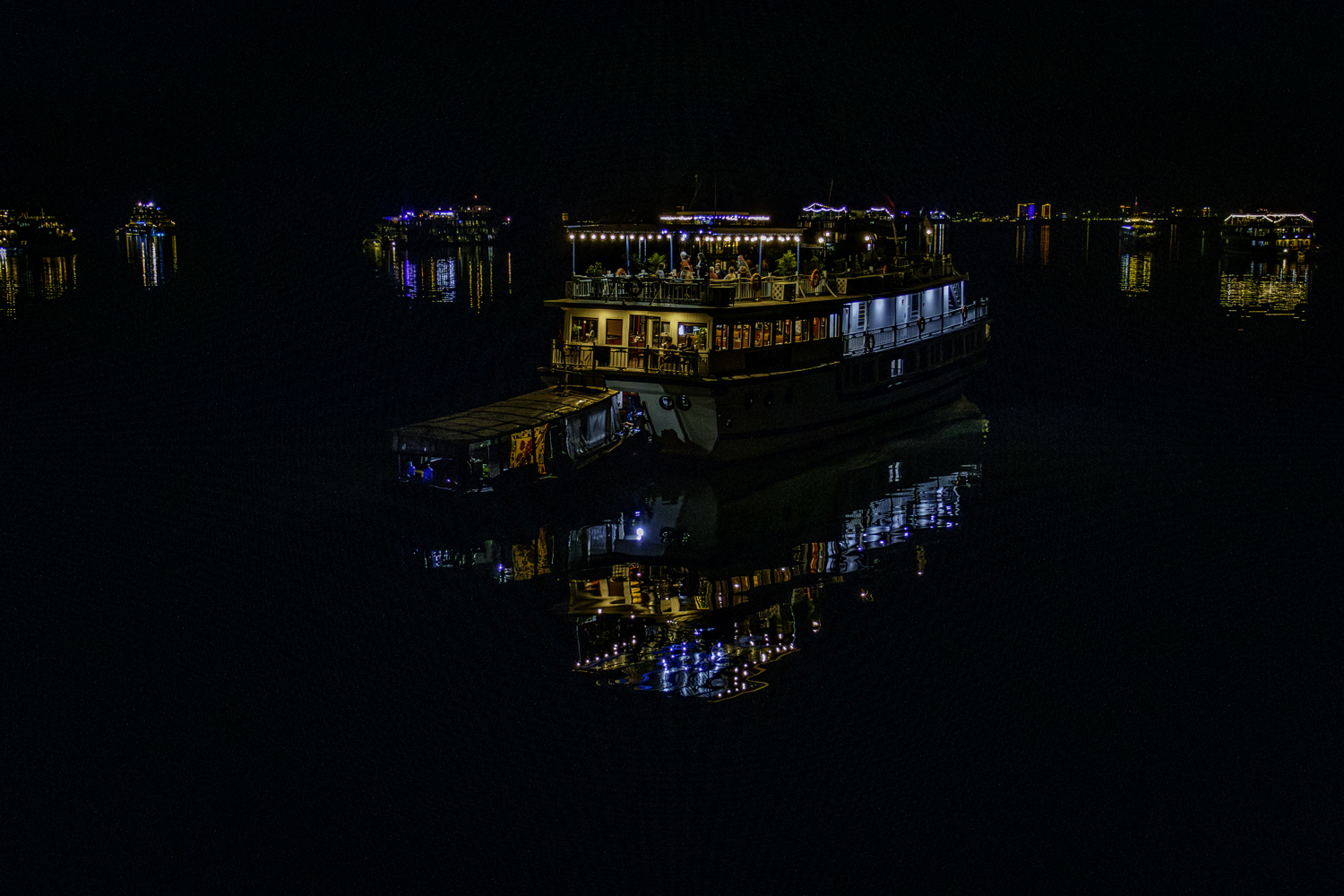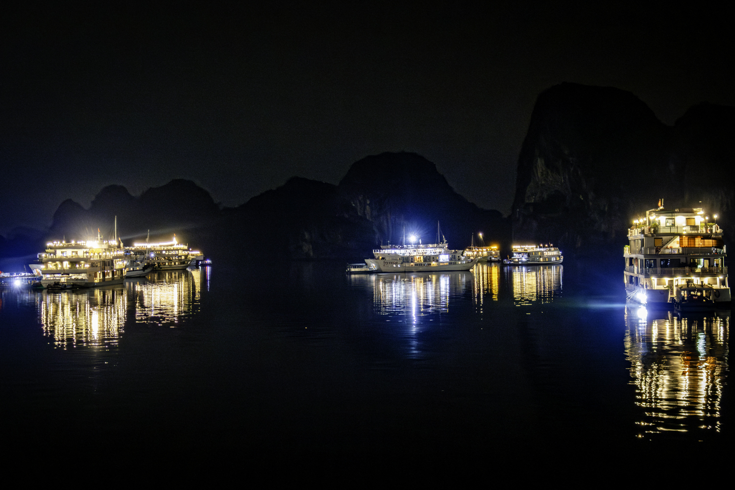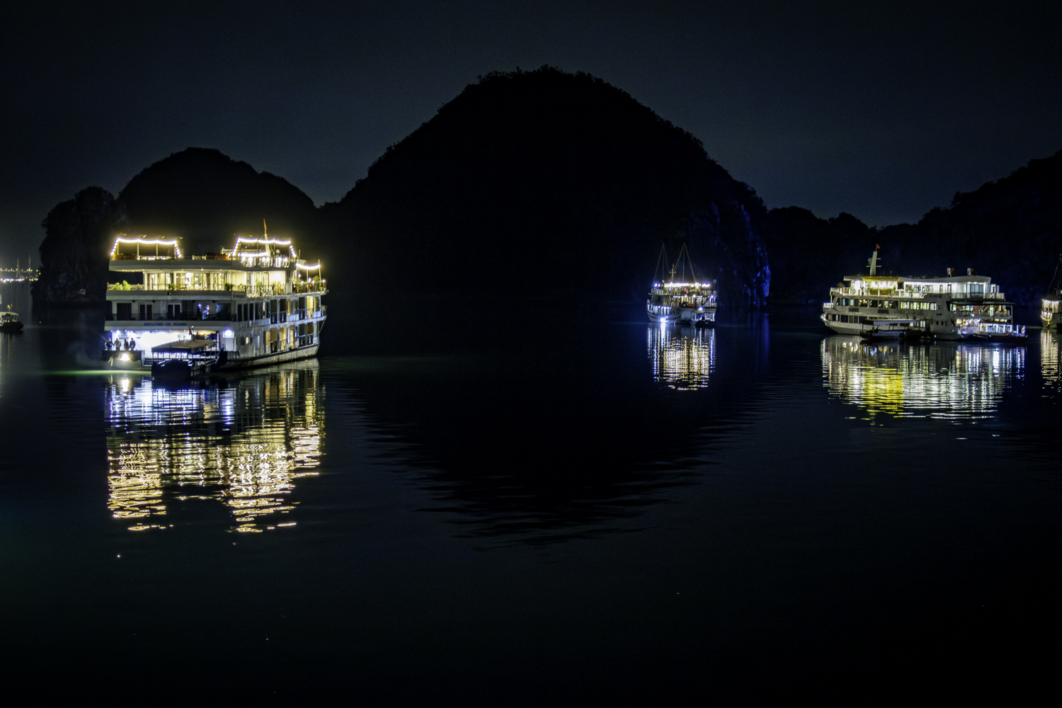 Even though being tired, my camera drags me back up on deck for some more night photo fun. A couple of the boats in the bay put on light shows for all to enjoy!