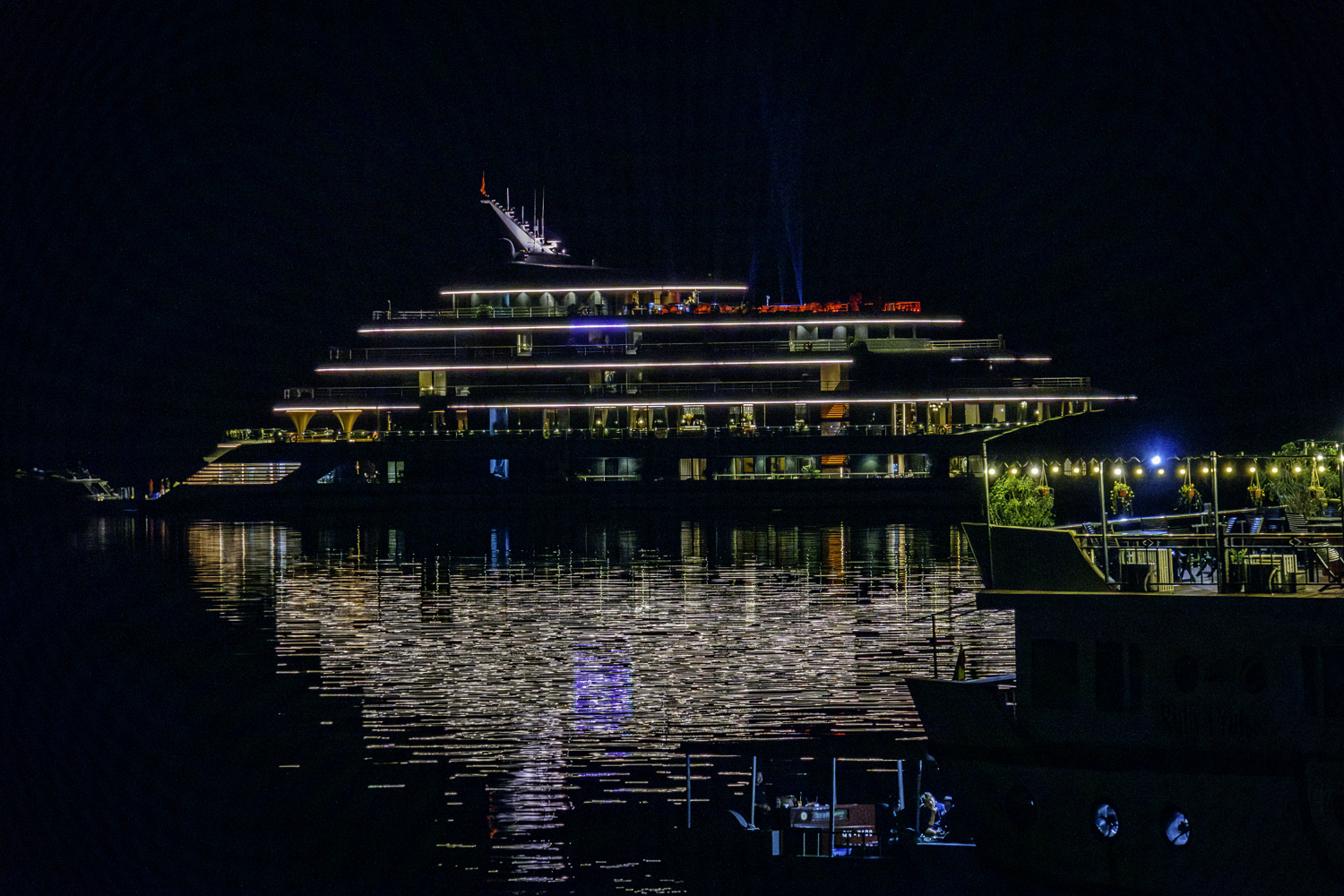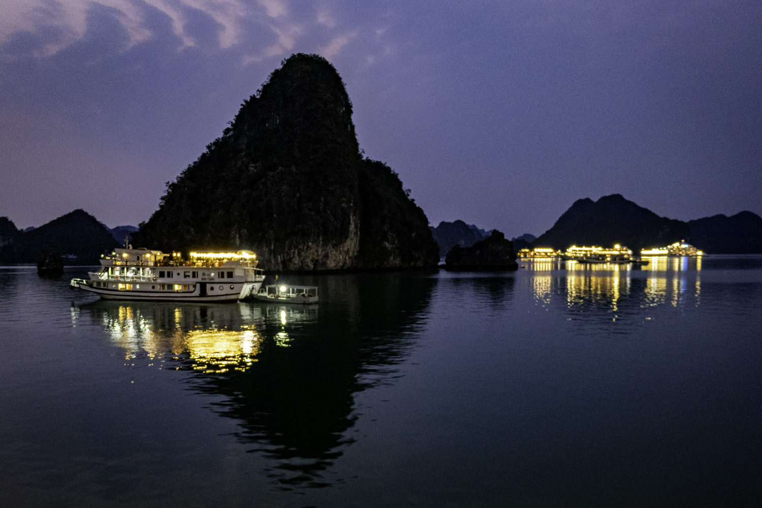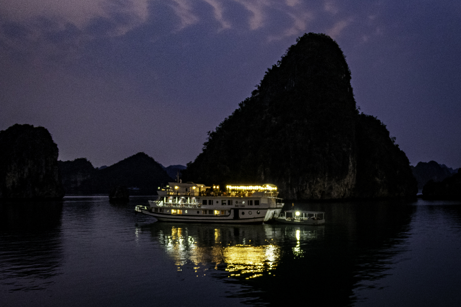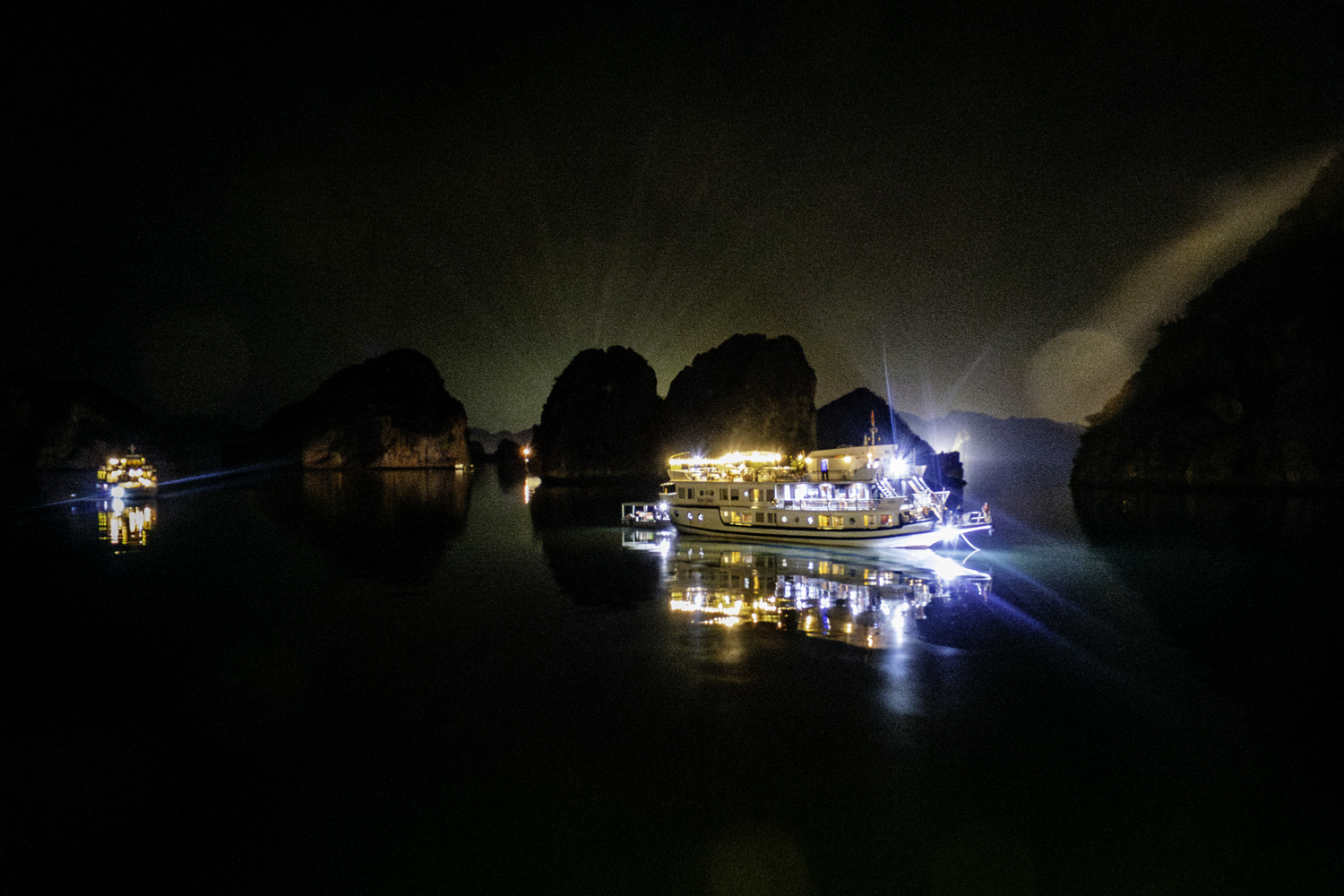 Even though being tired, my camera drags me back up on deck for some more night photo fun. A couple of the boats in the bay put on light shows for all to enjoy!