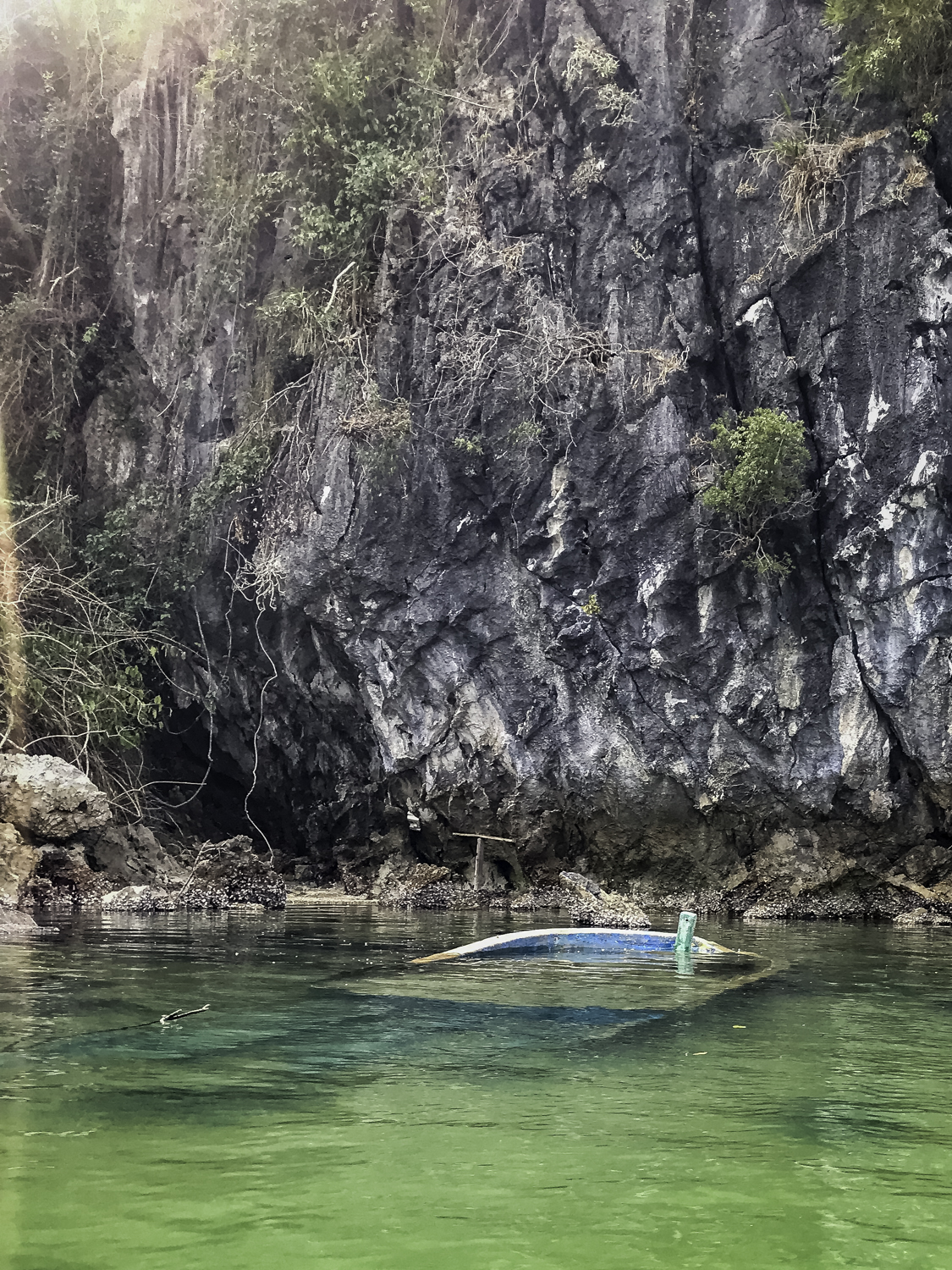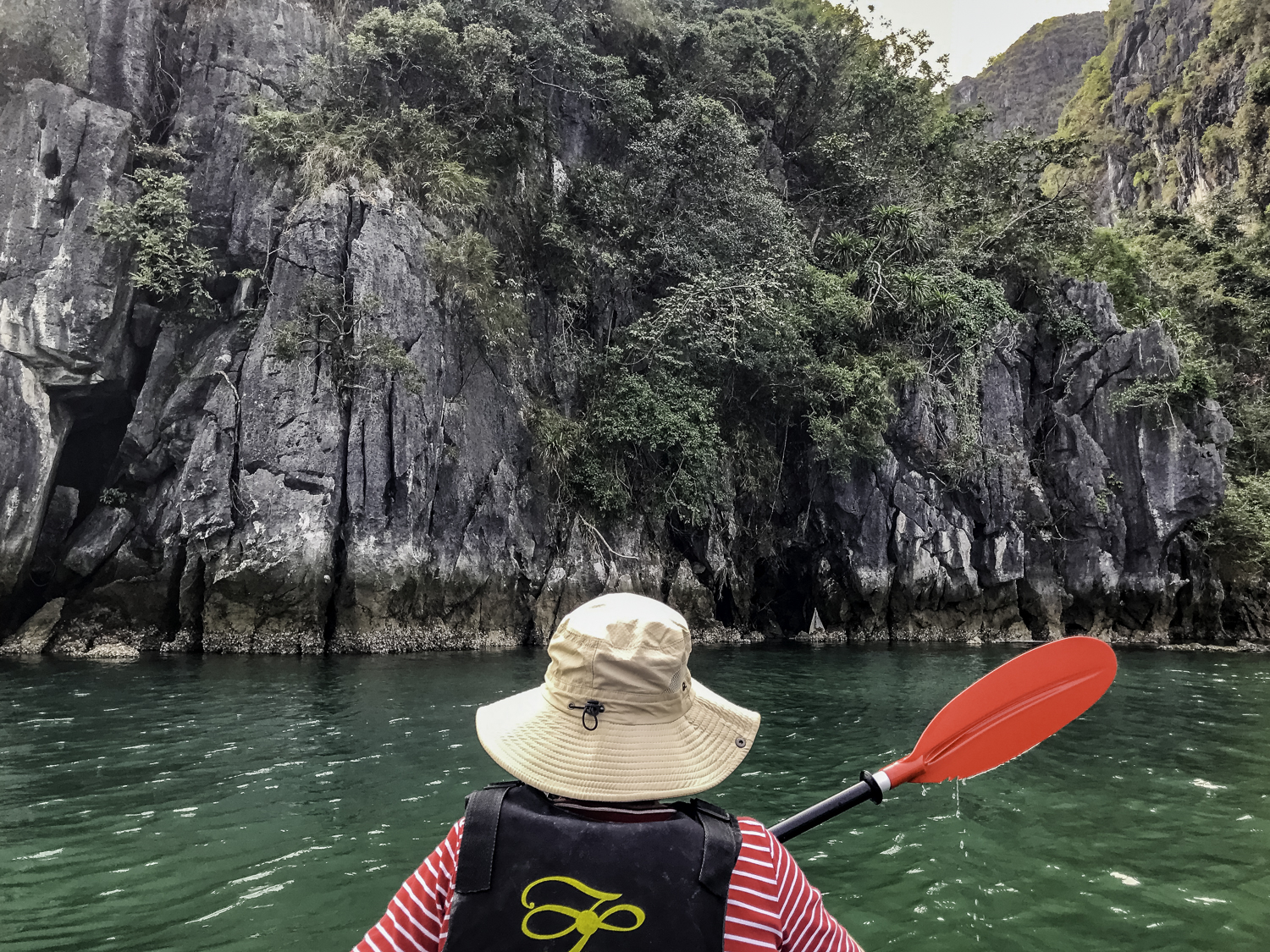 Now it’s time to get on the small boat again and go kayaking through an oyster farm! Both Elee and I want our own kayak, but there are limited numbers so we share one. We kayak around the farm and over to the shore. There are many ‘caves’ that we attempt to explore but most are illusionary or filled with floating debris.