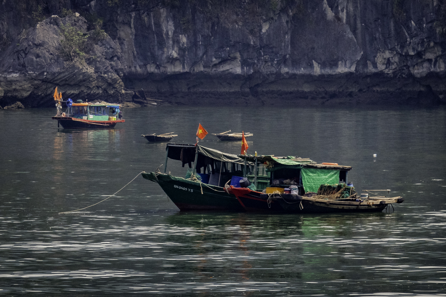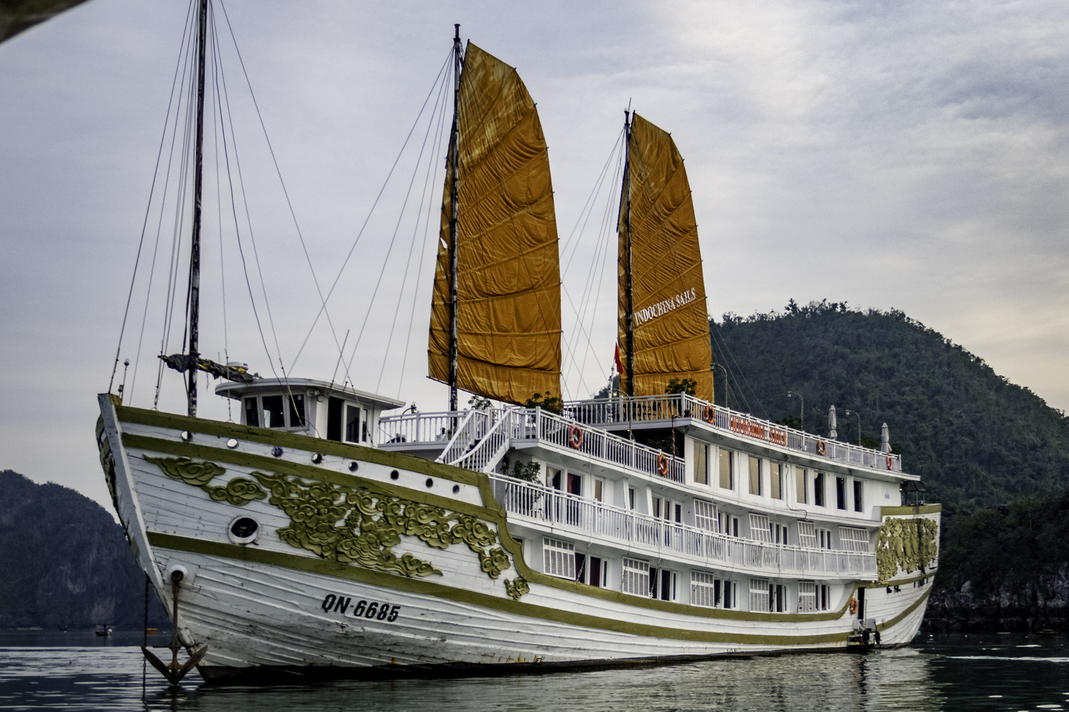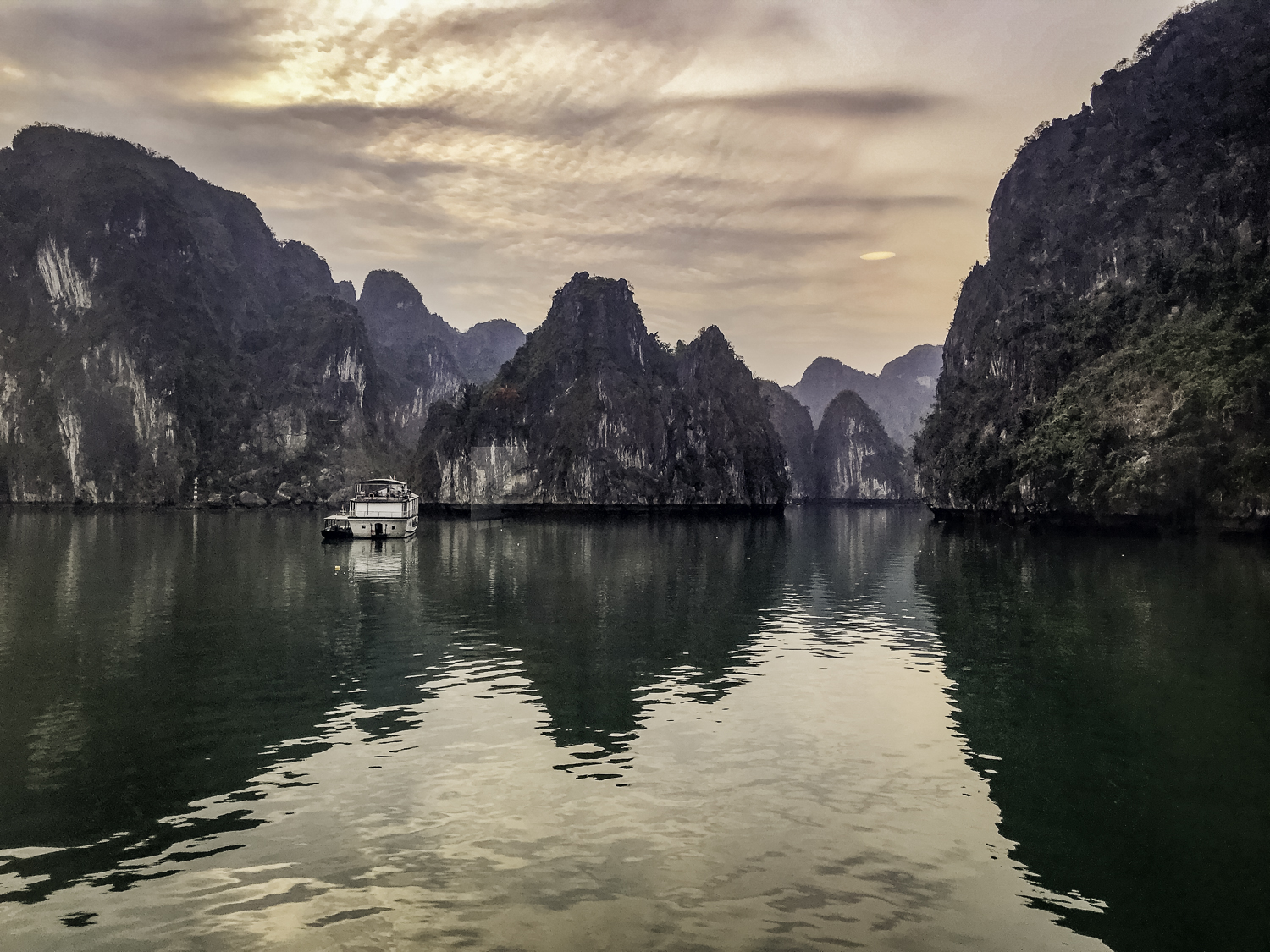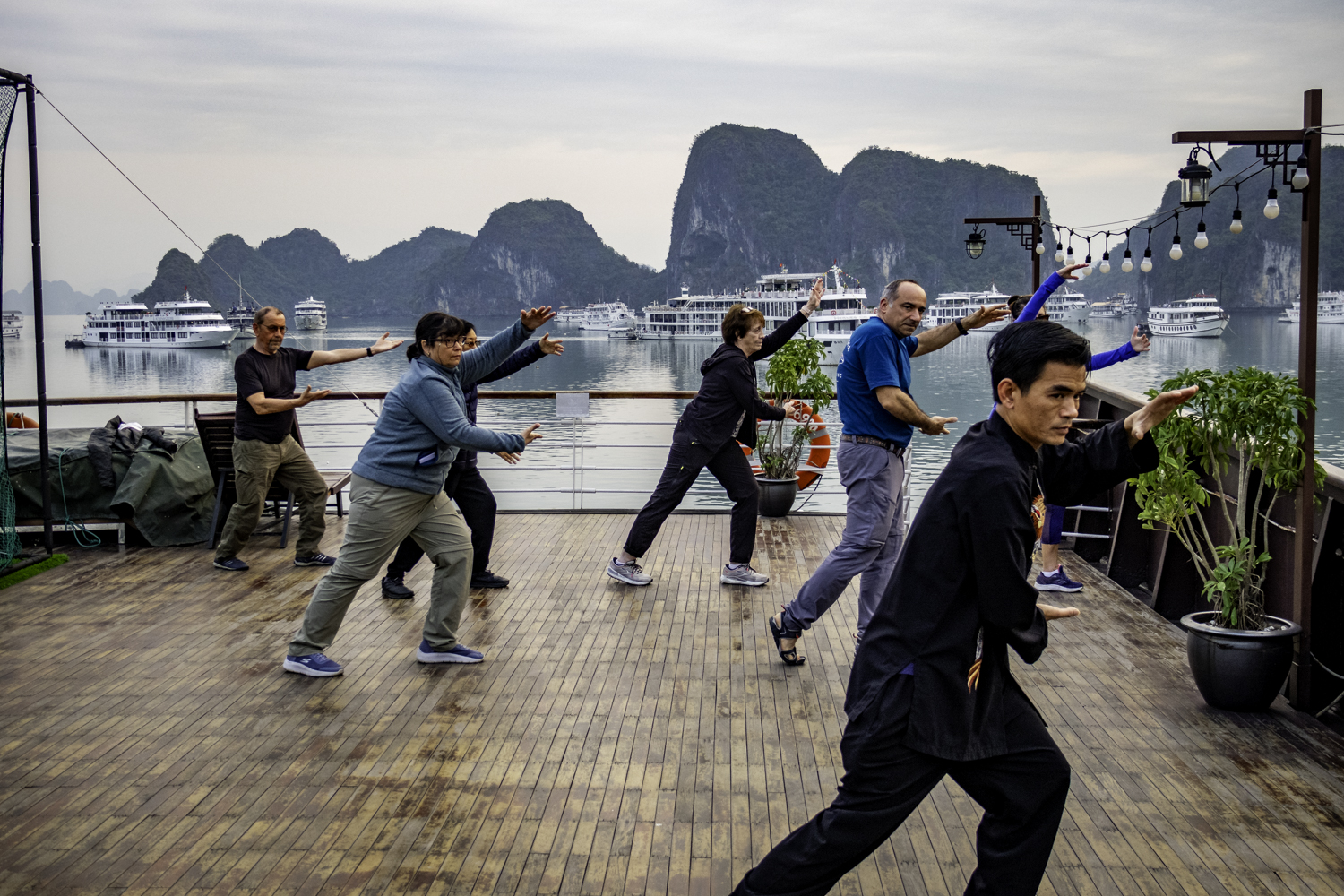 We arise at 6:30 and have a buffet breakfast on the boat. Very good Vietnamese food. The boat has pulled it’s anchor and is under way. There is an early morning Thai Chi class on deck that Elee joins. The bay is very calm as we start to move.