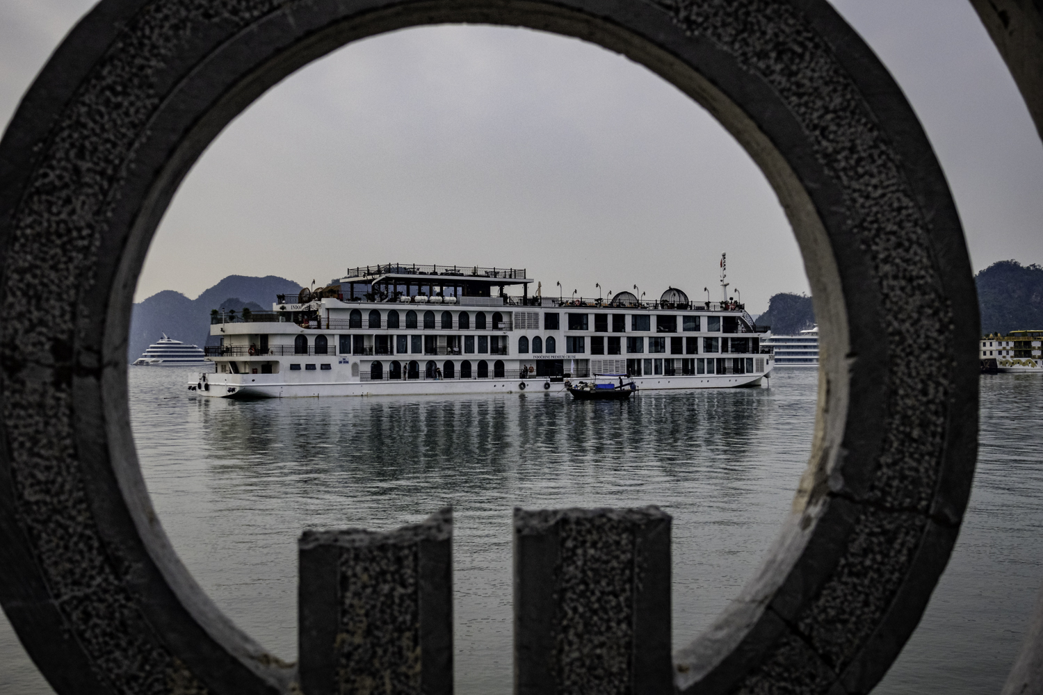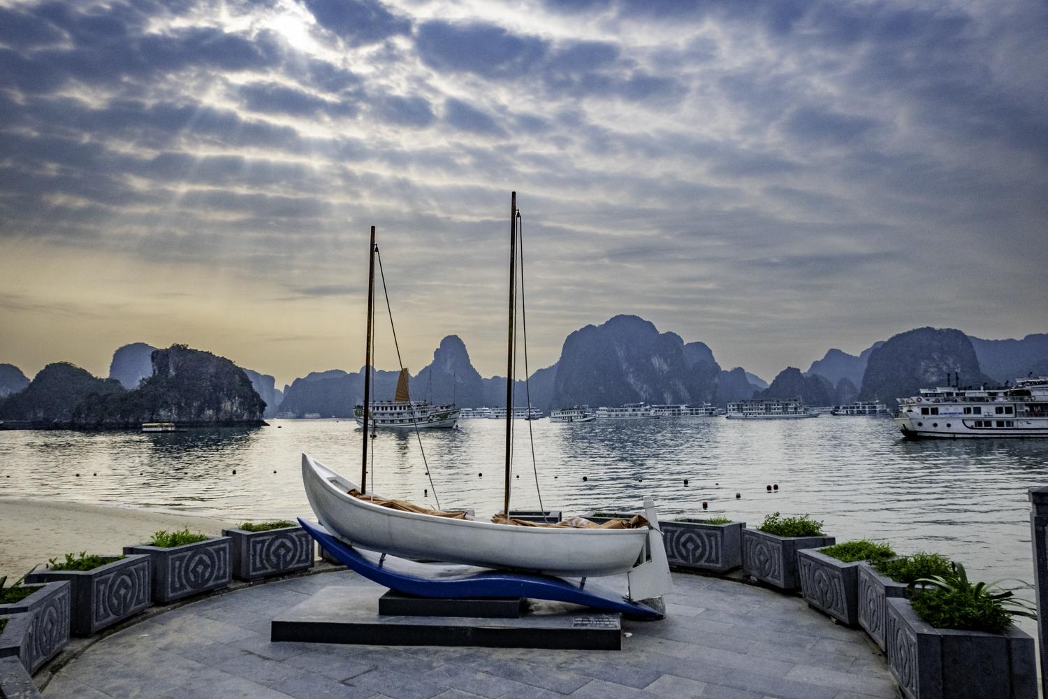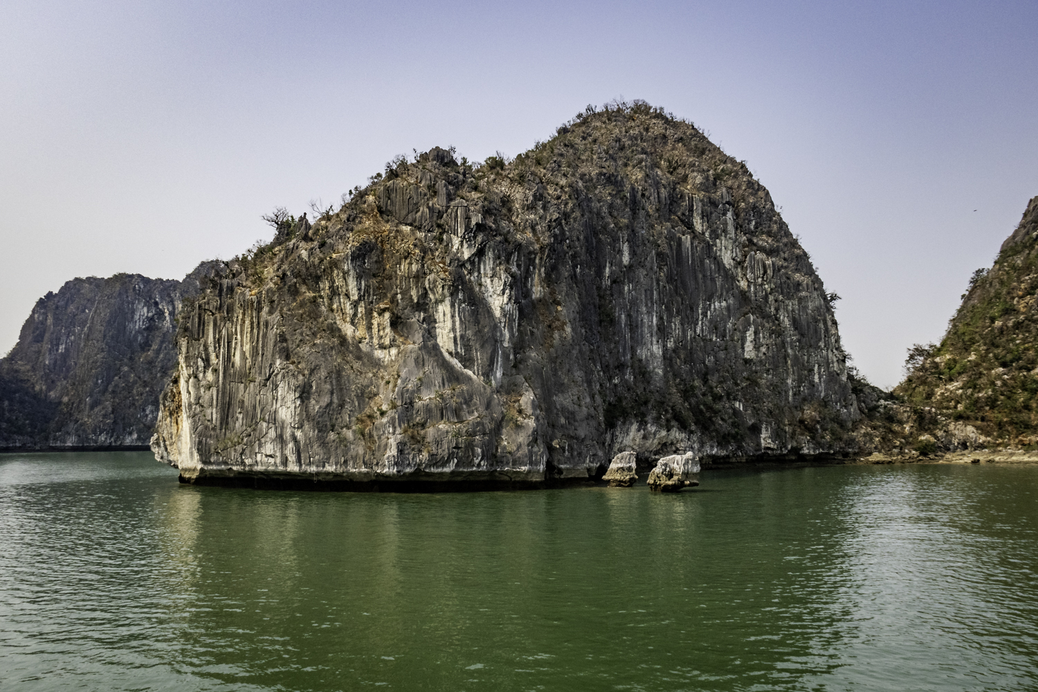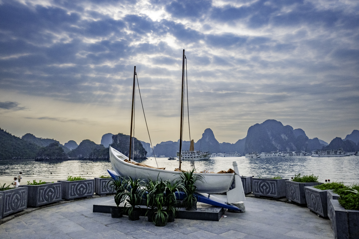 We arise at 6:30 and have a buffet breakfast on the boat. Very good Vietnamese food. The boat has pulled it’s anchor and is under way. There is an early morning Thai Chi class on deck that Elee joins. The bay is very calm as we start to move.