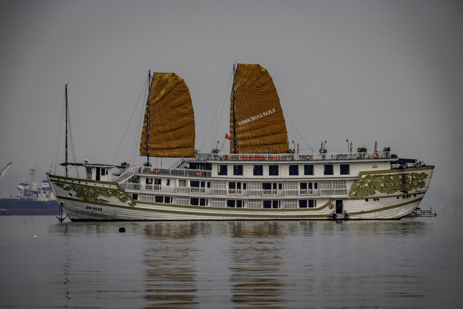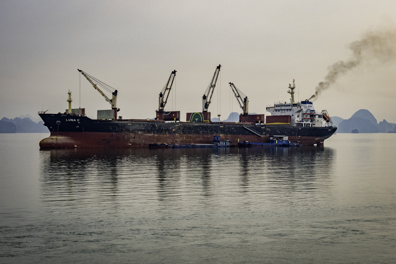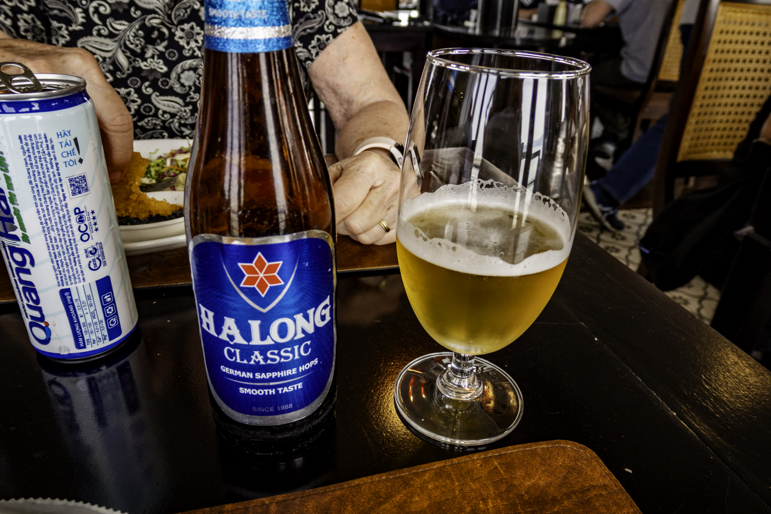 We hang out on Titop for a couple hours, then get back on the Junk for the ride back to Ha Long City and have brunch on the Junk. I try a Ha Long Classic Beer that is a typical Pilsner but it is cold. On the way back to Ha Long, we hang out on deck for the most part and watch Junks and other ships traveling and working. There is a large freighter unloading cargo barges in the middle of the bay!