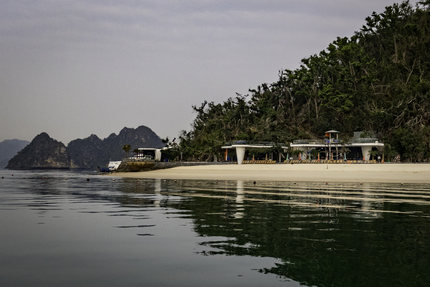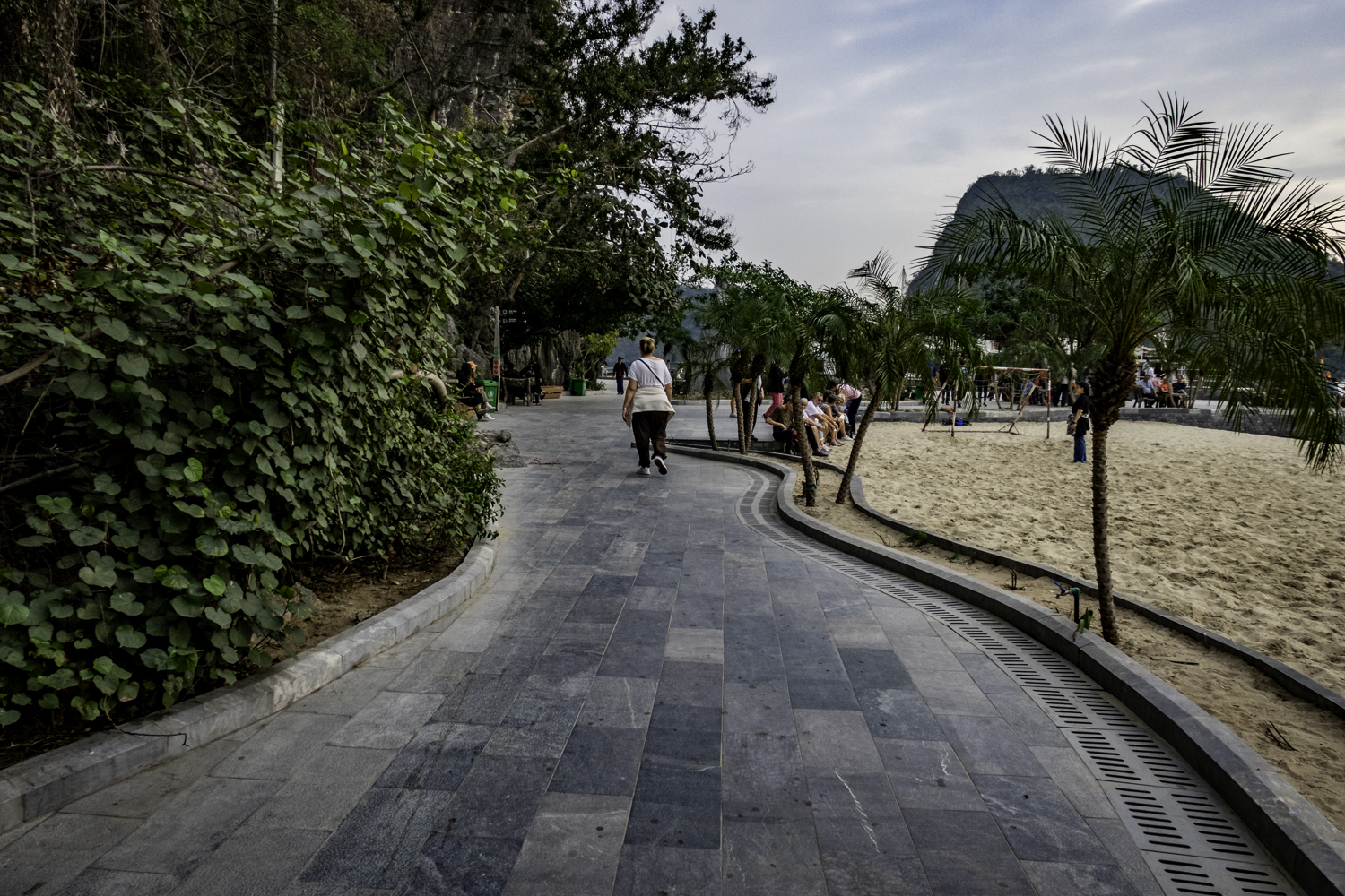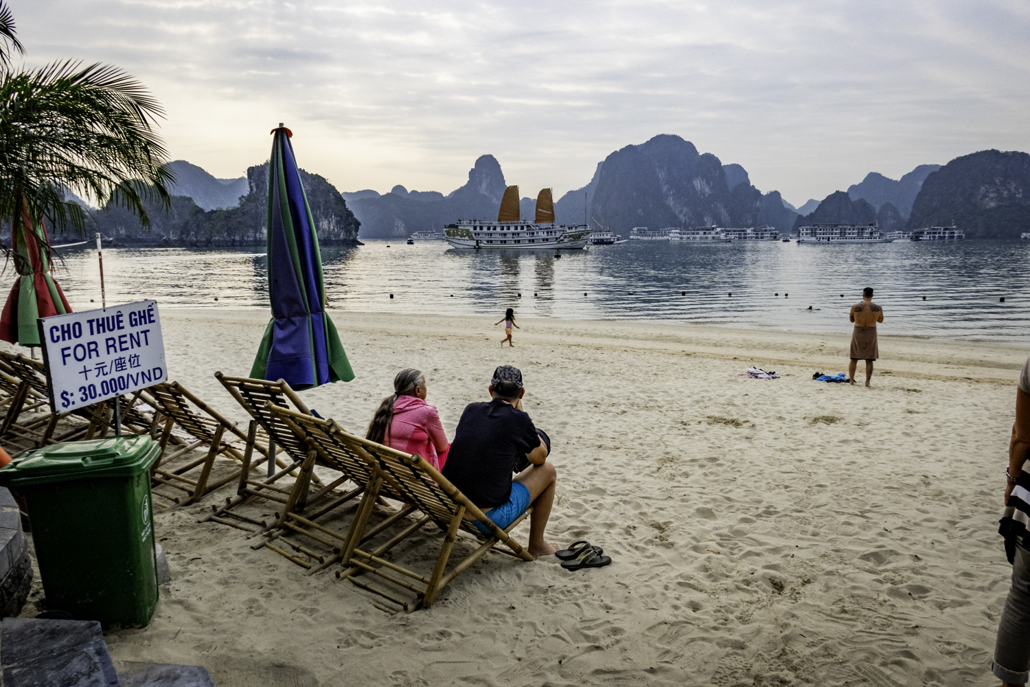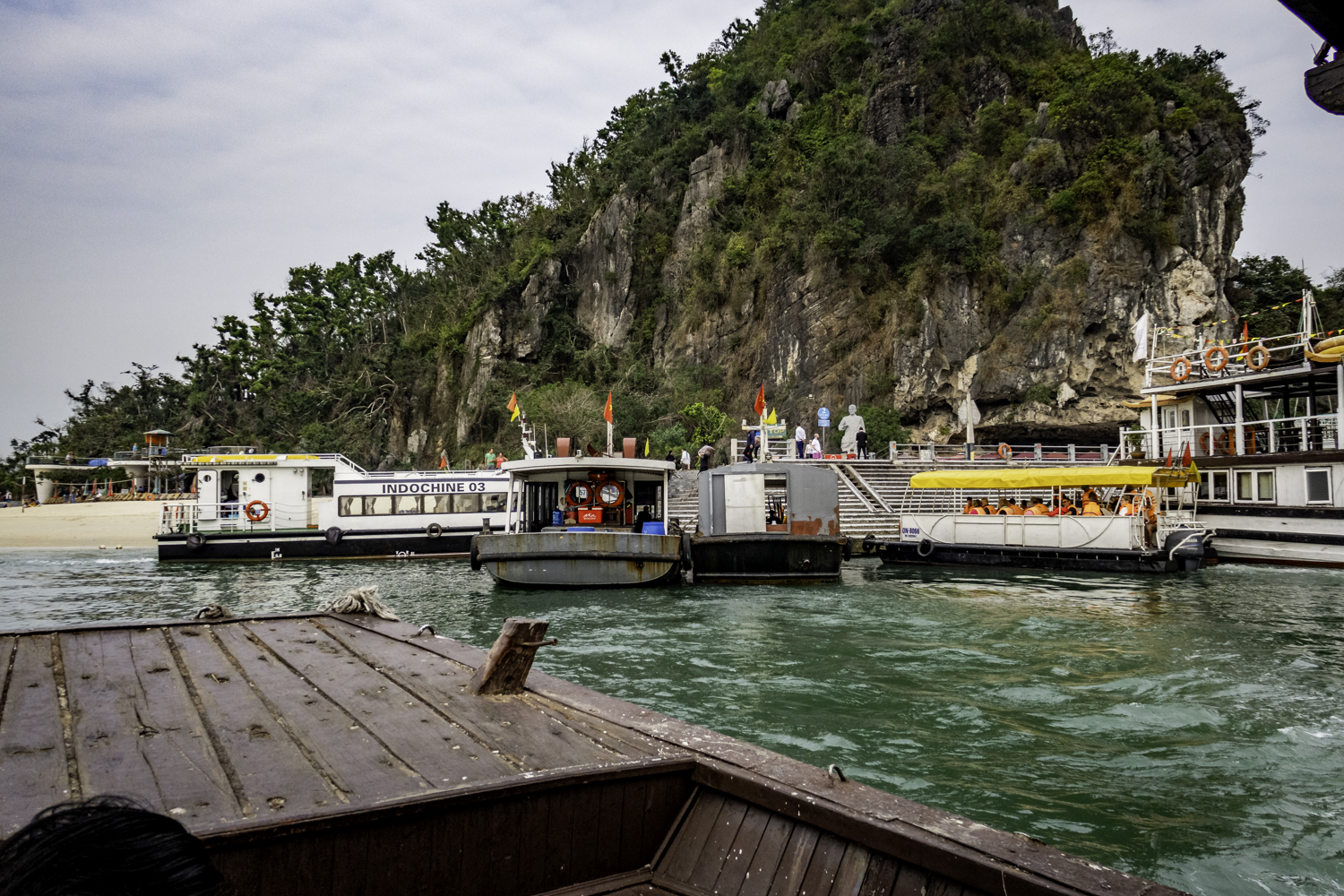 We go to Dao Titop Island with a beach! (see pics) to hike. The small tenders that our boat tows along take us in. Some people climb to the top. I choose to go about halfway. Fun place. There aren’t many islands with beaches in Ha Long Bay. This one even has a couple of bars. It is too early to drink but it sure is tempting!