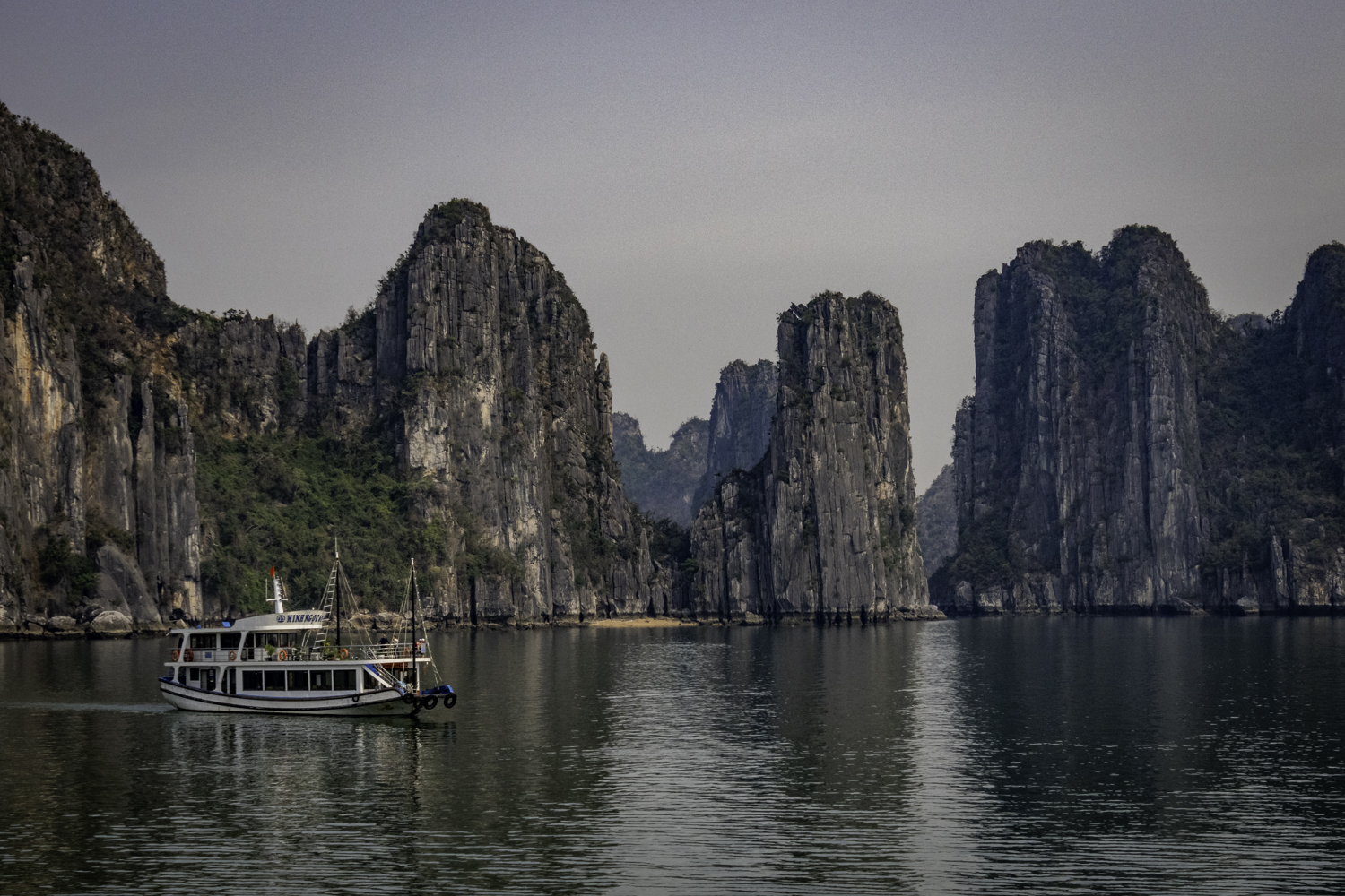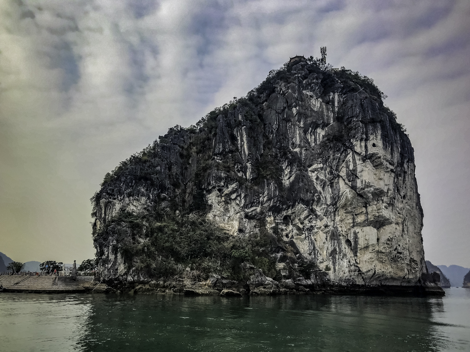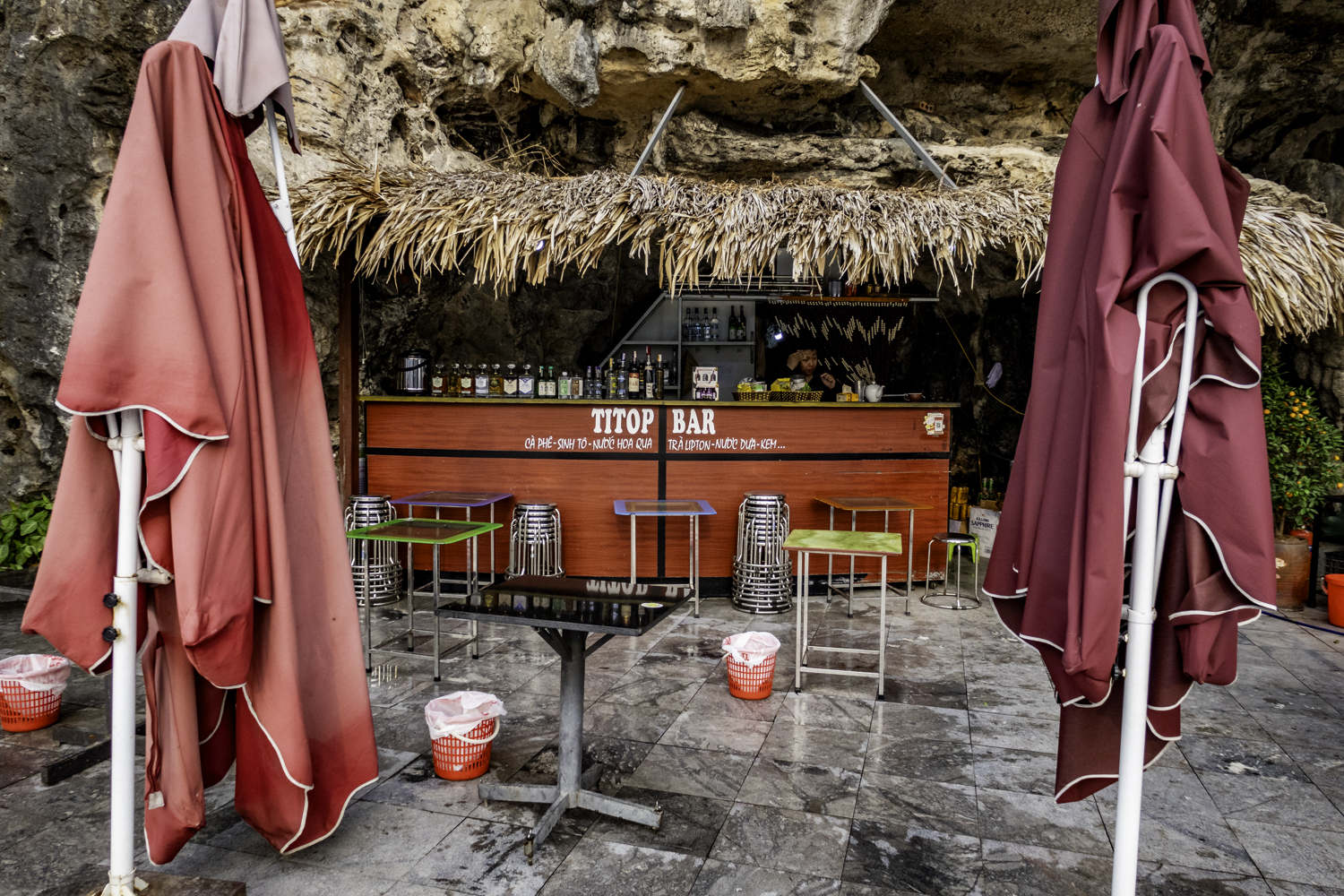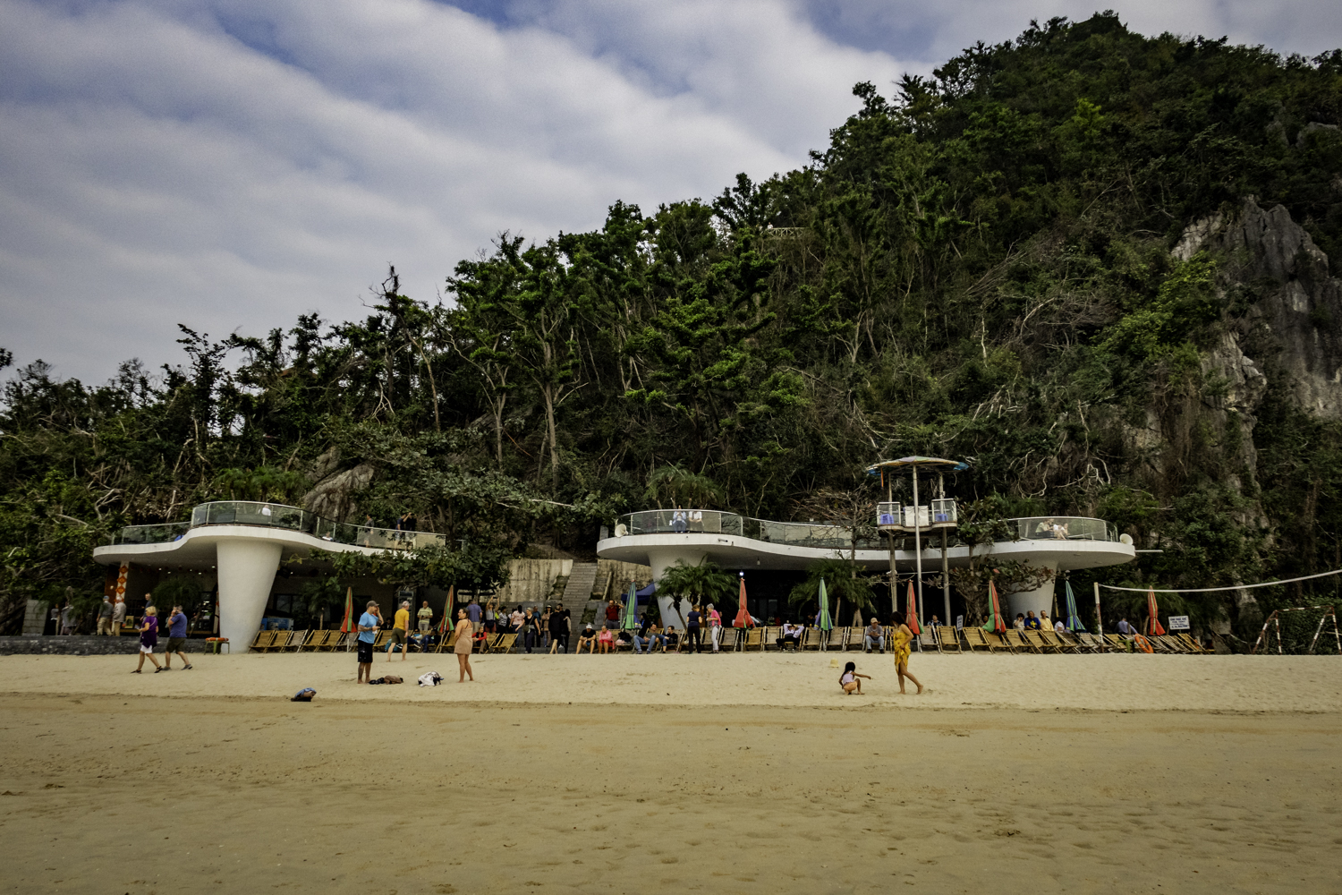 We go to Dao Titop Island with a beach! (see pics) to hike. The small tenders that our boat tows along take us in. Some people climb to the top. I choose to go about halfway. Fun place. There aren’t many islands with beaches in Ha Long Bay. This one even has a couple of bars. It is too early to drink but it sure is tempting!