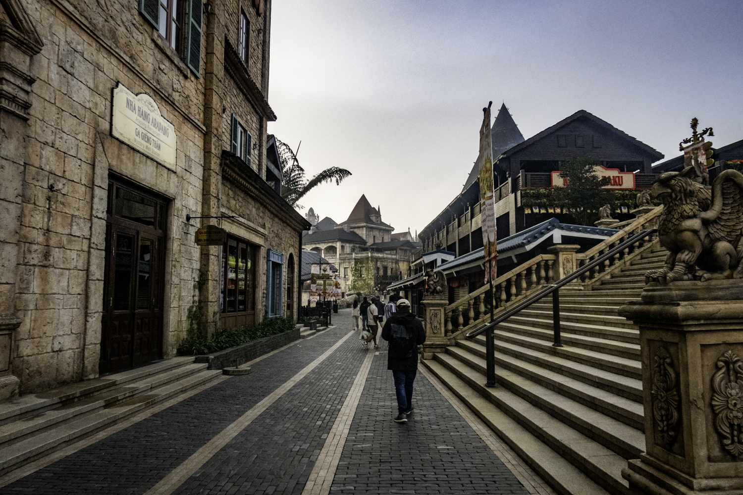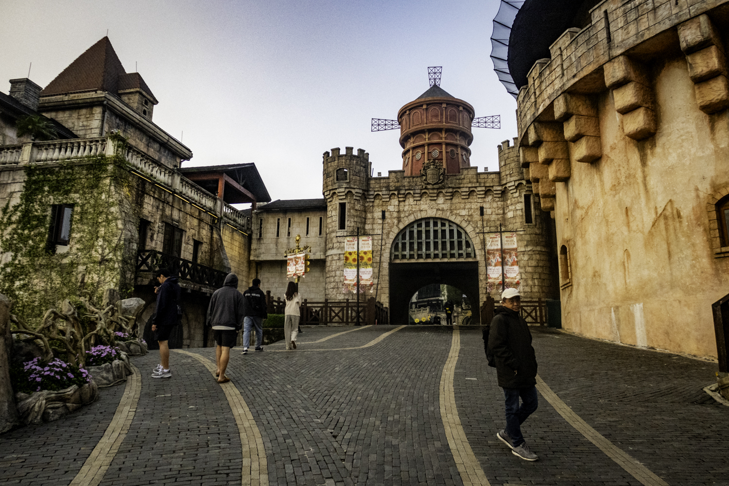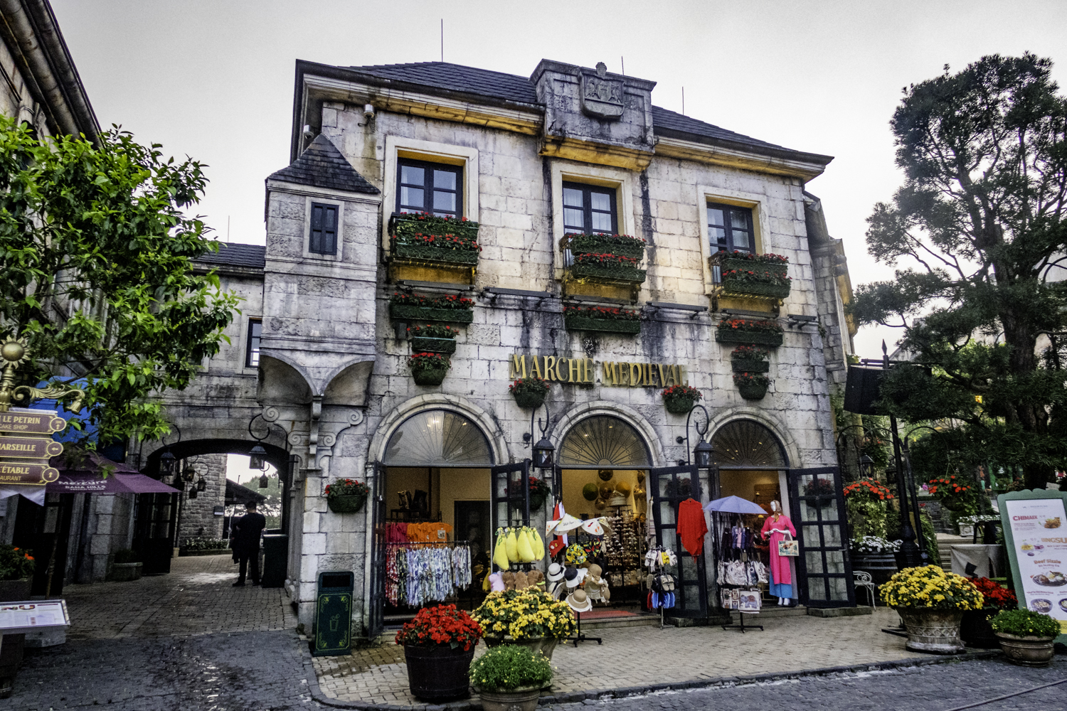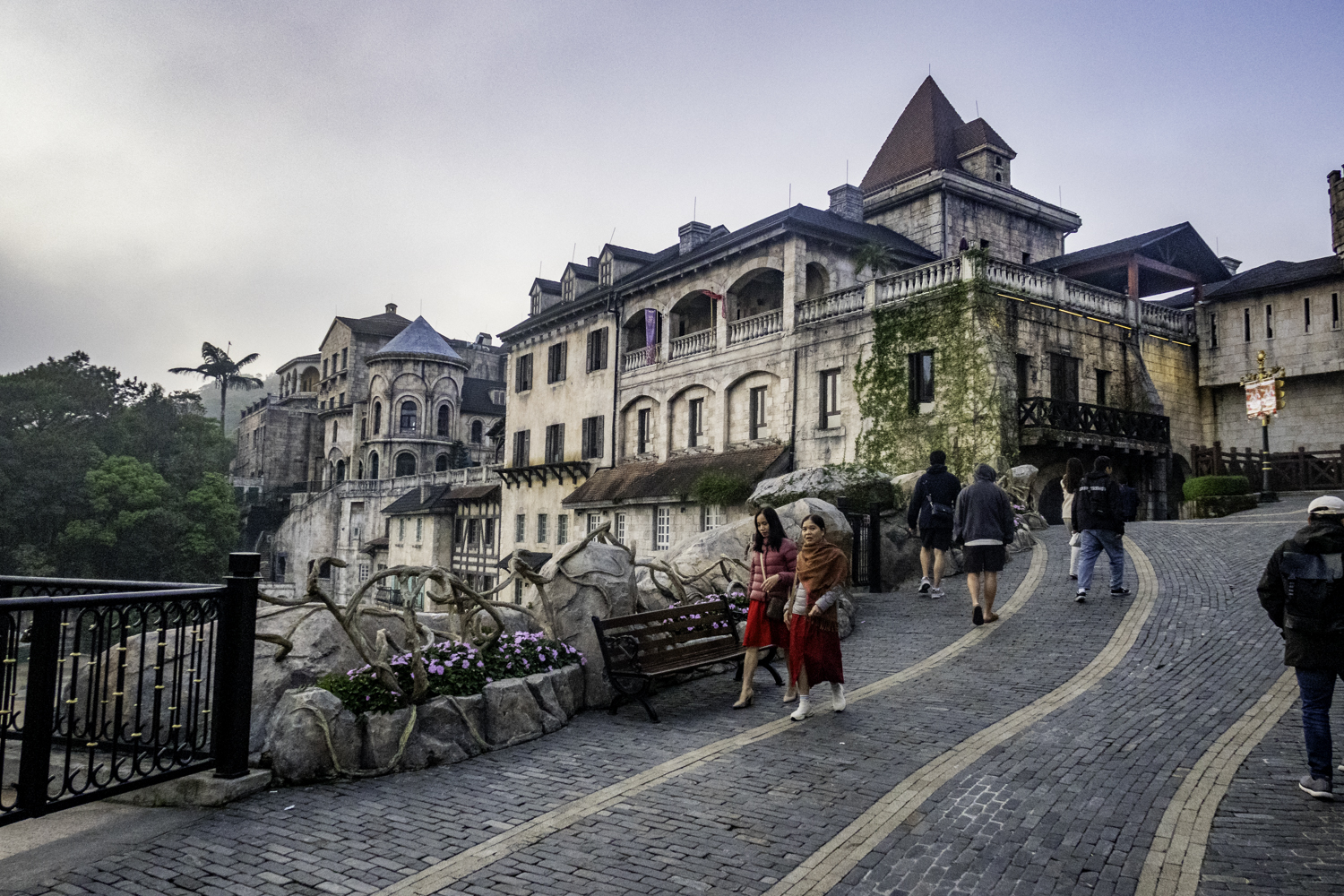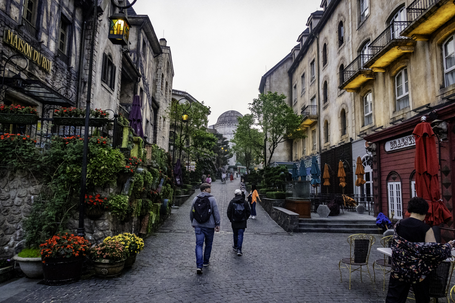 Hwan leads us up and up and tells us to keep going up. We go up the path and find pagodas and views to excite our cameras again. It seems odd to be in the top of a Chinese building looking down on medieval Europe!  This is an amusement park built amongst a (fake) French Village on top of a mountain reached by one of the longest cable car’s in the world.  Keeping it’s original theme of when the hill station was a resort for French tourists back in the Colonial days.  It’s a hugely popular destination for families – a Medieval castle, cobblestone paths, a Neo-Classical cathedral, manicured gardens and (for the parents) a beer garden.  There’s a wax museum, an “Alpine Coaster” ride, an underground amusement park with rides and shows, countless restaurants and food stalls.