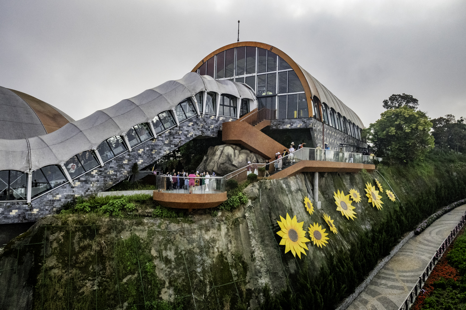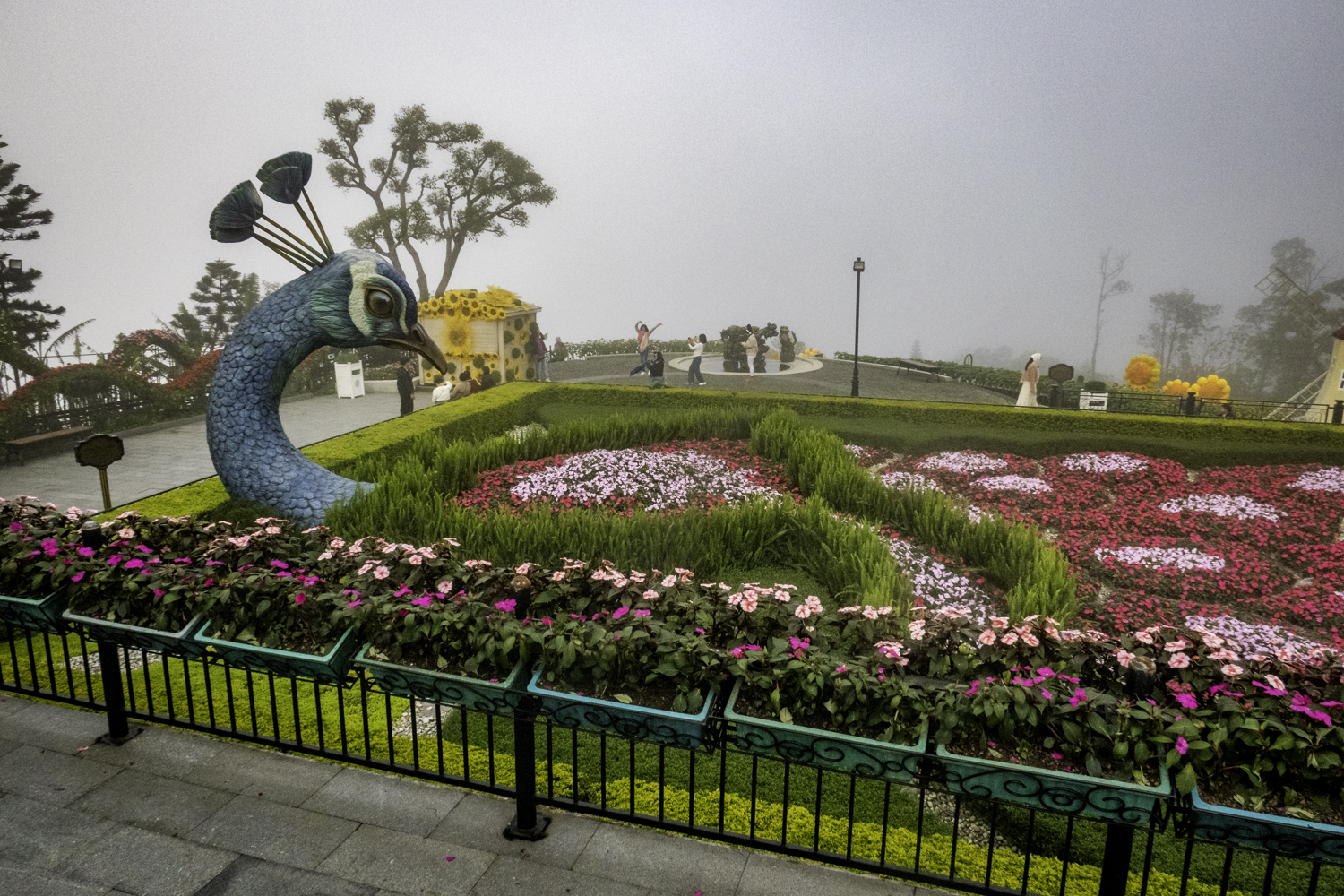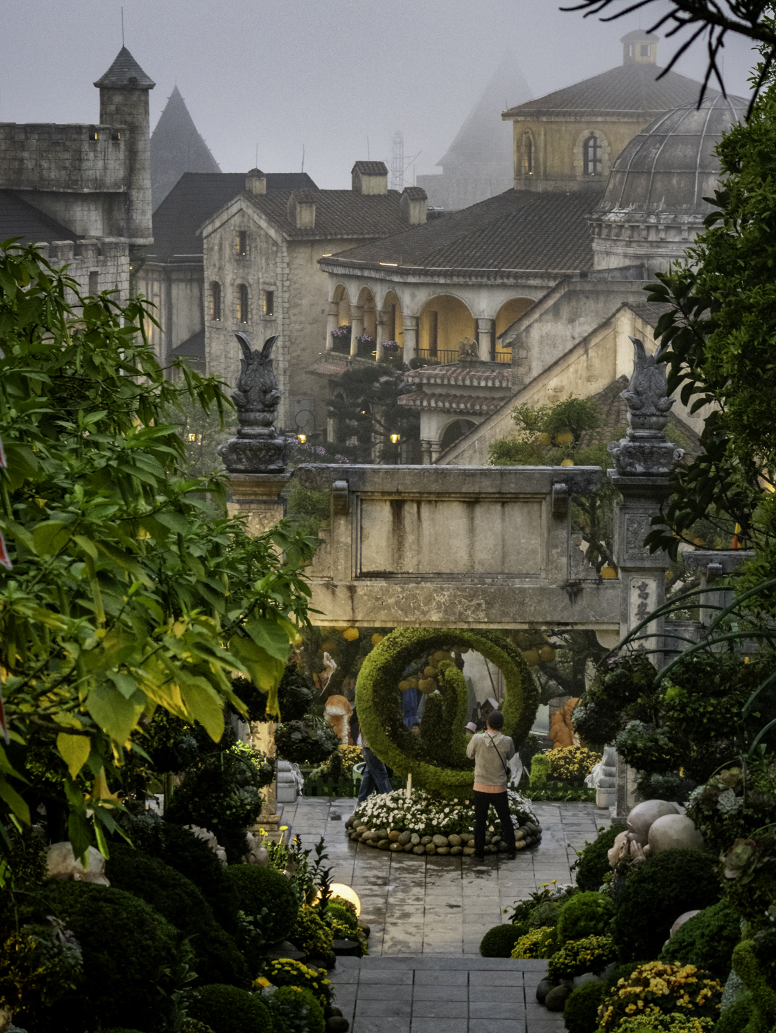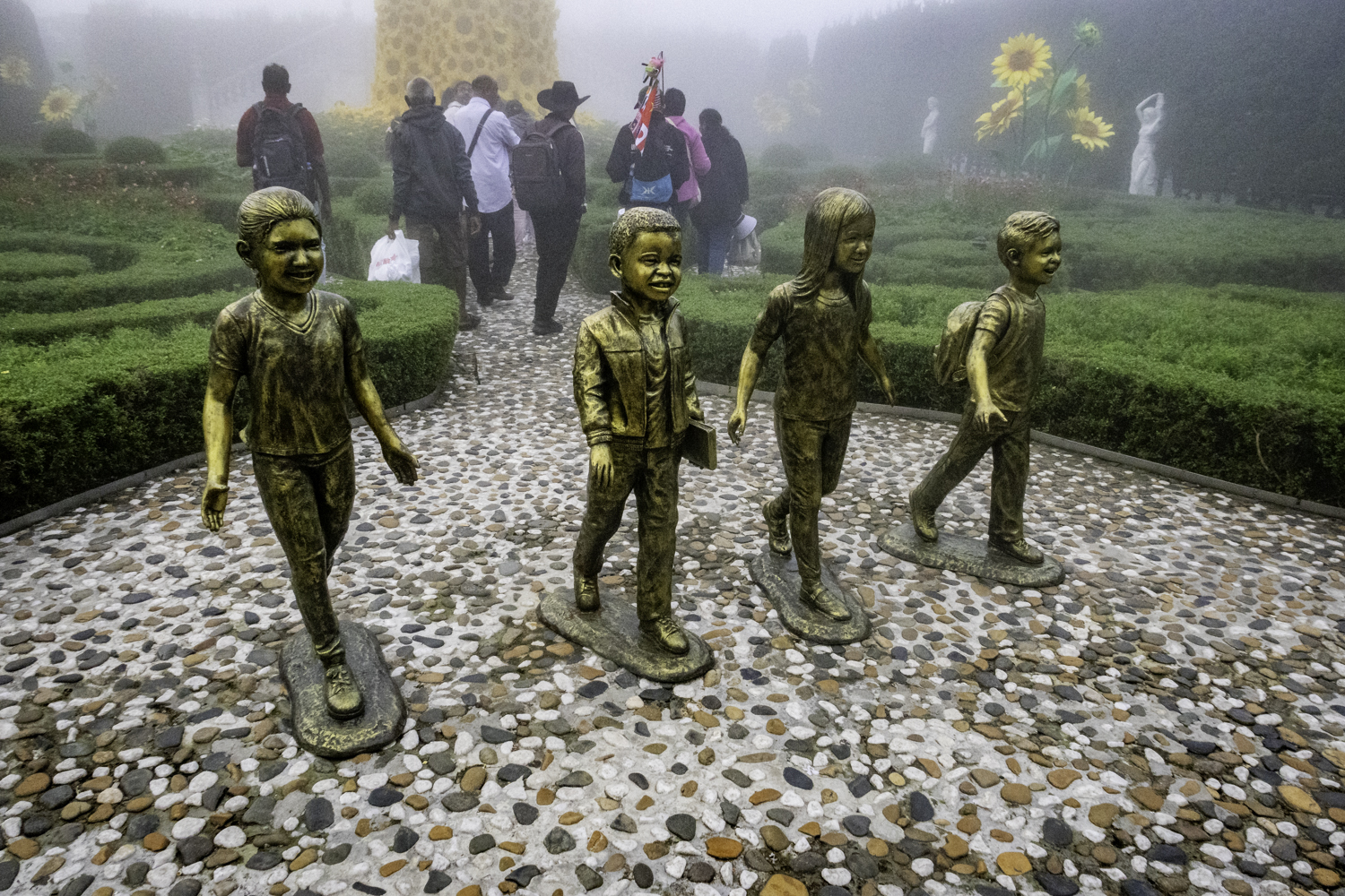 Hwan leads us up and up and tells us to keep going up. We go up the path and find pagodas and views to excite our cameras again. It seems odd to be in the top of a Chinese building looking down on medieval Europe!  This is an amusement park built amongst a (fake) French Village on top of a mountain reached by one of the longest cable car’s in the world.  Keeping it’s original theme of when the hill station was a resort for French tourists back in the Colonial days.  It’s a hugely popular destination for families – a Medieval castle, cobblestone paths, a Neo-Classical cathedral, manicured gardens and (for the parents) a beer garden.  There’s a wax museum, an “Alpine Coaster” ride, an underground amusement park with rides and shows, countless restaurants and food stalls.