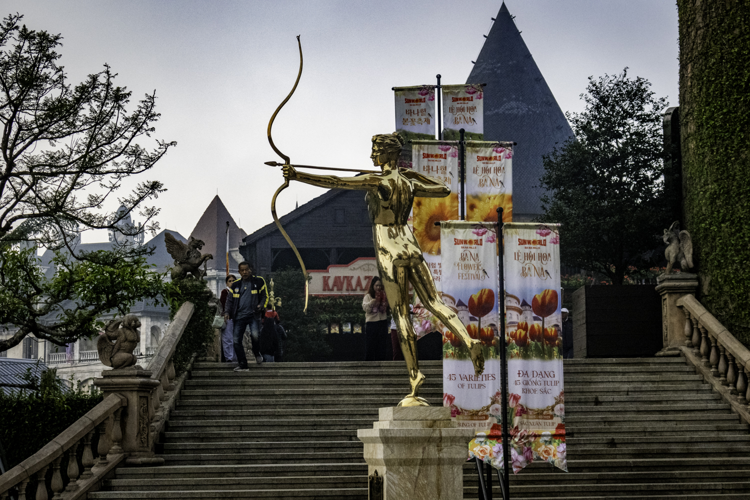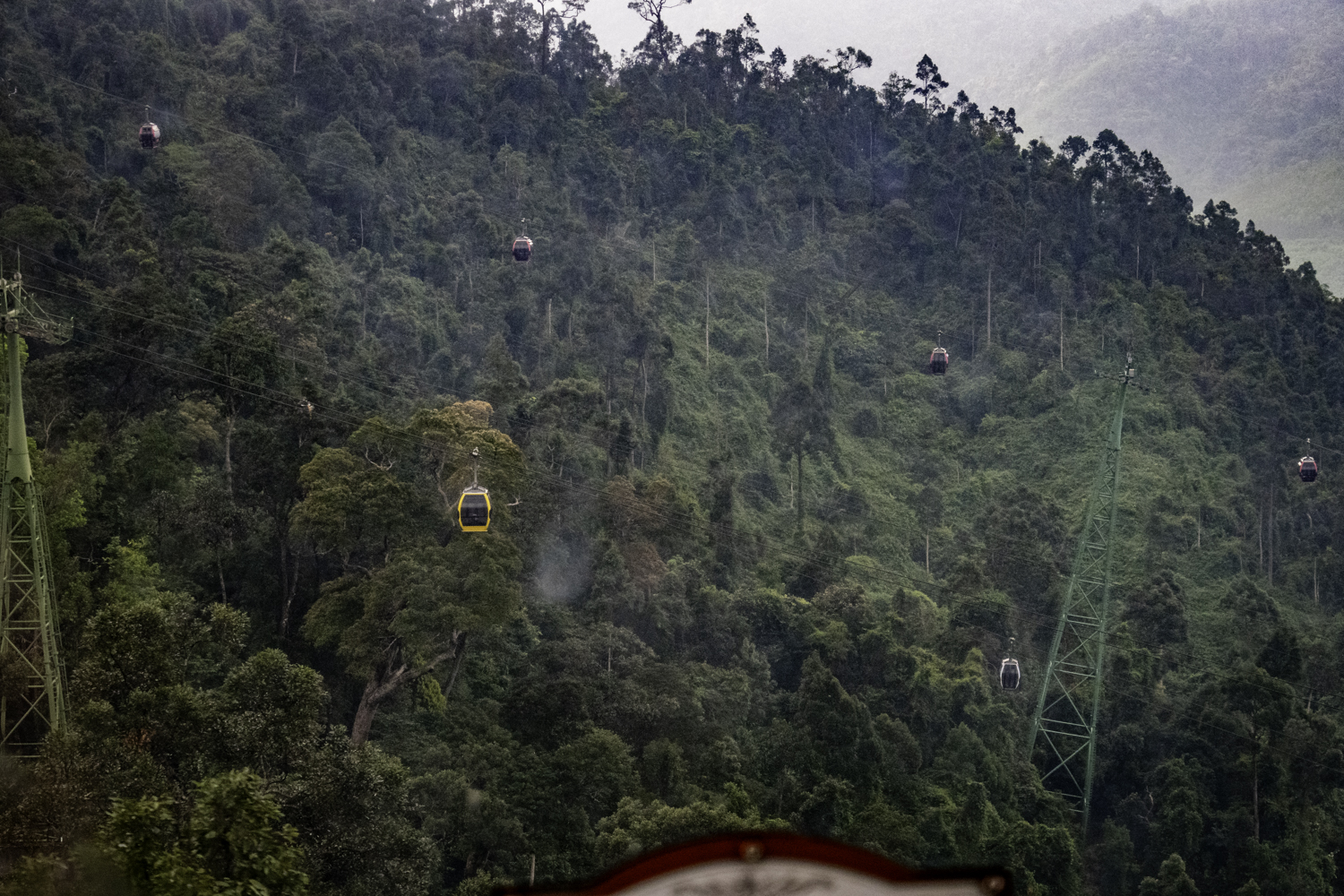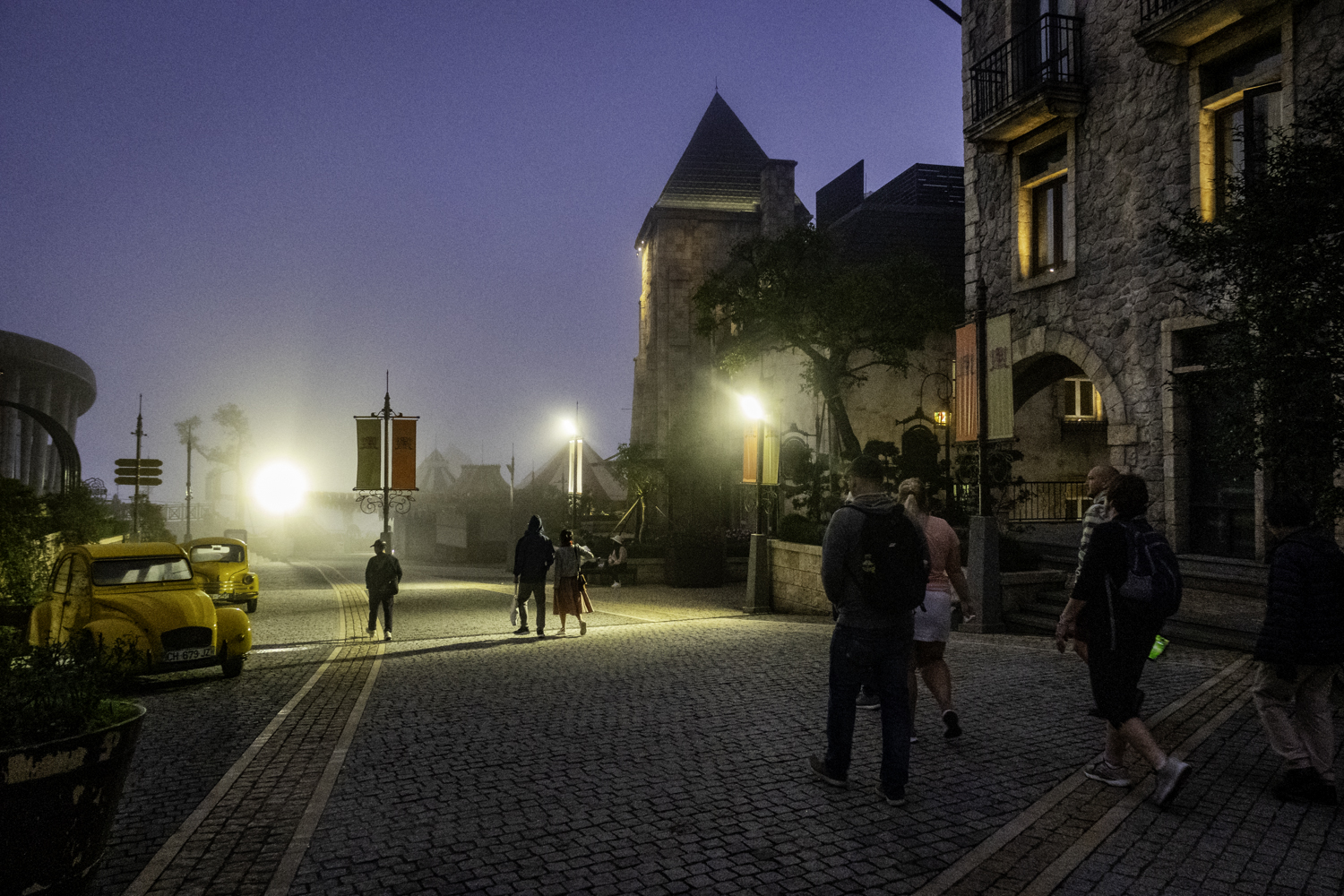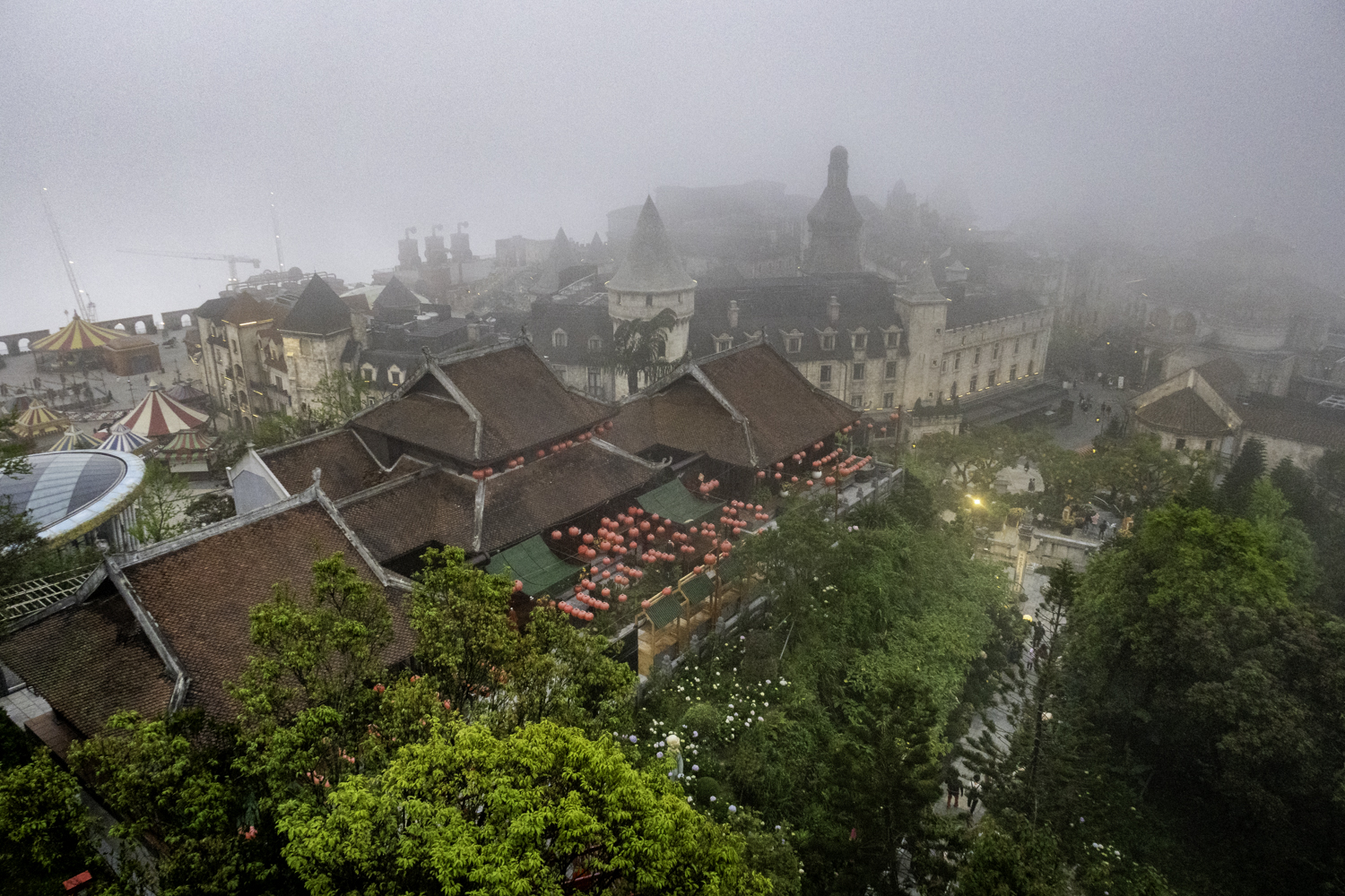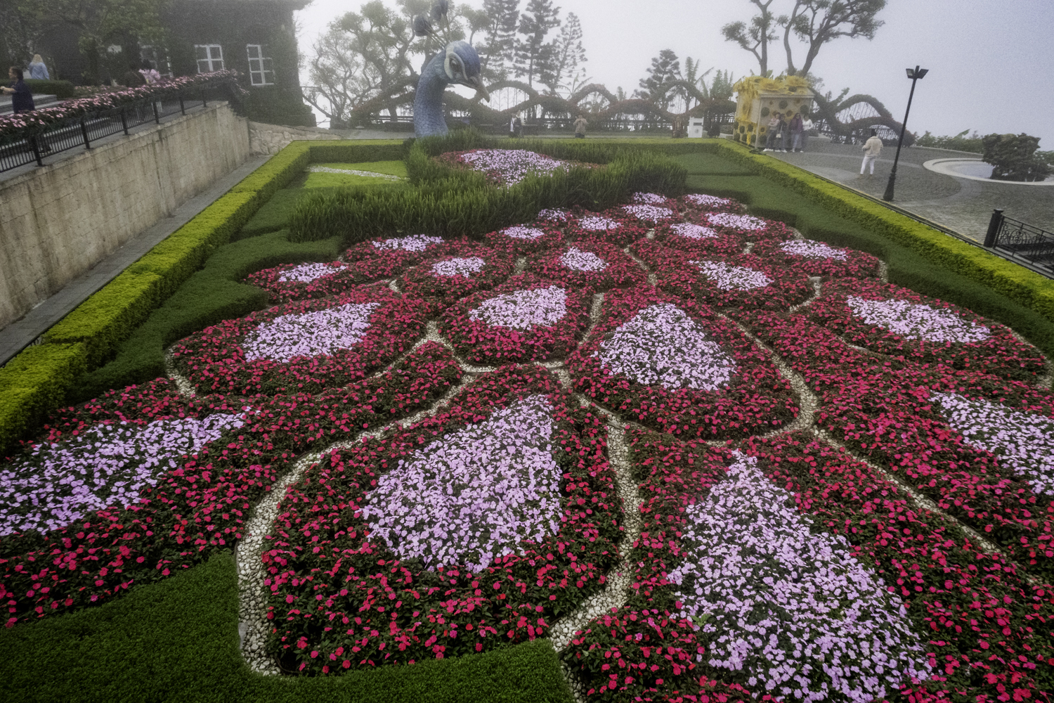 Hwan leads us up and up and tells us to keep going up. We go up the path and find pagodas and views to excite our cameras again. It seems odd to be in the top of a Chinese building looking down on medieval Europe!  This is an amusement park built amongst a (fake) French Village on top of a mountain reached by one of the longest cable car’s in the world.  Keeping it’s original theme of when the hill station was a resort for French tourists back in the Colonial days.  It’s a hugely popular destination for families – a Medieval castle, cobblestone paths, a Neo-Classical cathedral, manicured gardens and (for the parents) a beer garden.  There’s a wax museum, an “Alpine Coaster” ride, an underground amusement park with rides and shows, countless restaurants and food stalls.