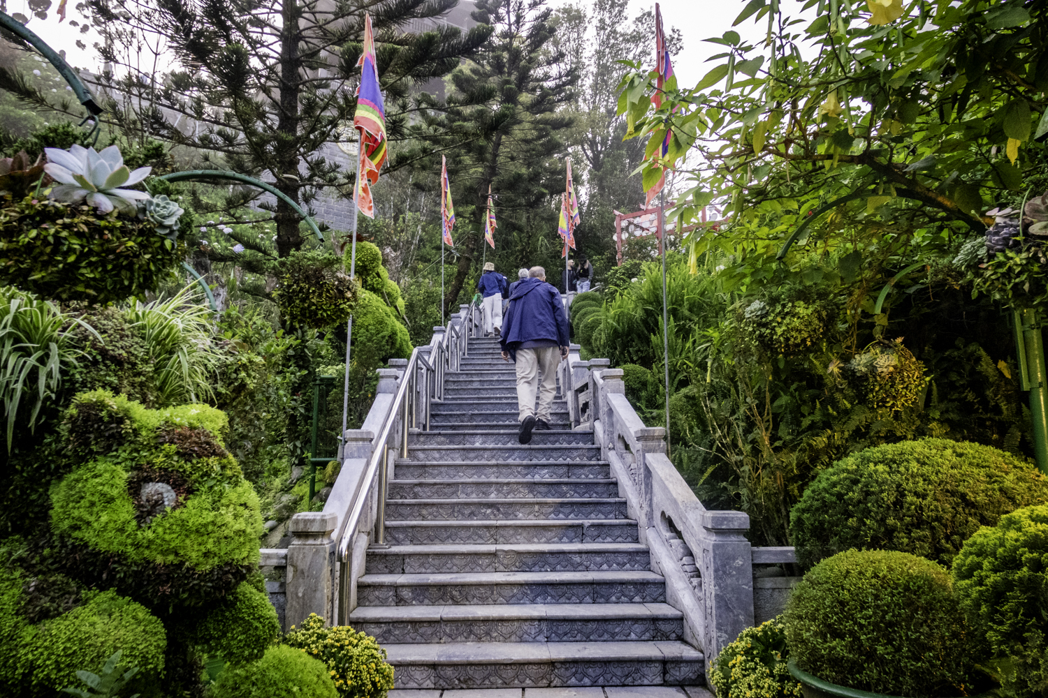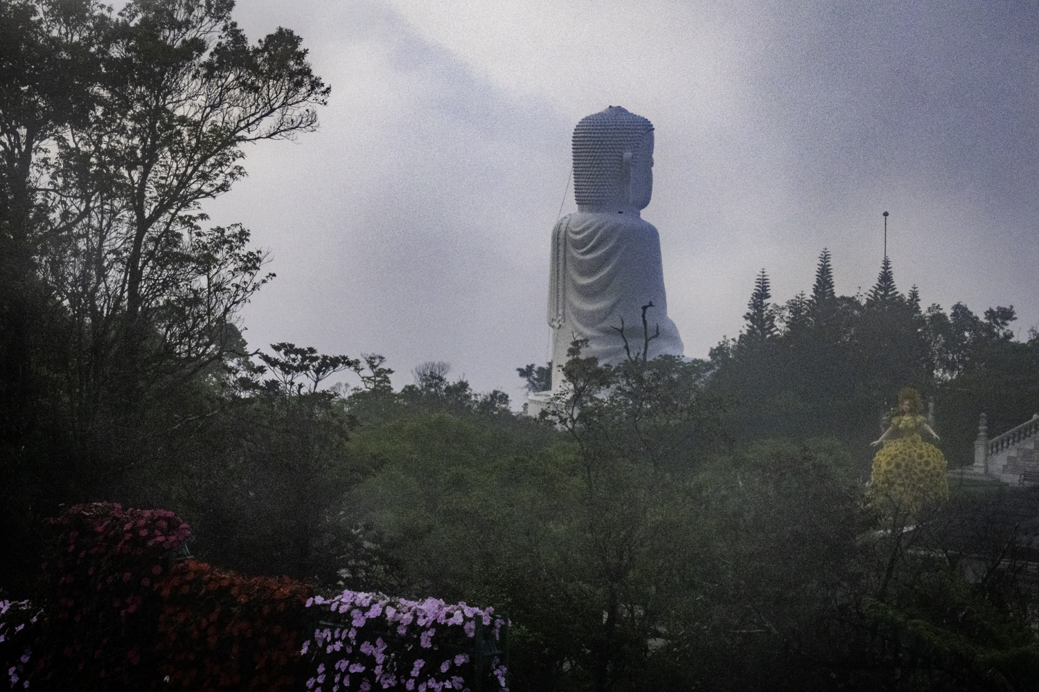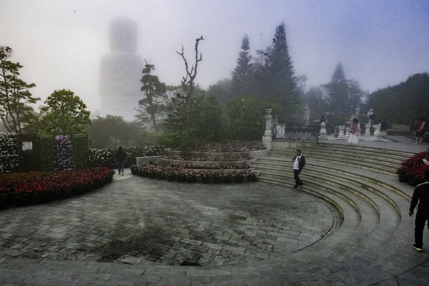 We spend most of an hour on the bridge and our cameras finally relinquish control to us. But we have been teased again! Off in the fog, we have spotted a tall Budda statue and we are off in search of more camera entertainment. Another mile of path brings us to the Budda statue after trekking through displays and the Heavenly Garden that would make Walt Disney proud! Everything is a bit surreal in the fog!